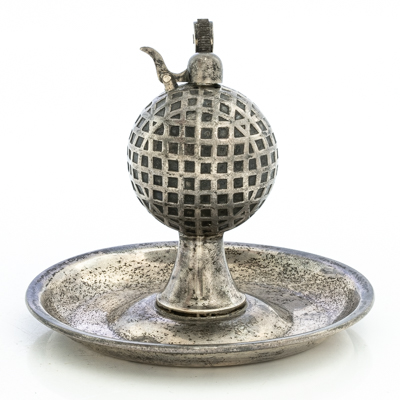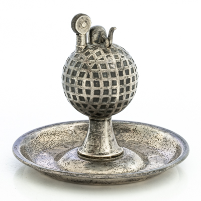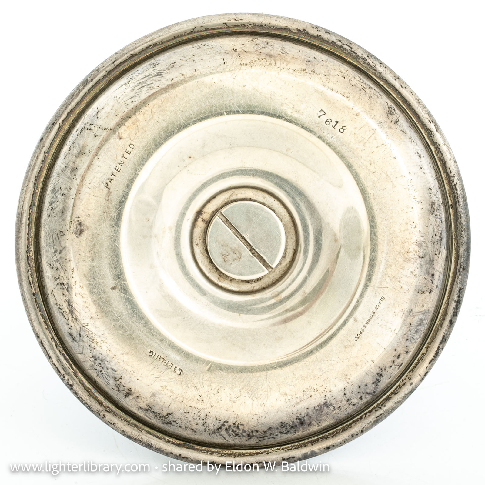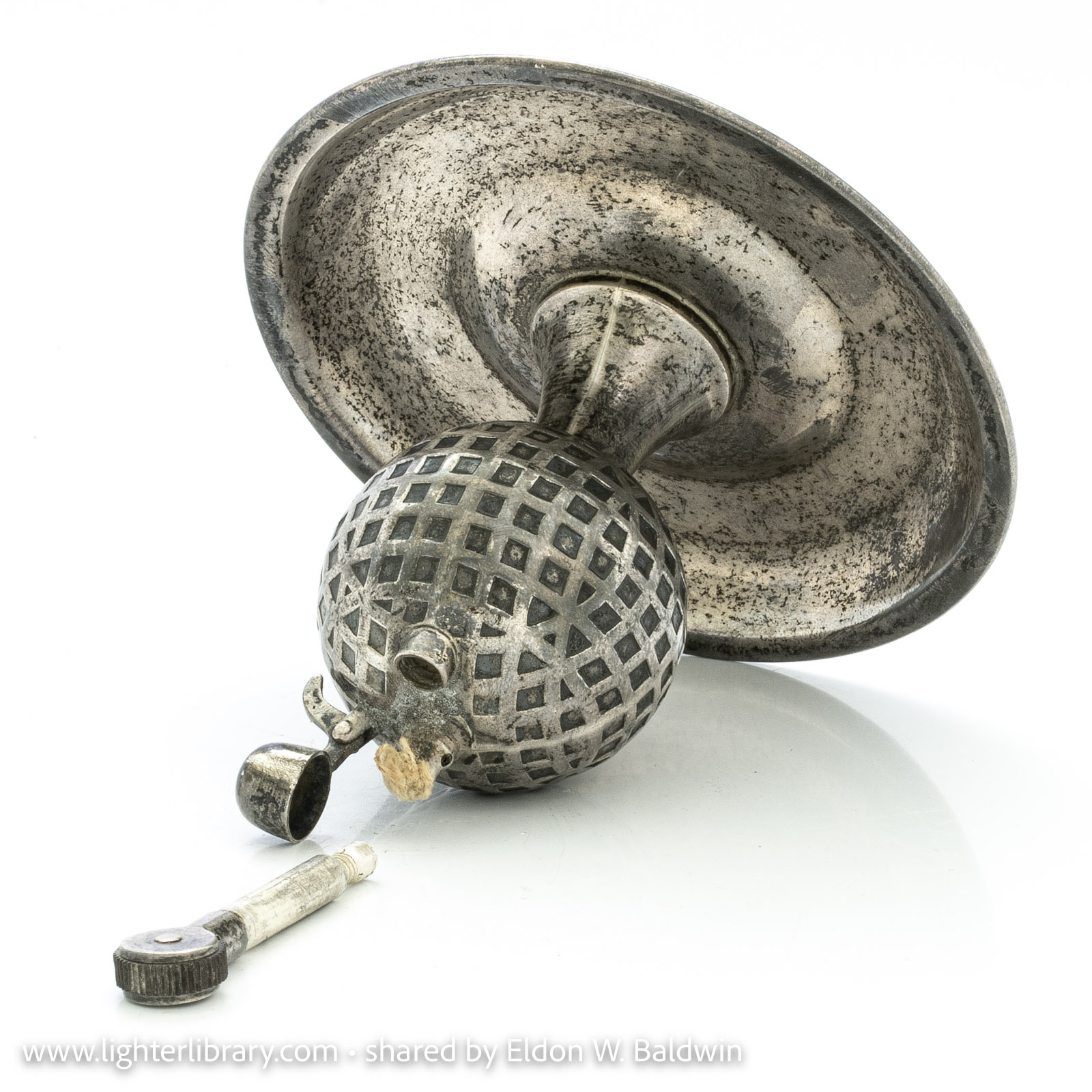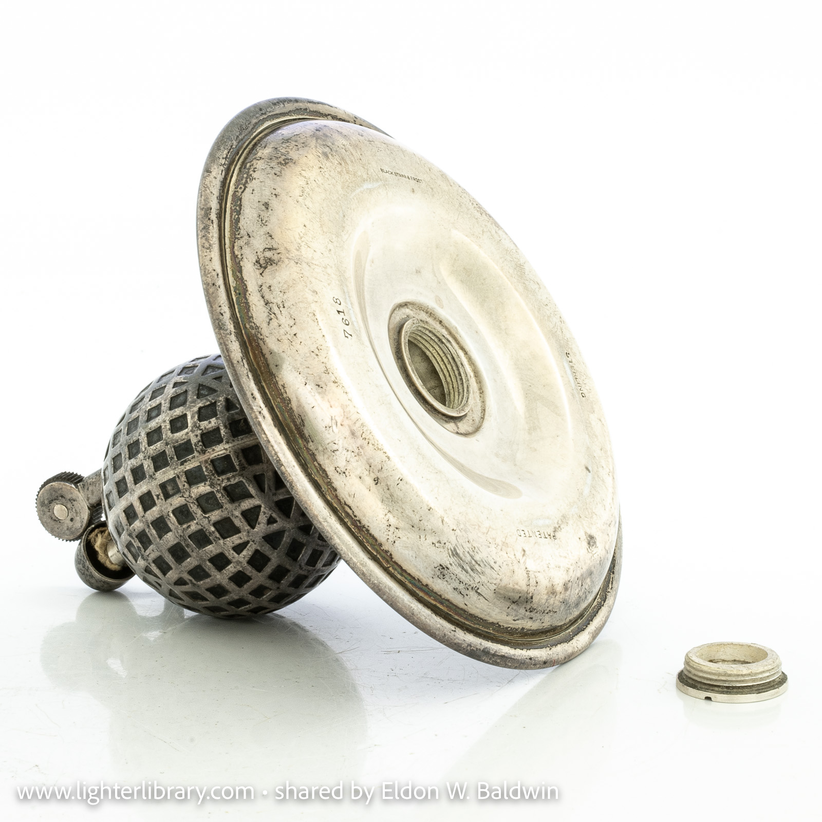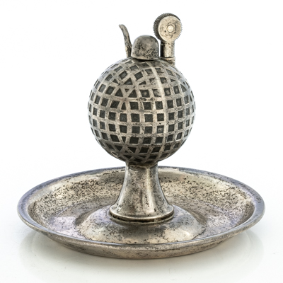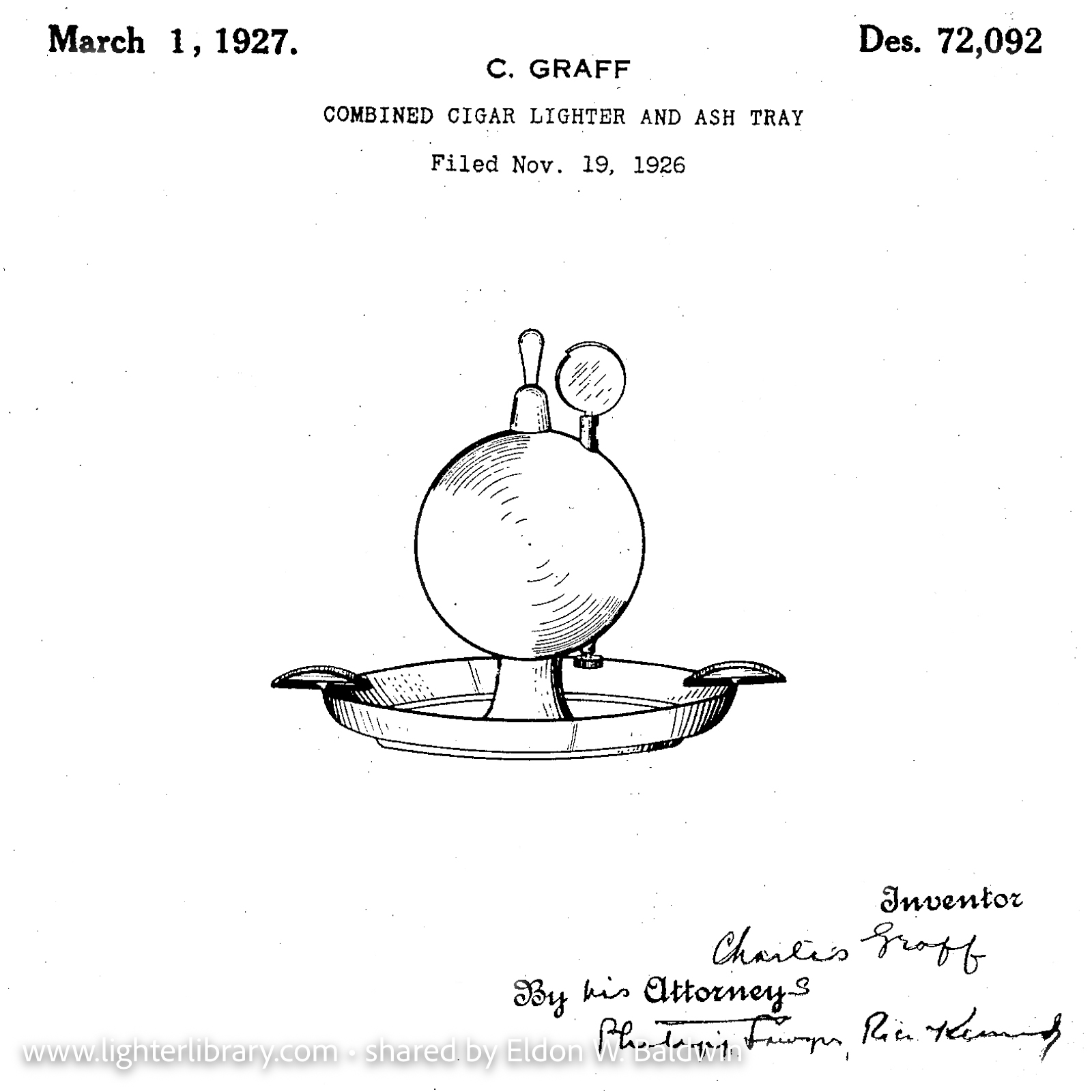Originally founded in 1810, Black, Starr & Frost (BS&F) is the oldest continuously operating jewelry firm in the United States according to the Wall Street Journal. Its sterling silver golf-themed lighter was designed by Charles Graff in 1926. The Graff patent describes his design as a peculiar shaped, ornamental combined cigar lighter and ashtray. Cleverly adapted to evoke a golf ball on a tee, the BS&F production model utilizes a removable thumbwheel striking mechanism instead of the fixed type depicted in the patent drawing.