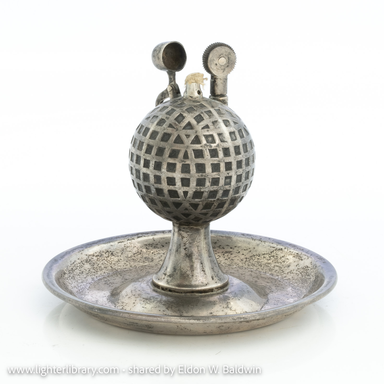 Originally founded in 1810, Black, Starr & Frost (BS&F) is the oldest continuously operating jewelry firm in the United States according to the Wall Street Journal. Its sterling silver golf-themed lighter was designed by Charles Graff in 1926. The Graff patent describes his design as a peculiar shaped, ornamental combined cigar lighter and ashtray. Cleverly adapted to evoke a golf ball on a tee, the BS&F production model utilizes a removable thumbwheel striking mechanism instead of the fixed type depicted in the patent drawing.