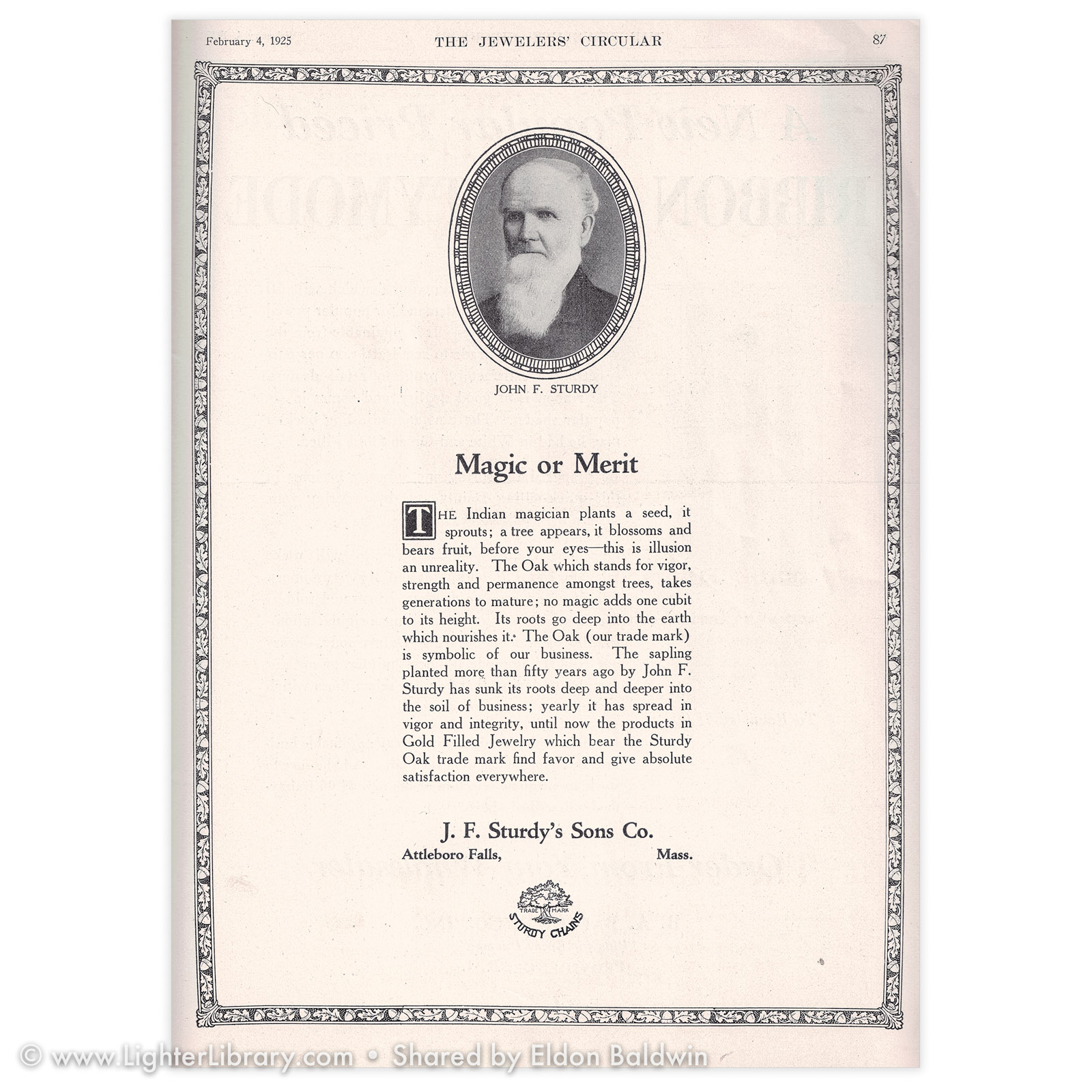 Established by company namesake in 1865, John F. Sturdy turned the business over to his three sons upon retirement in 1892. Best known for manufacturing jewelry grade chains and bracelets, The Sturdy Lighter is the only known pyrophoric device the company produced. Patented by George Kollstede in 1928, this windproof design uses a finely crafted semi-automatic firing mechanism that is very simple to operate. It was offered in two sizes with plain, engine-turned and covered finishes. (EB)