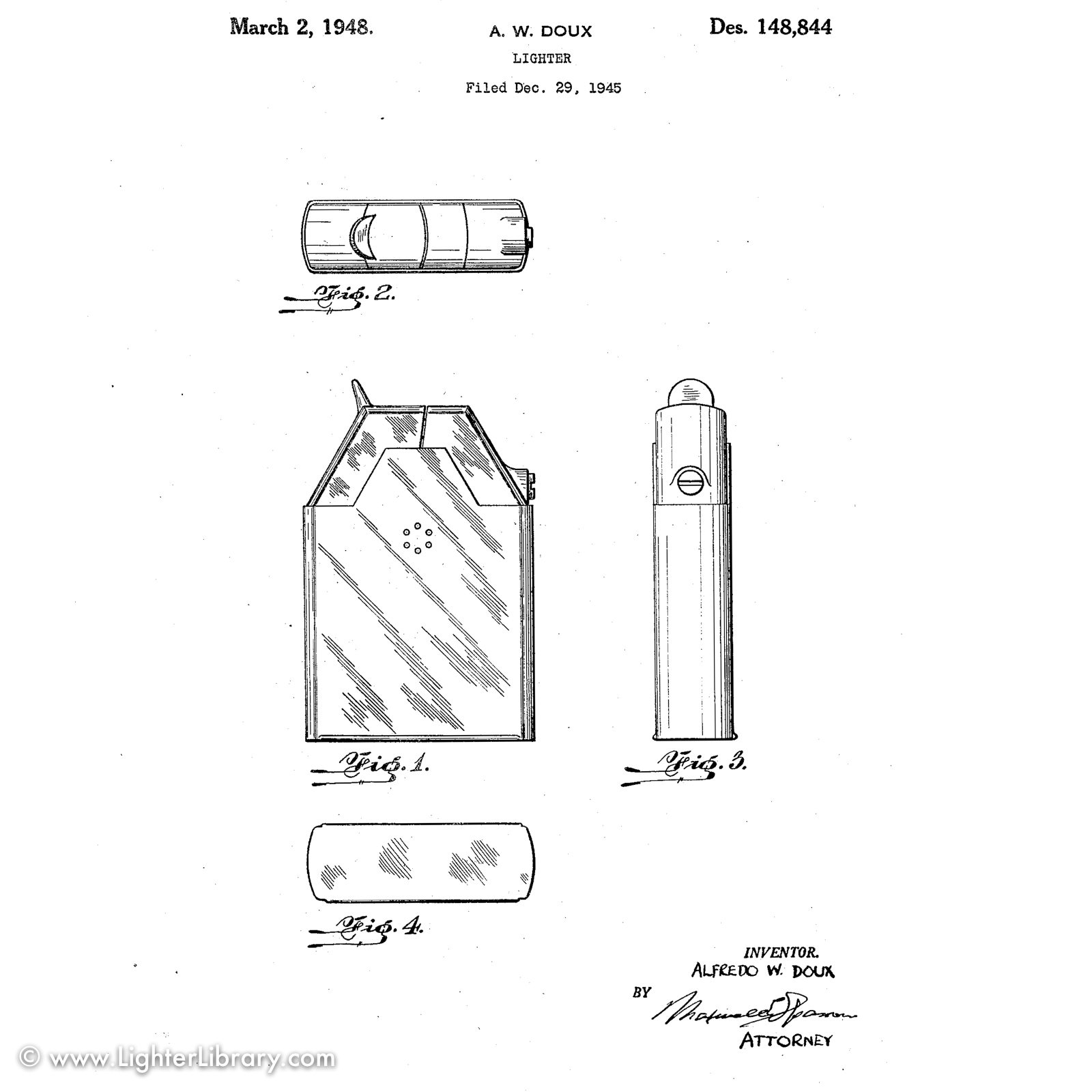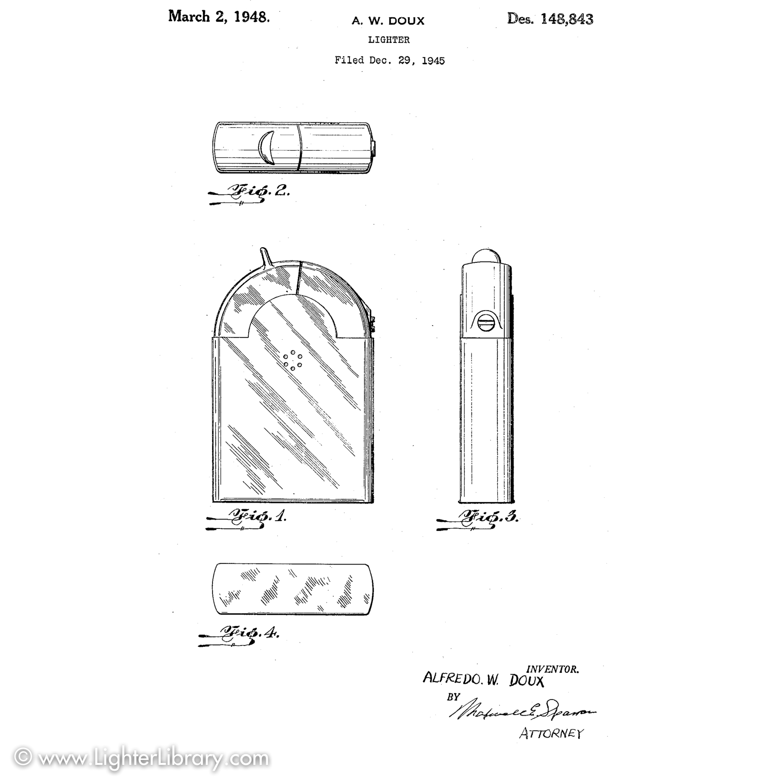 Snap-Lite was established on July 24, 1945 by Brazilian and French citizens—Alfredo W. Doux and Francis M. Heyberger. Doux filed the U.S. Trademark application for "SPEED" on August 3, 1945 and filed two U.S. Design Patents on December 29, 1945 (both are assigned to Snap-Lite Corp). The first Doux design patent features a round snuffer, mimicking the Kaschie K37. Doux's second design patent shows an angular snuffer shape, a copy of the Kaschie K36 likely not produced. The Speed Lighter was advertised in U.S. newspapers by late February 1946. (EB)