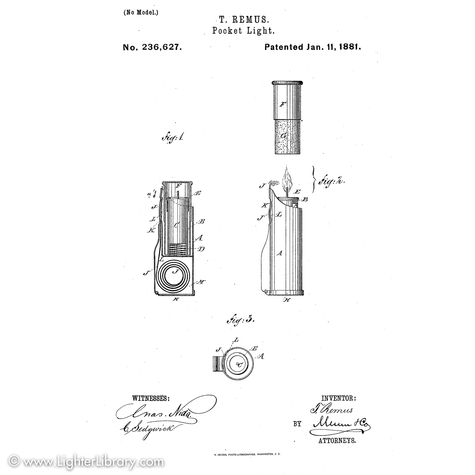 This patent for this "Remus" pre-flint device was applied for in Germany and the United States during November 1879, different versions of this device were produced in each country. The U.S. version of the Remus was manufactured in New York by American Light Co.