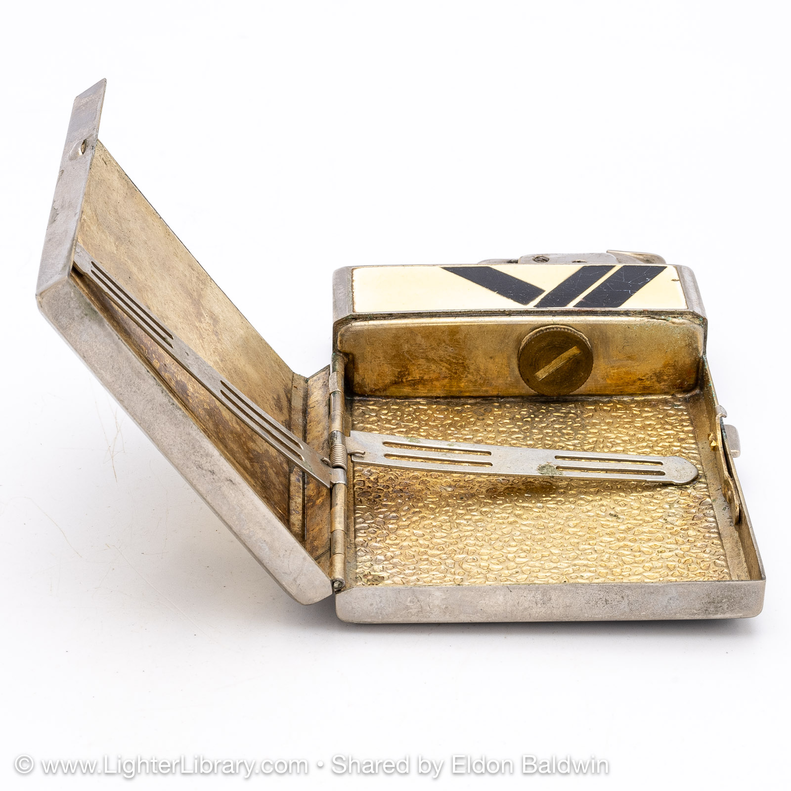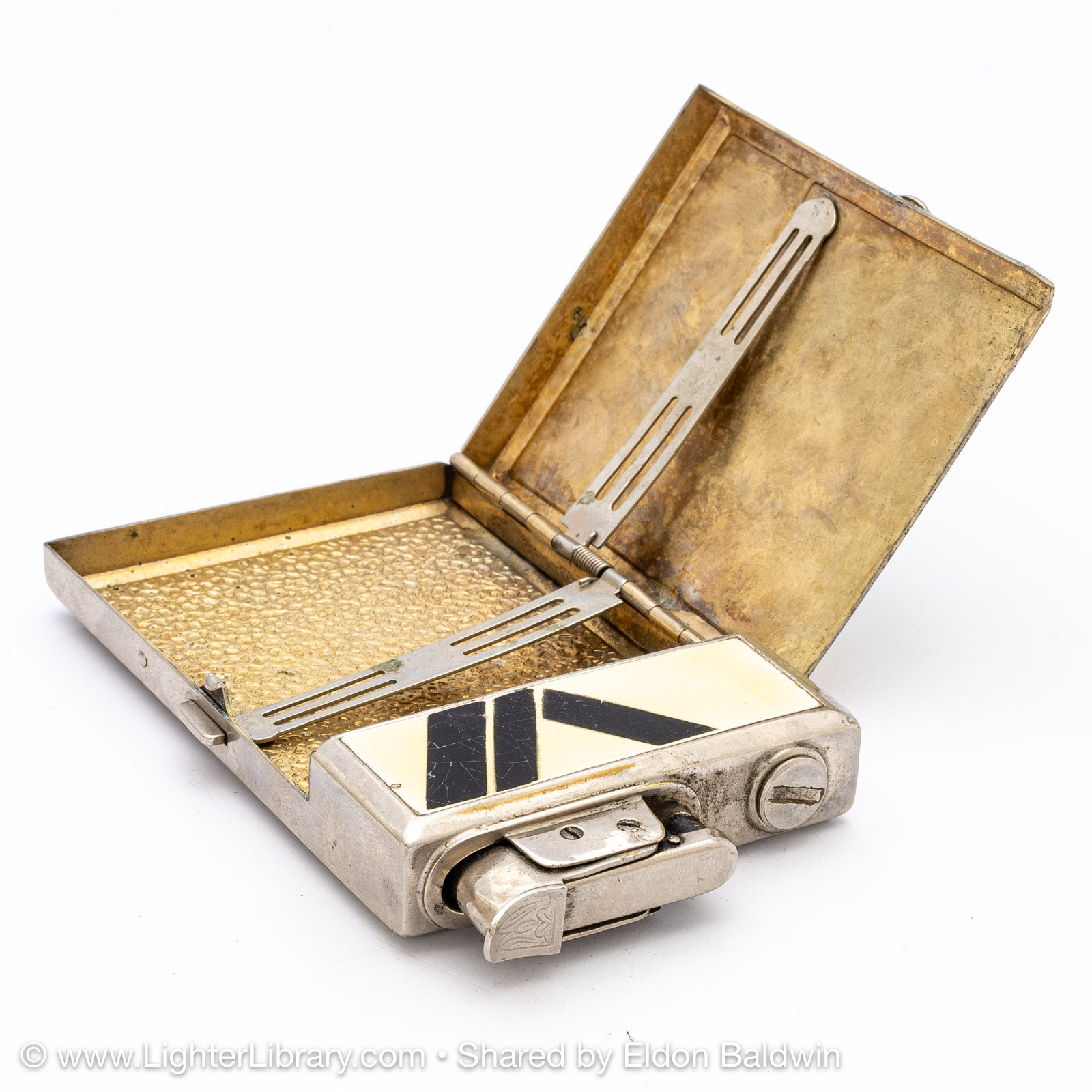 The first patent was filed in February 1932 but wasn't accepted for more than five years in May 1937. Fig.1 of the patent drawing shows a full automatic, enclosed thumb-press design that is quite similar to Evans Trig-A-Lite lighters. These 'De Luxe Golden Wheel lighters appear in 1933 advertising sold as smoking sets and lighter case combinations. Branded and unbranded examples are pictured here. The Fig.7 drawing shows a different Lederer model.