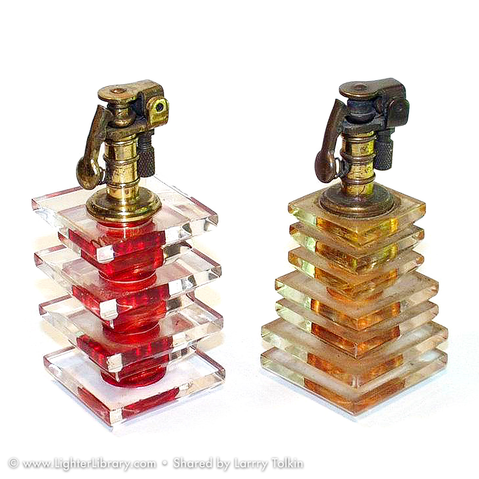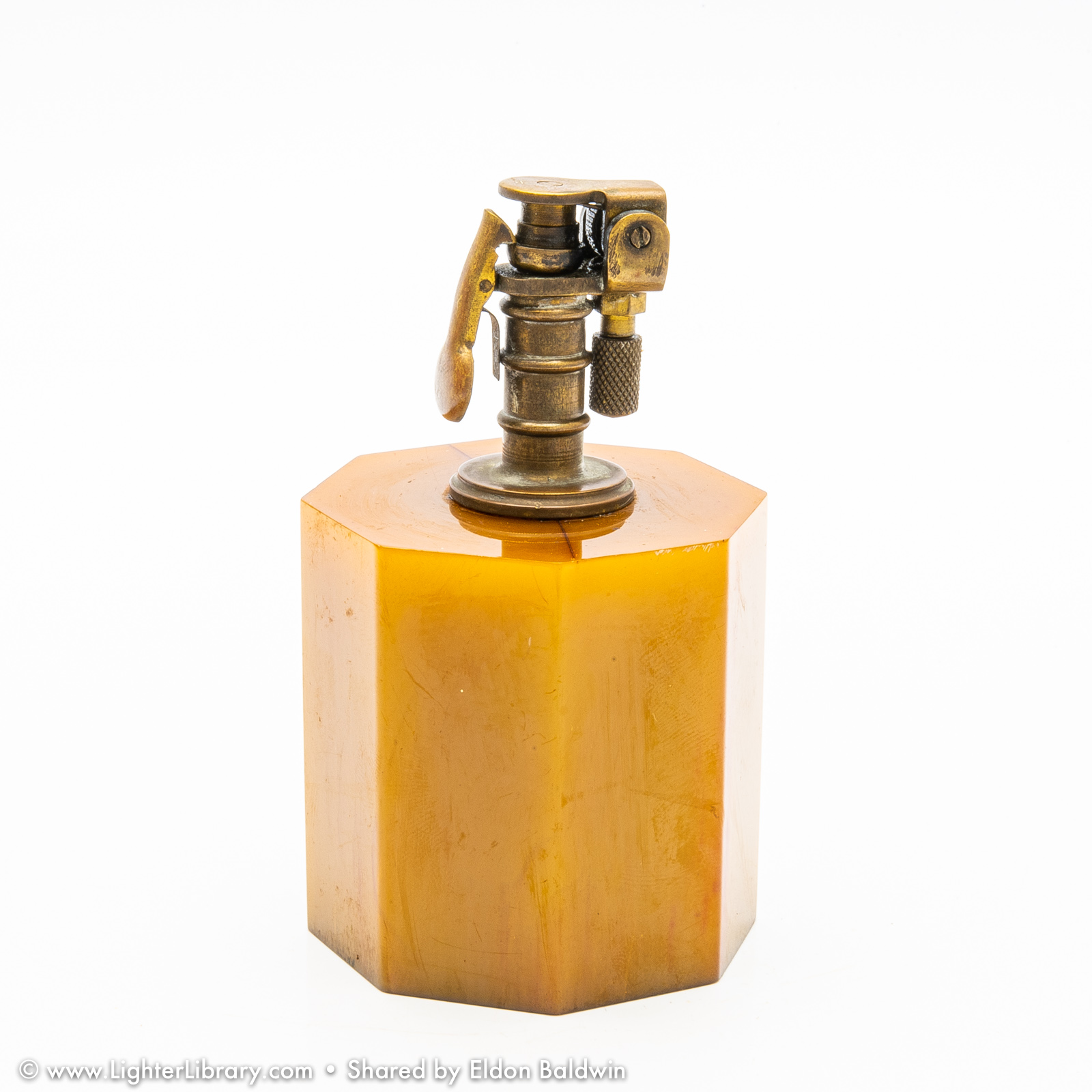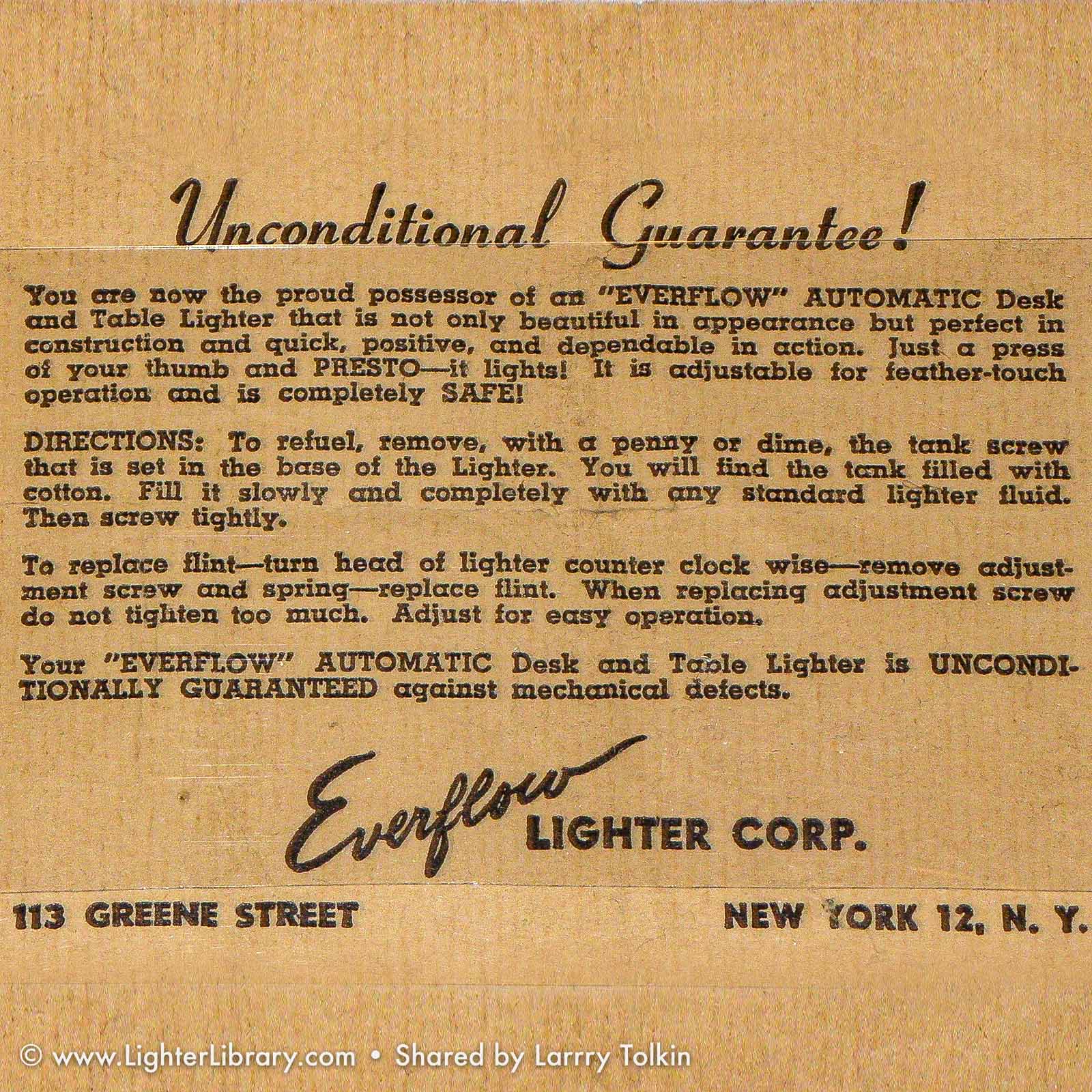 Everflow table lighters are a variation of the Quercia Eclair produced after World War 2 during the late '40s. Though based on Marcel Quercia's 1930 semi-automatic mechanism design, the Everflow uses a distinctive coil-type spring to actuate its mechanism. This is both a visible distinction for identification and a notable improvement to the original design. Everflow Lighters were only produced with plastic and wooden bases, all-metal designs were not offered. (EB)