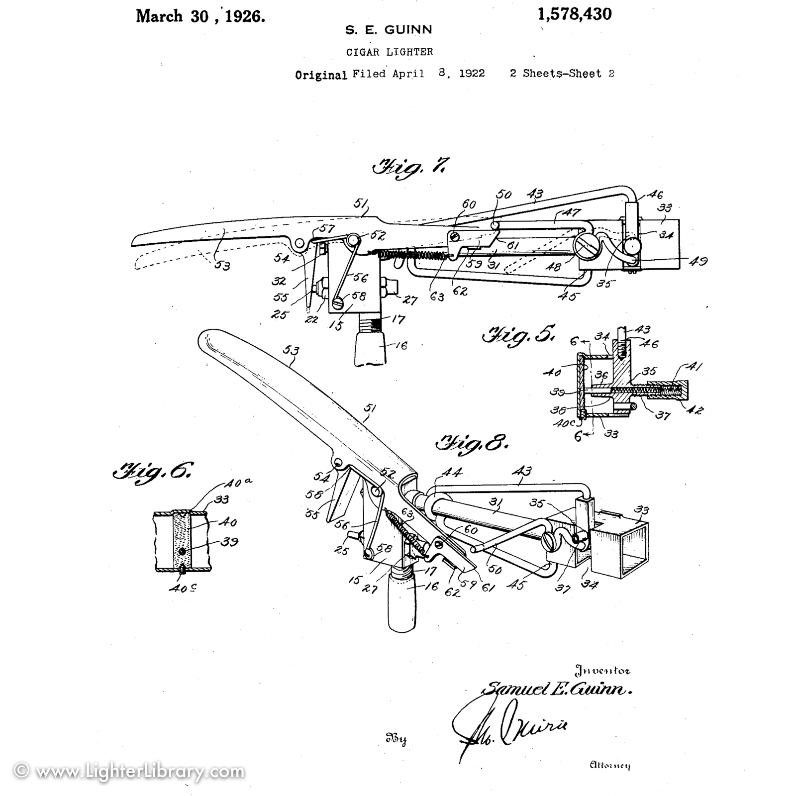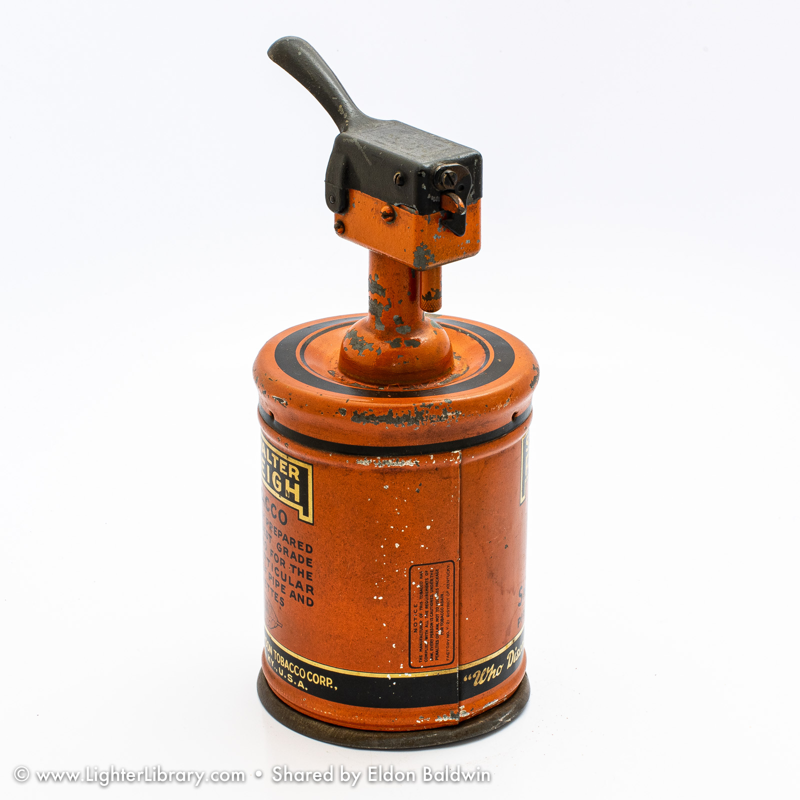 Originally patented as a gas device, Guinn later adapted his design to use the same petrol-based mechanisms as the Bell models. Intended to display advertising to retail customers, the Counter Cigar Lighter is the first of several commercial-use lighter designs patented by Guinn. The Sir Walter Raleigh Tobacco lighter is an example of a different advertising variation factory-tailored by Guinn for the Brown & Williamson Tobacco Corporation.