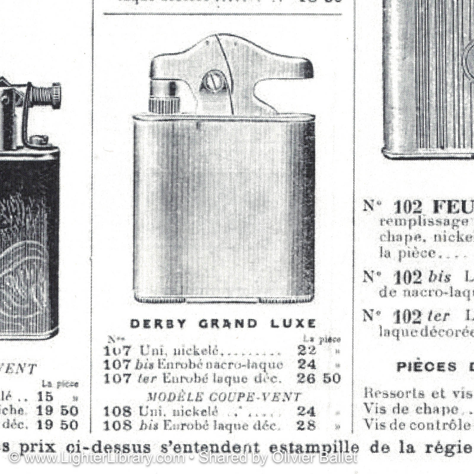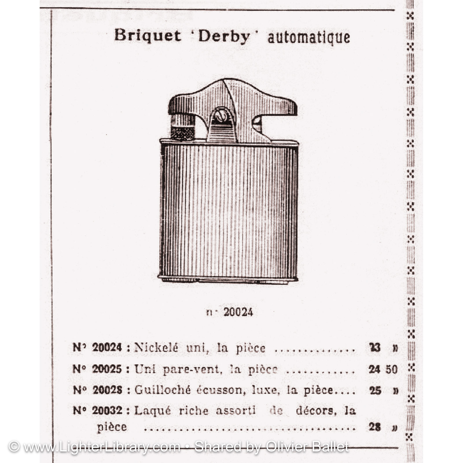 The Derby is a semi-automatic pocket lighter patented by Dr.Heinrich Kellermann in 1929. It was exported to England and sold using the names "Snaplite" and "Pluros". Japanese copies were also produced during the mid-1930s by Sakakura. (EB)