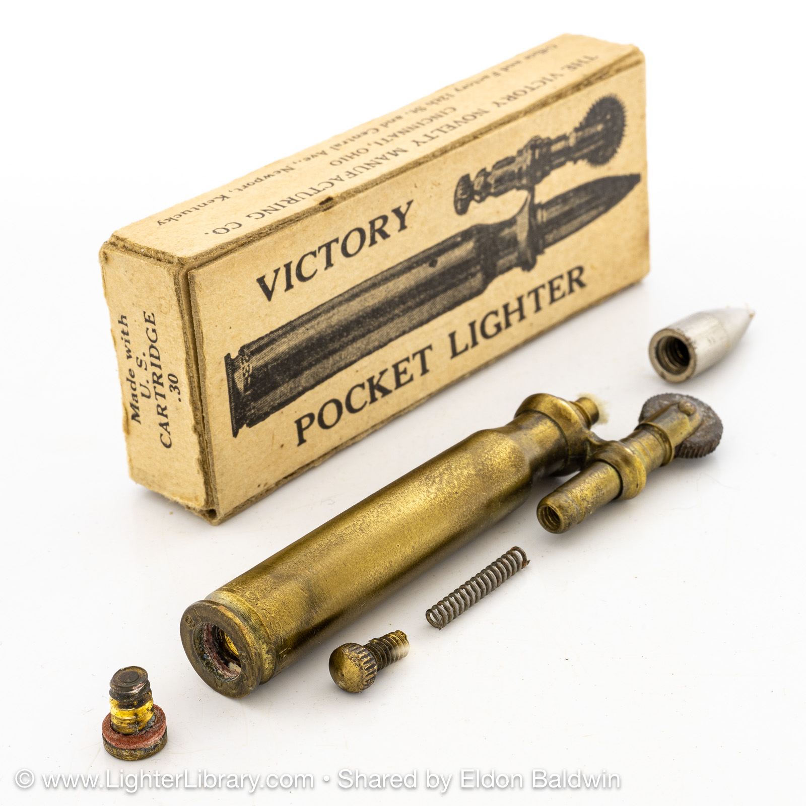 Manufactured using authentic .30 U.S. brass cartridge shells after World War 1, the Victory Pocket Lighter was patented by Maurice Ginsburg in 1919. Often misidentified as trench art or trench lighters, these lighters were manufactured in Newport, Kentucky. (EB)
