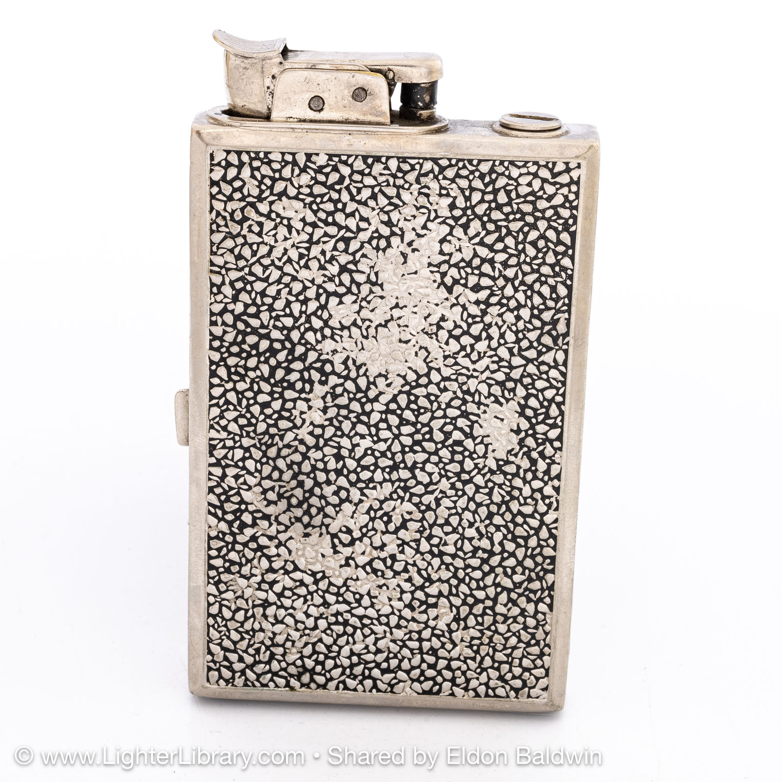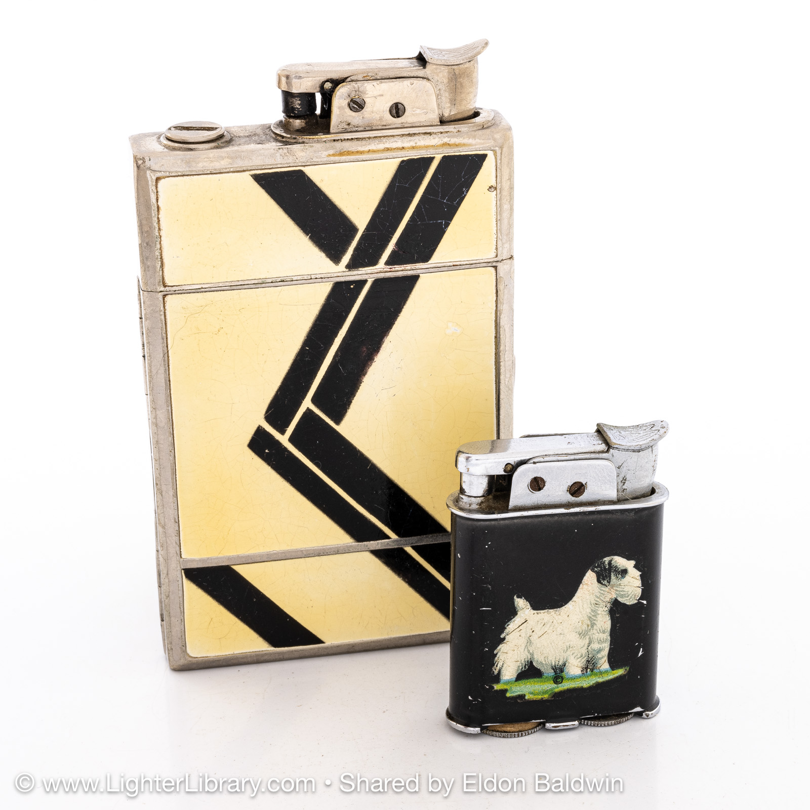 The first patent was filed in February 1932 but wasn't accepted for more than five years in May 1937. Fig.1 of the patent drawing shows a full automatic, enclosed thumb-press design that is quite similar to Evans Trig-A-Lite lighters. These 'De Luxe Golden Wheel lighters appear in 1933 advertising sold as smoking sets and lighter case combinations. Branded and unbranded examples are pictured here. The Fig.7 drawing shows a different Lederer model.