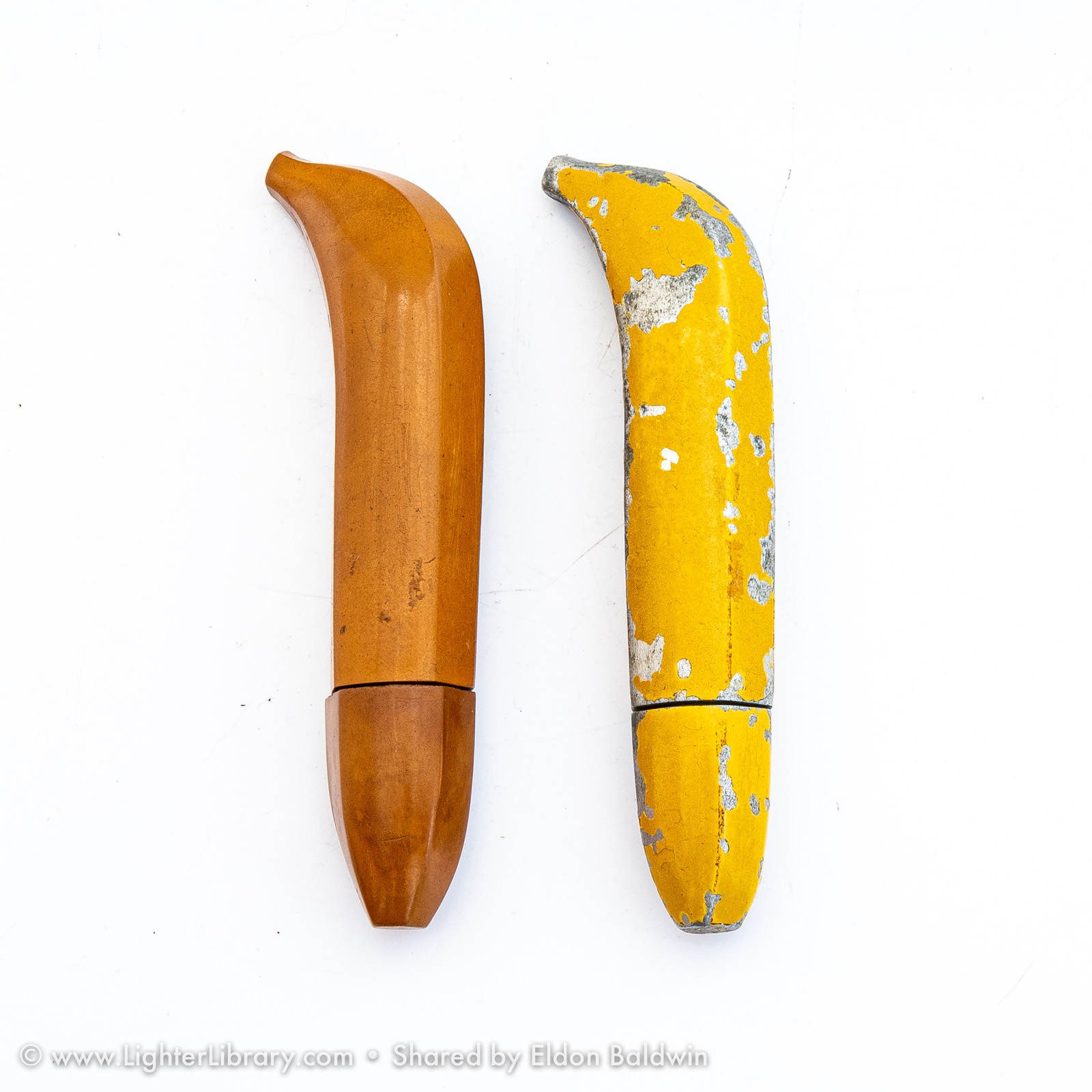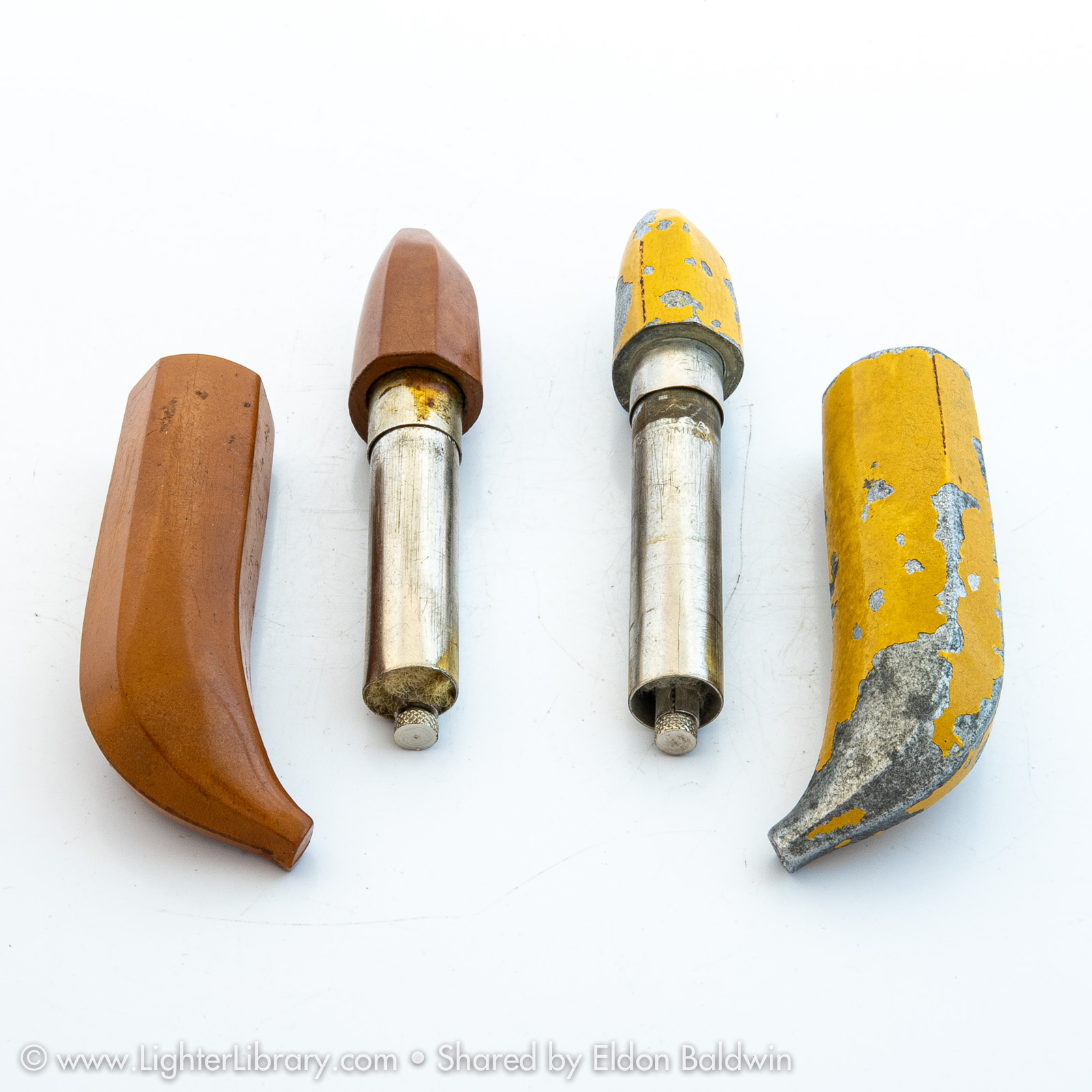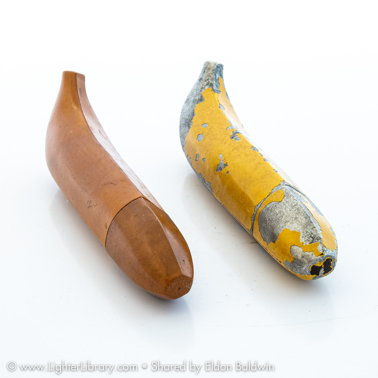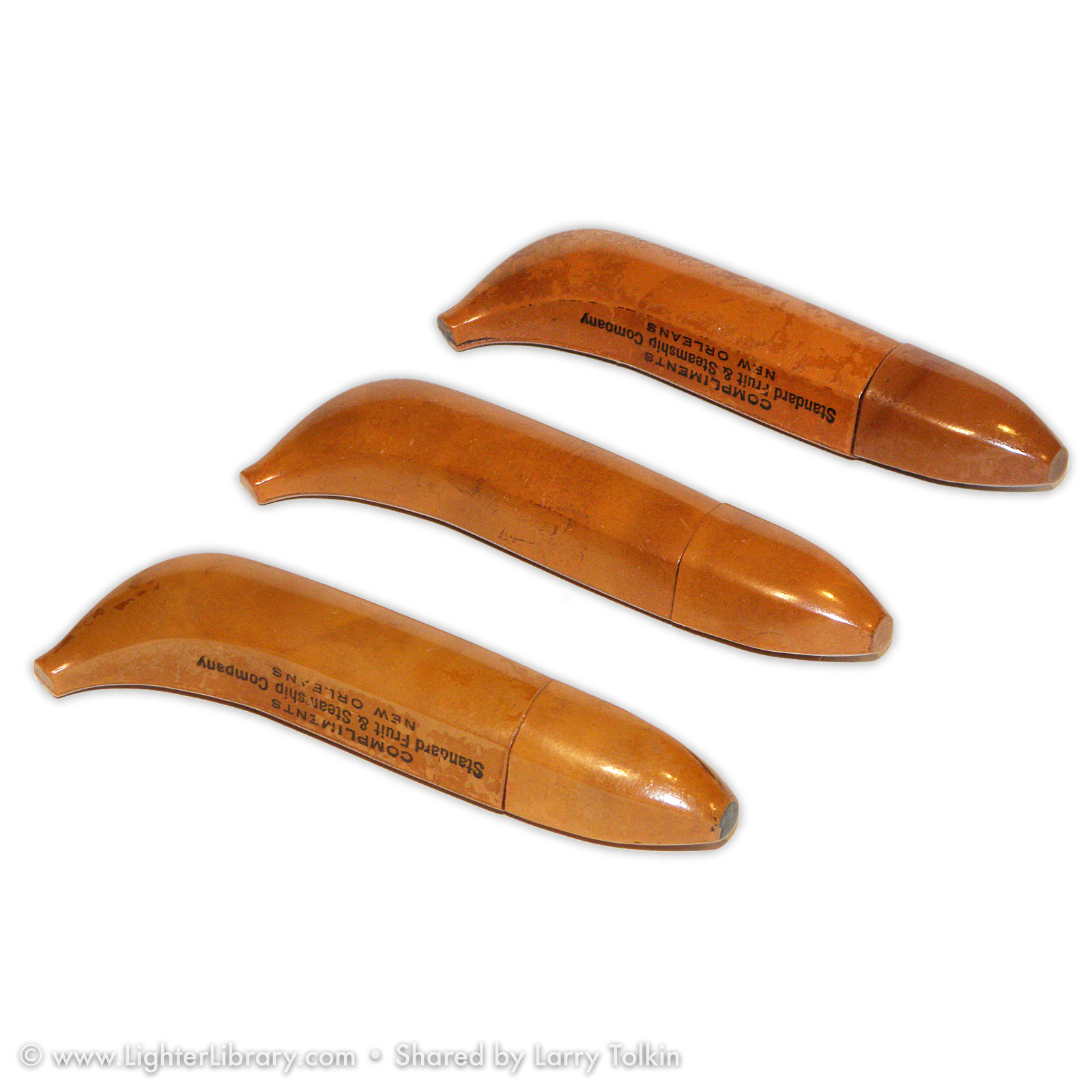 A figural variation that utilized the tube-shaped Redilite mechanism, these banana-shaped novelty lighters were produced in metal and bakelite plastic. Frequently marked “Compliments United Fruit and Steamship Company New Orleans”, Brown & Bigelow produced these figural promotional lighters for the United Fruit Company -- now known as Chiquita Brands. (EB)