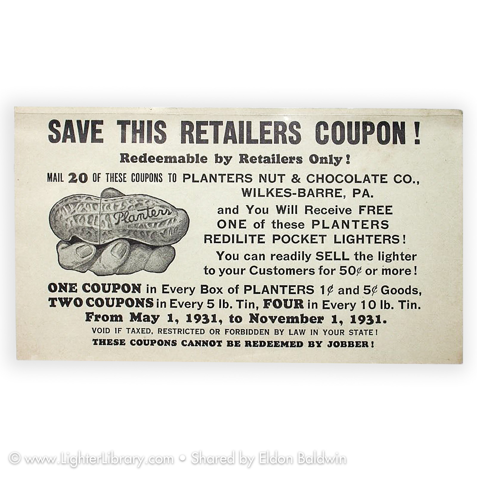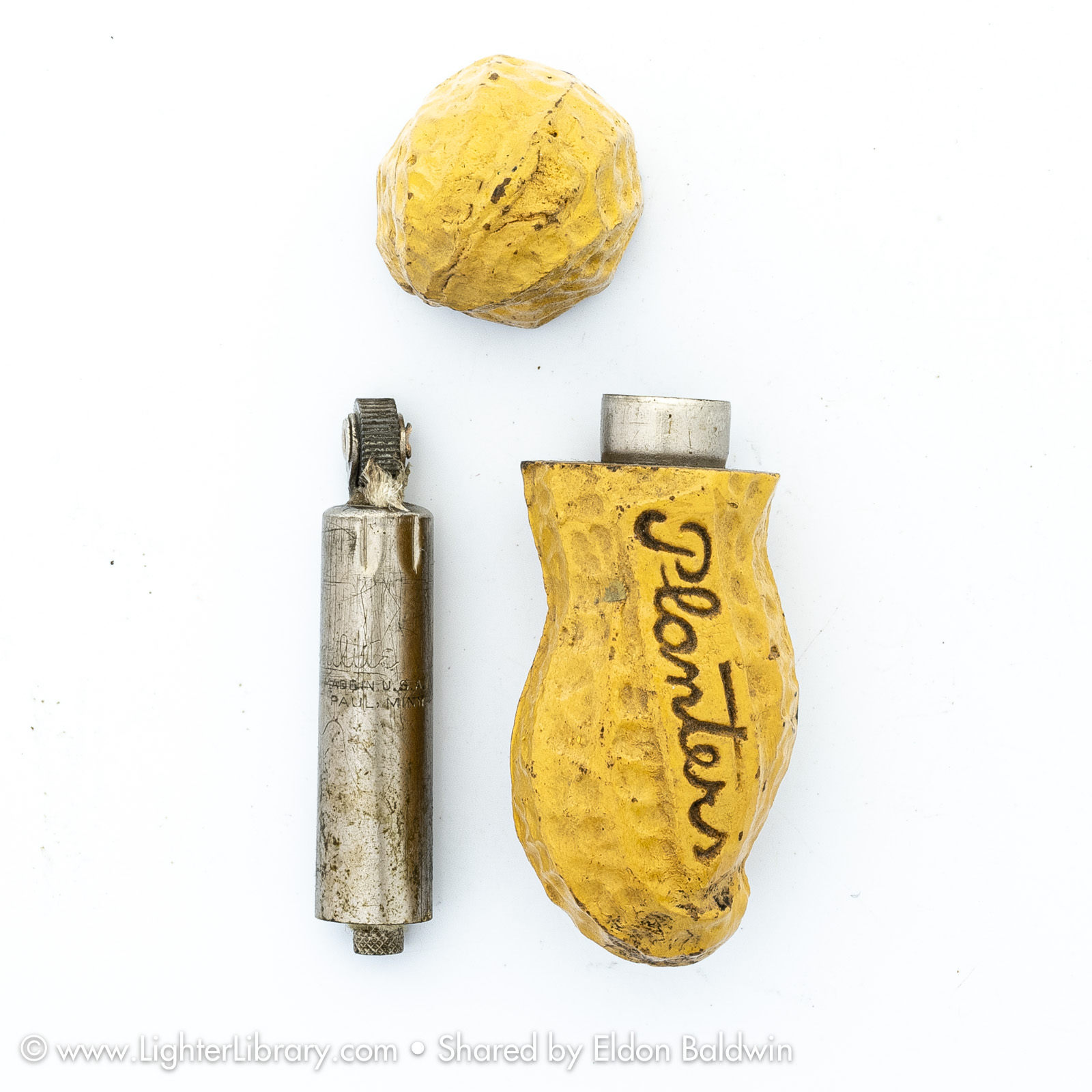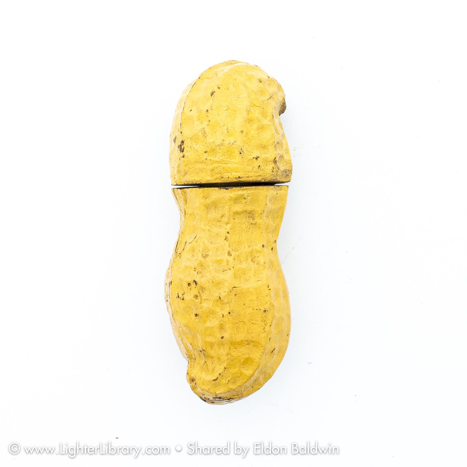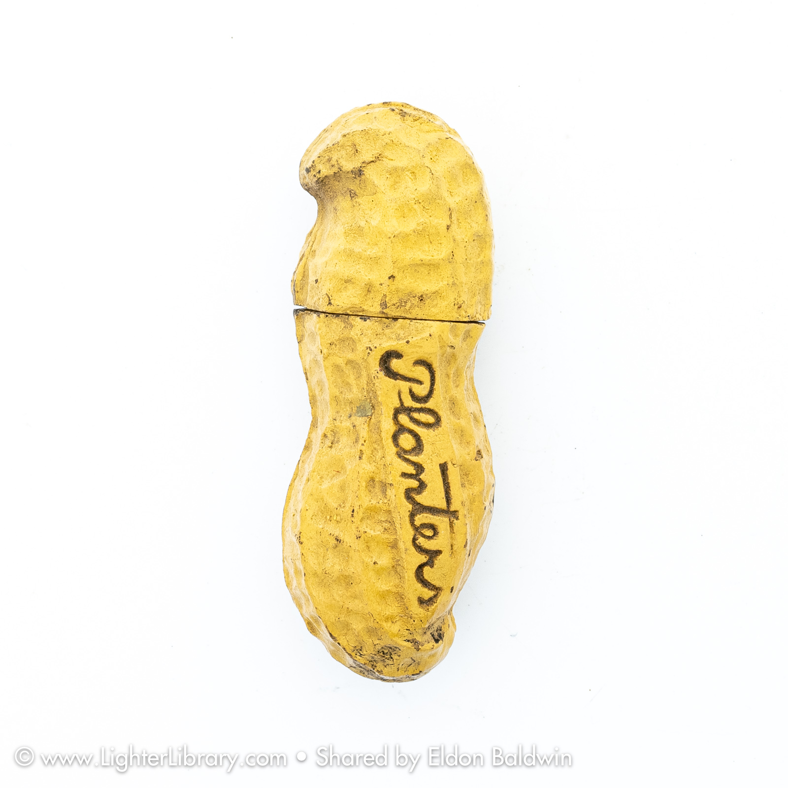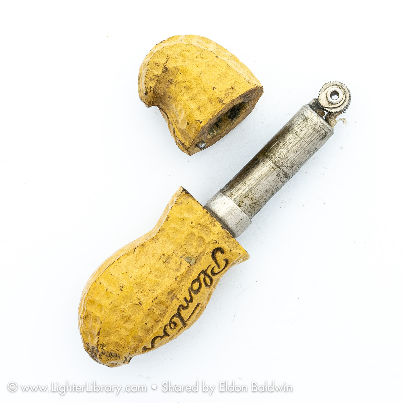 A figural advertising lighter that utilizes a Redilite mechanism, the peanut-shaped casing is made from painted wood. These lighters were produced for the Planters Nut and Chocolate Company during the early 1930s. (EB)