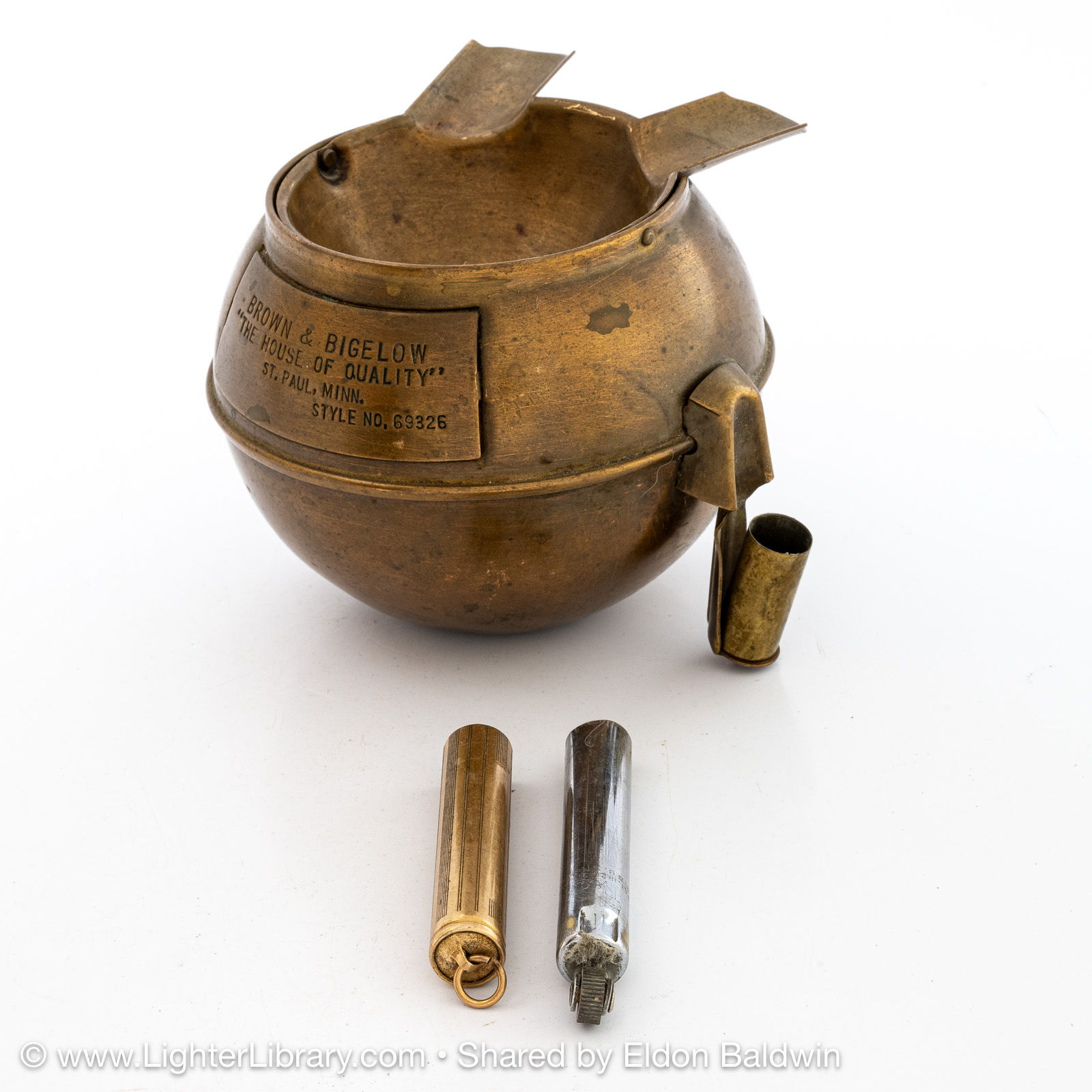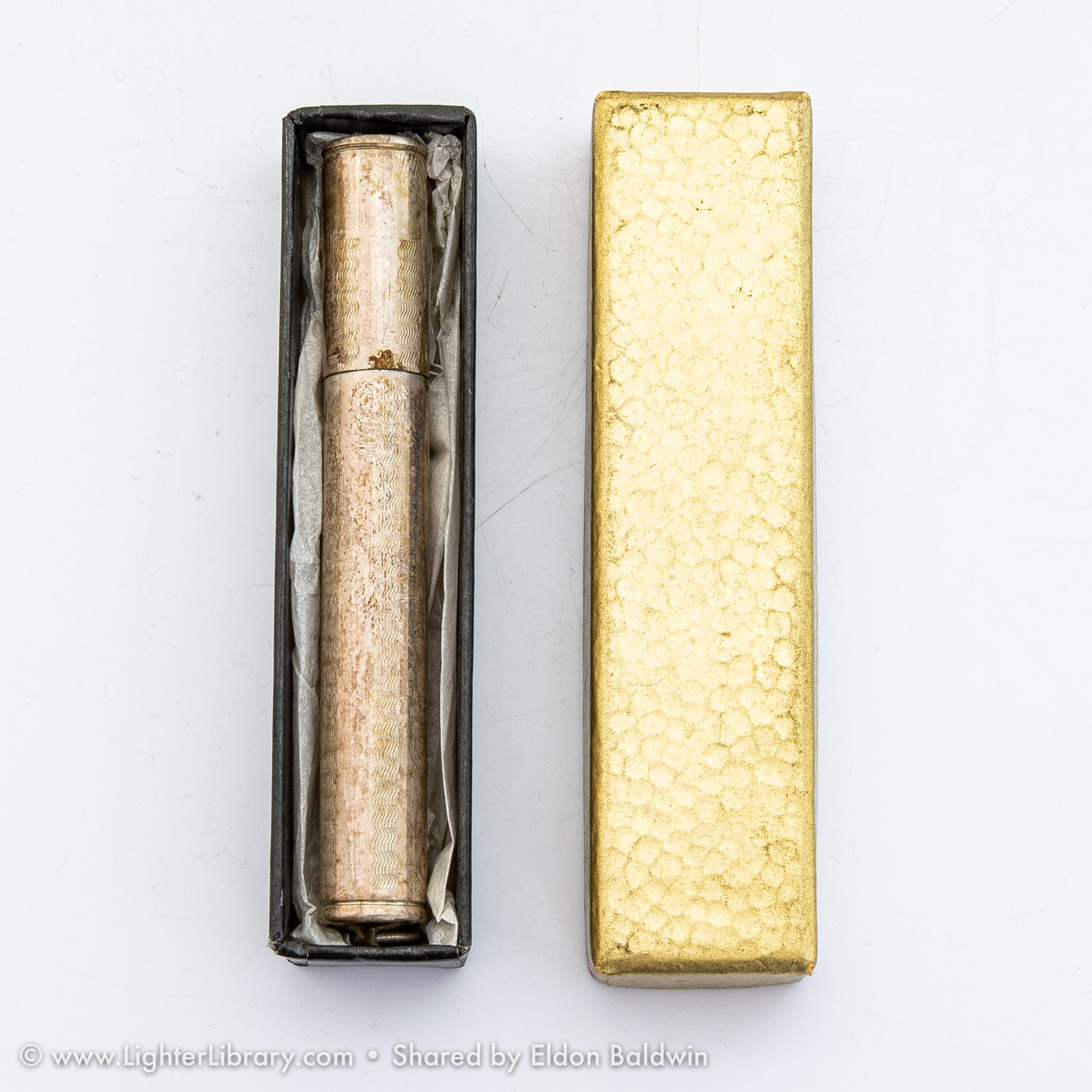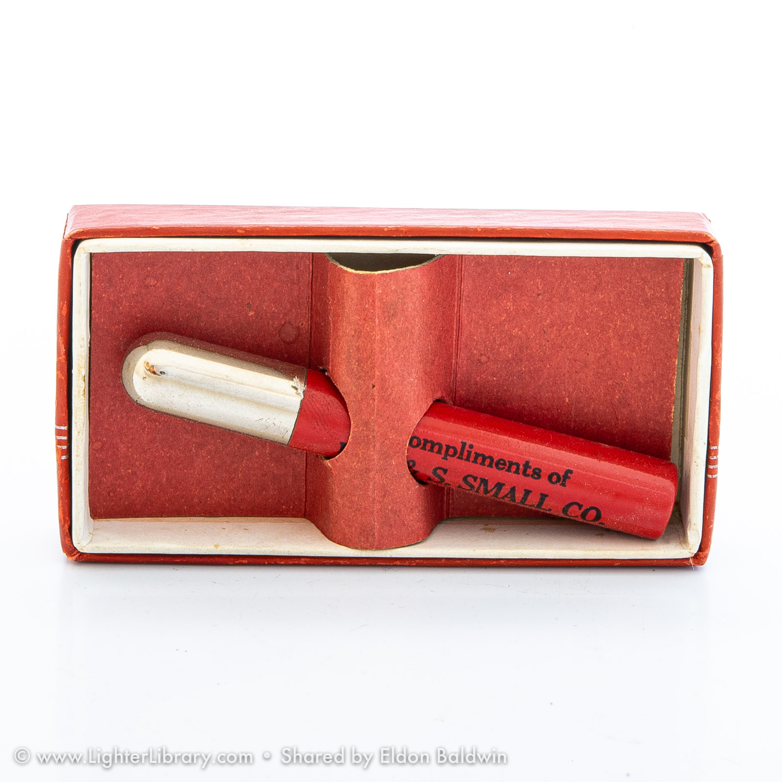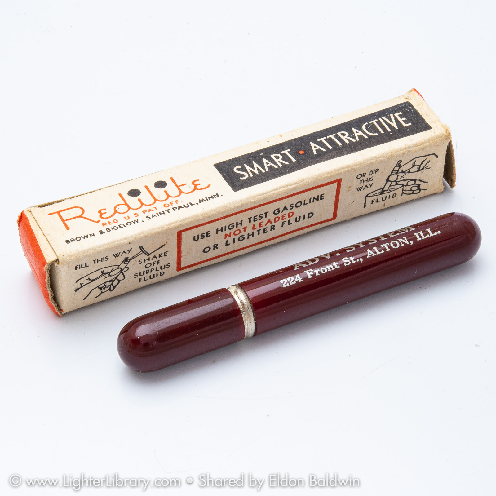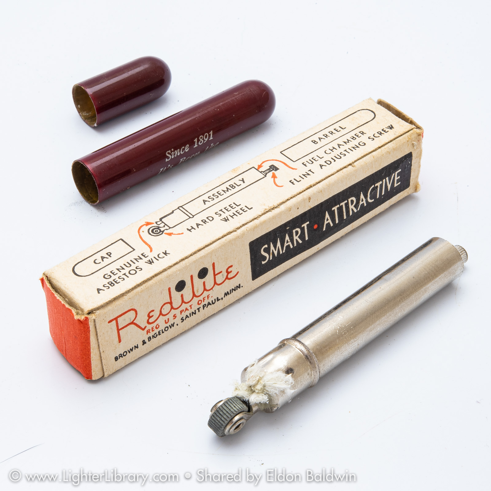 The first of several Brown & Bigelow lighters patented by Howard Fischer, the Redilite emulates manual thumbwheel lighters being produced in Europe before and after World War 1. A simple and concise design, B&B produced the Redilite with myriad tubular casing shapes, base materials and finishes which were frequently imprinted with advertising. Brown & Bigelow utilized the same mechanism design paired with different figural shaped holders to produce their shotgun shell-shaped "Sure Shot", multifunction lighter with can opener, and Standard Fruit Banana novelty lighters. (EB)