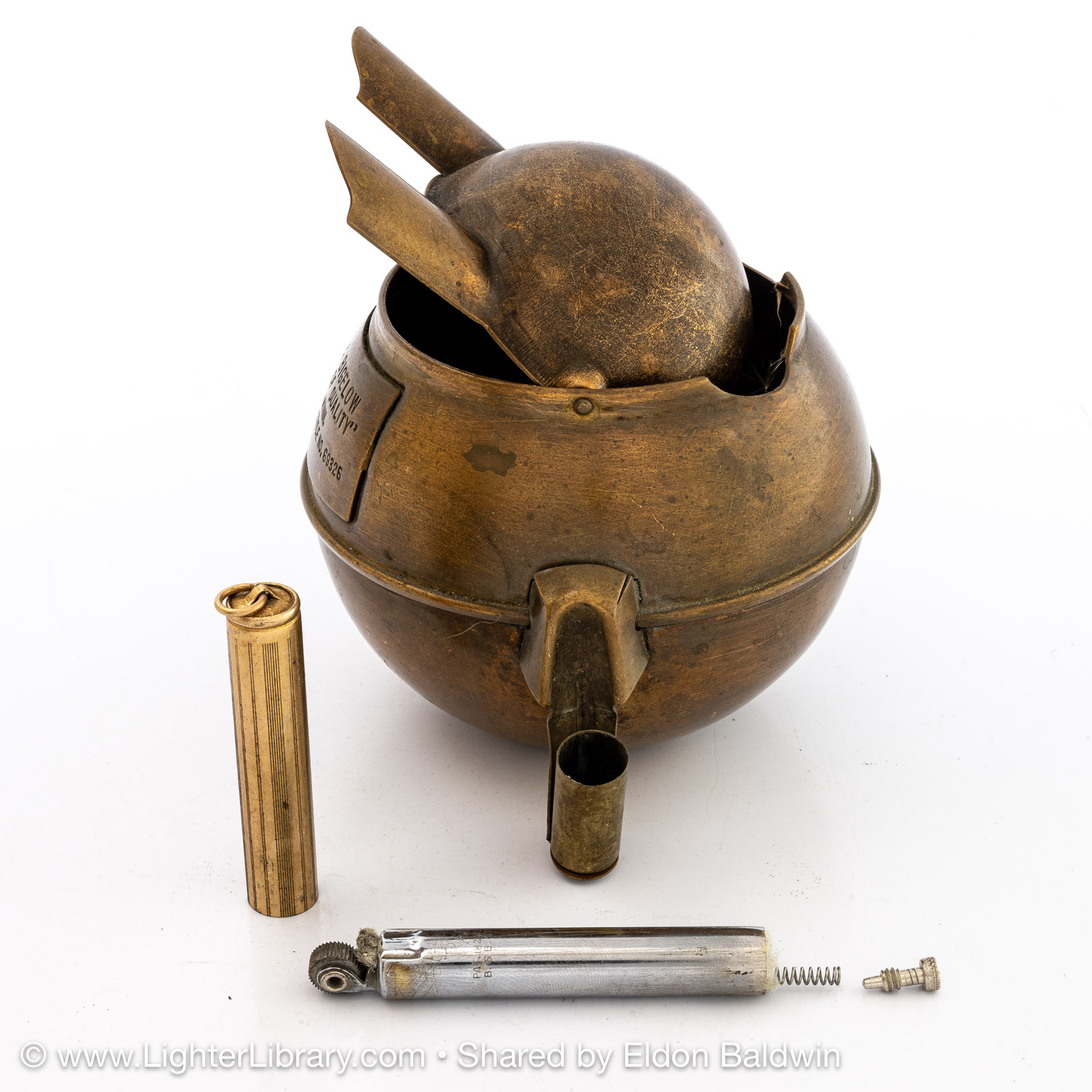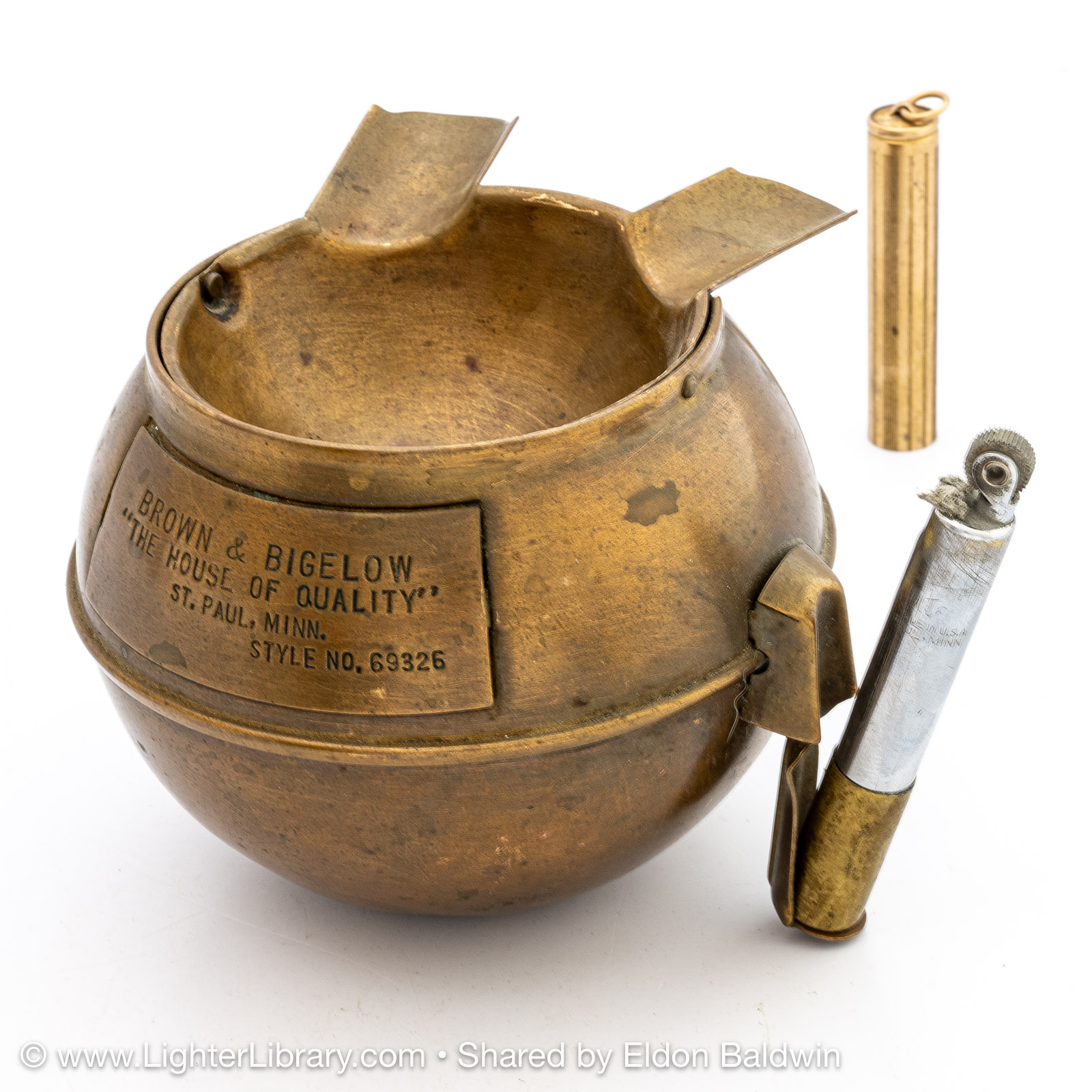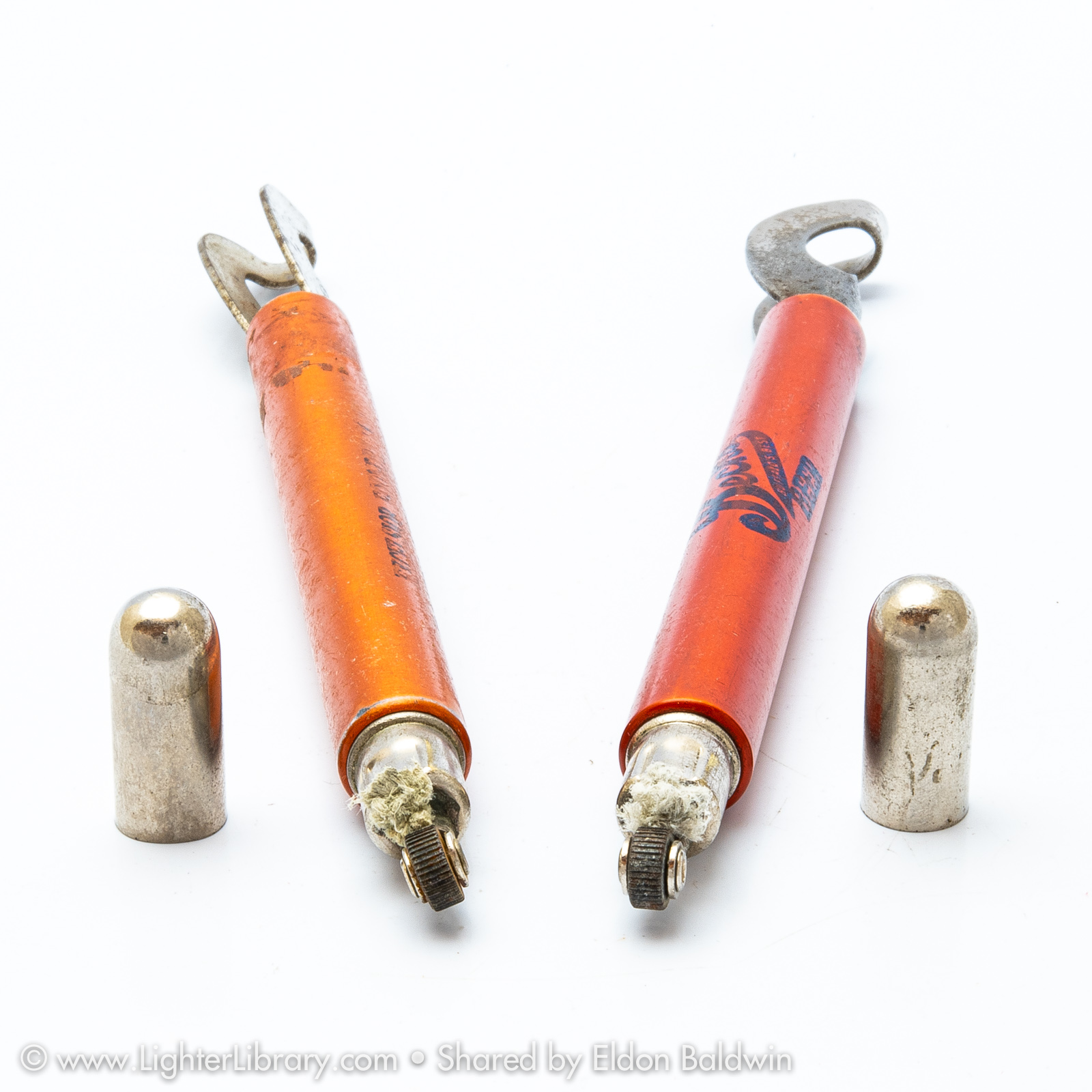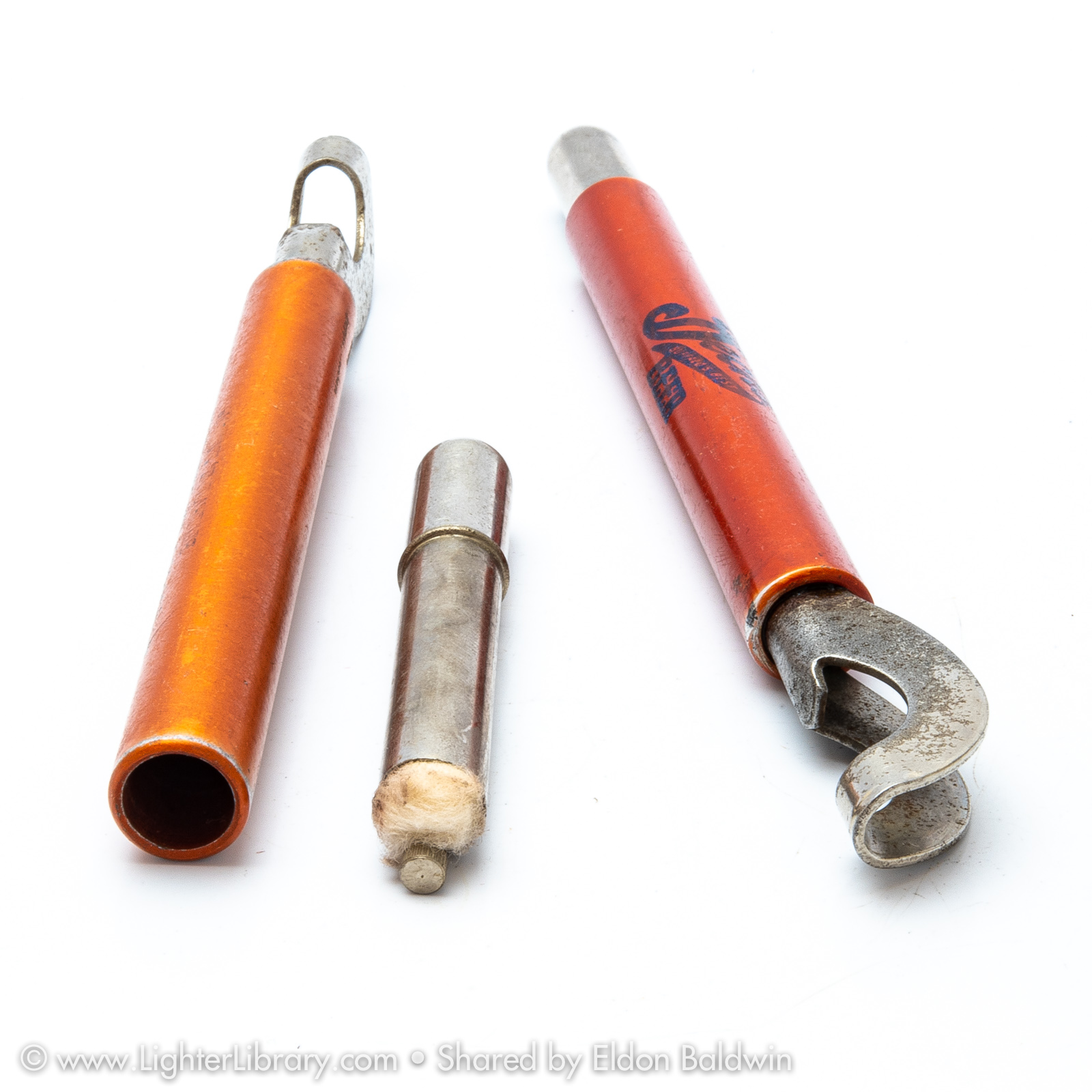 The first of several Brown & Bigelow lighters patented by Howard Fischer, the Redilite emulates manual thumbwheel lighters being produced in Europe before and after World War 1. A simple and concise design, B&B produced the Redilite with myriad tubular casing shapes, base materials and finishes which were frequently imprinted with advertising. Brown & Bigelow utilized the same mechanism design paired with different figural shaped holders to produce their shotgun shell-shaped "Sure Shot", multifunction lighter with can opener, and Standard Fruit Banana novelty lighters. (EB)