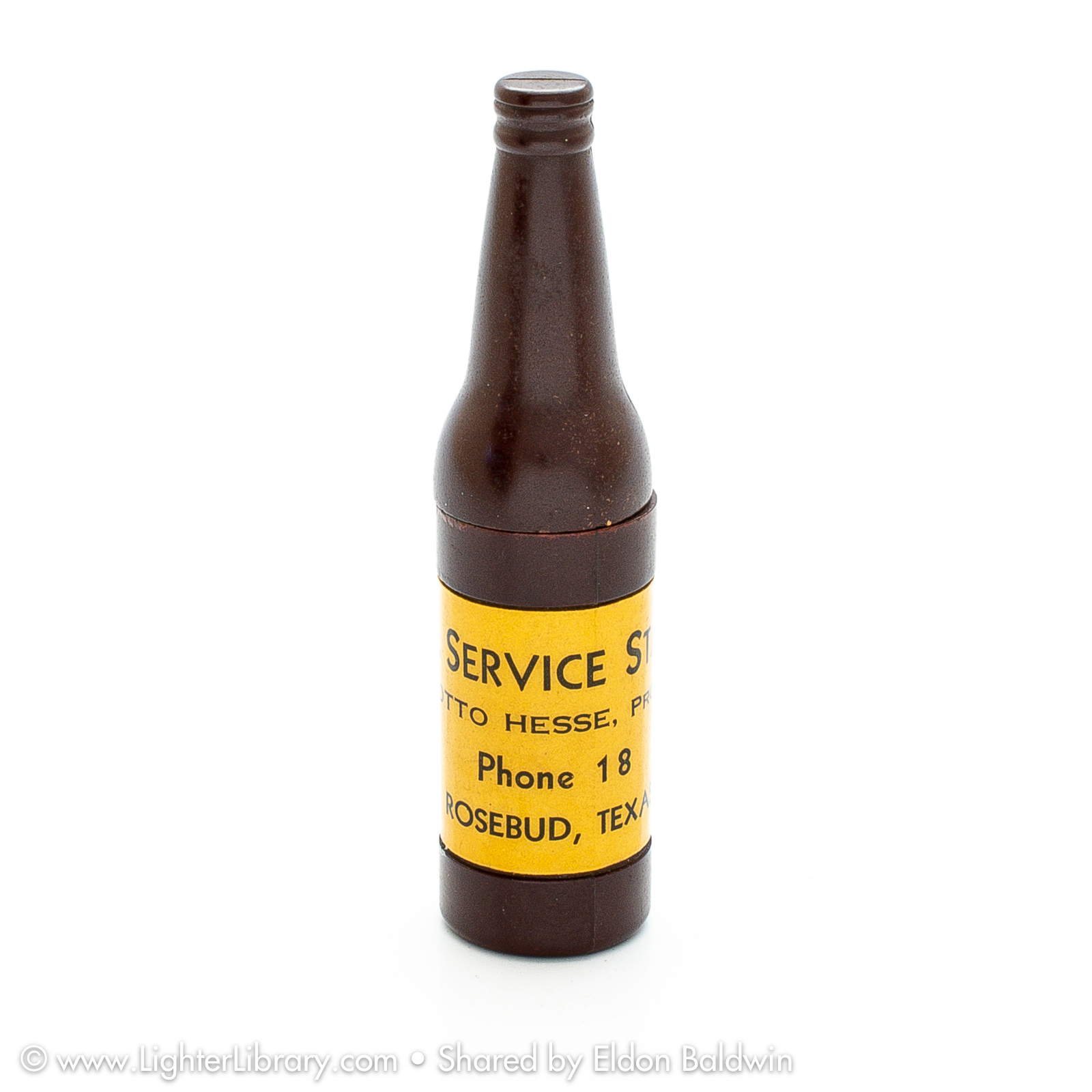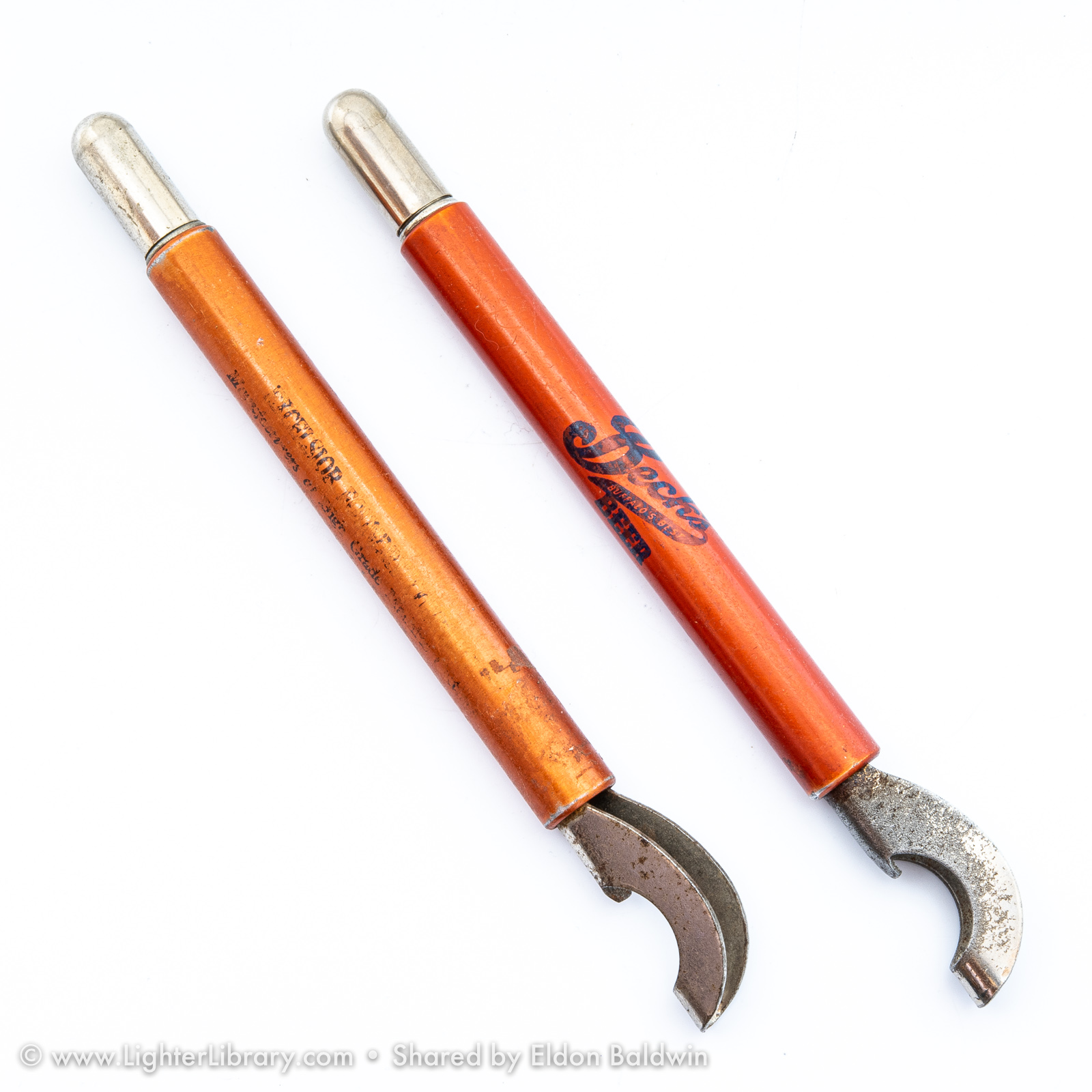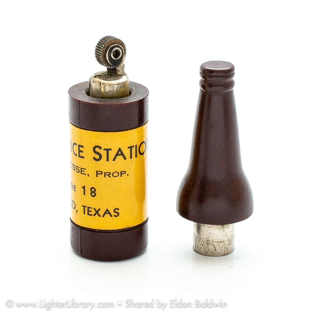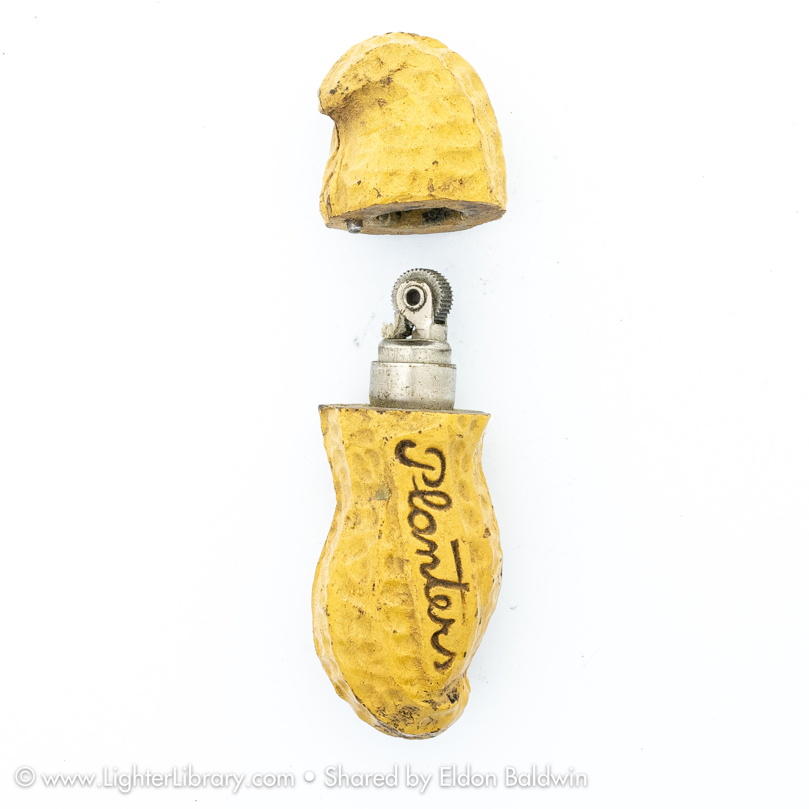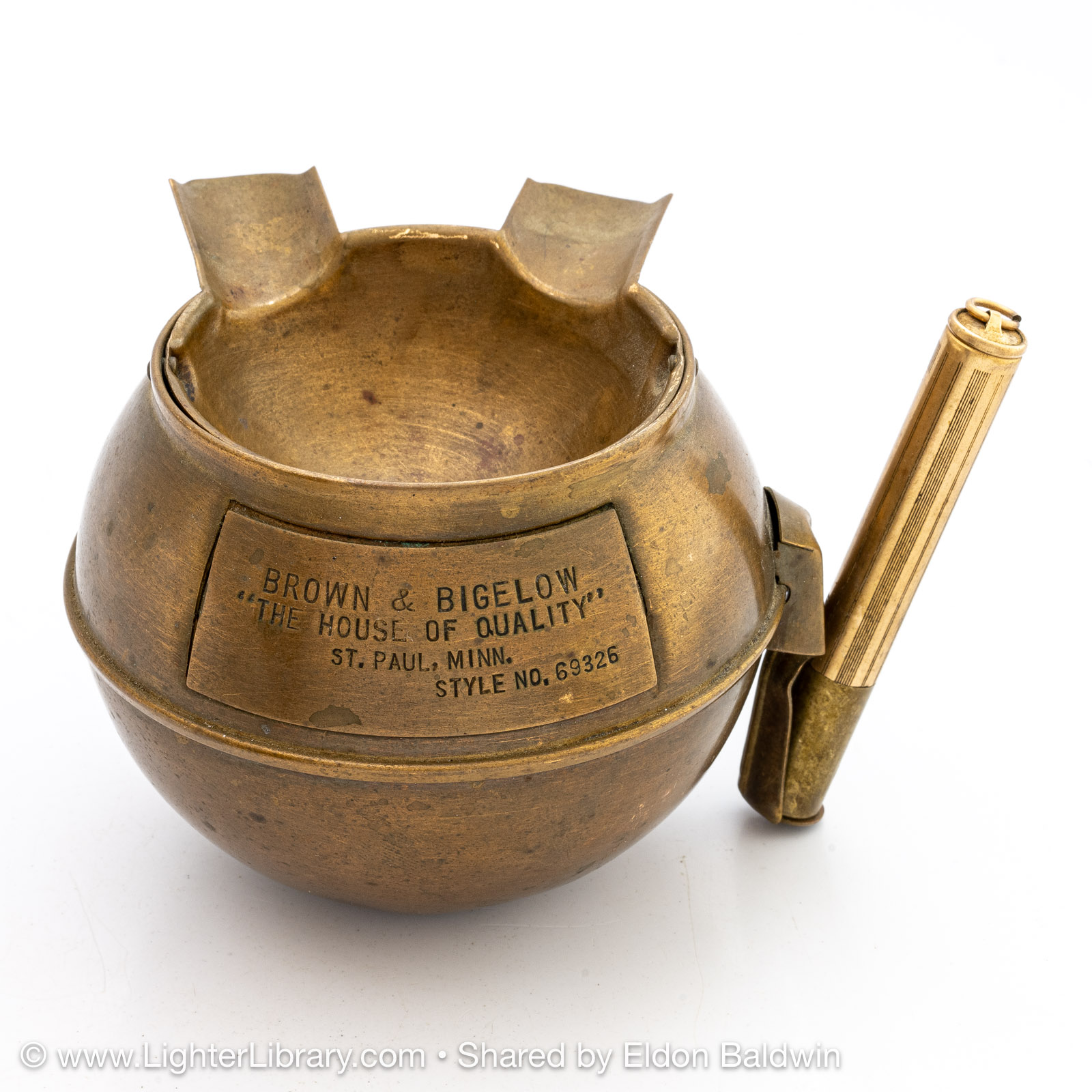 The first of several Brown & Bigelow lighters patented by Howard Fischer, the Redilite emulates manual thumbwheel lighters being produced in Europe before and after World War 1. A simple and concise design, B&B produced the Redilite with myriad tubular casing shapes, base materials and finishes which were frequently imprinted with advertising. Brown & Bigelow utilized the same mechanism design paired with different figural shaped holders to produce their shotgun shell-shaped "Sure Shot", multifunction lighter with can opener, and Standard Fruit Banana novelty lighters. (EB)