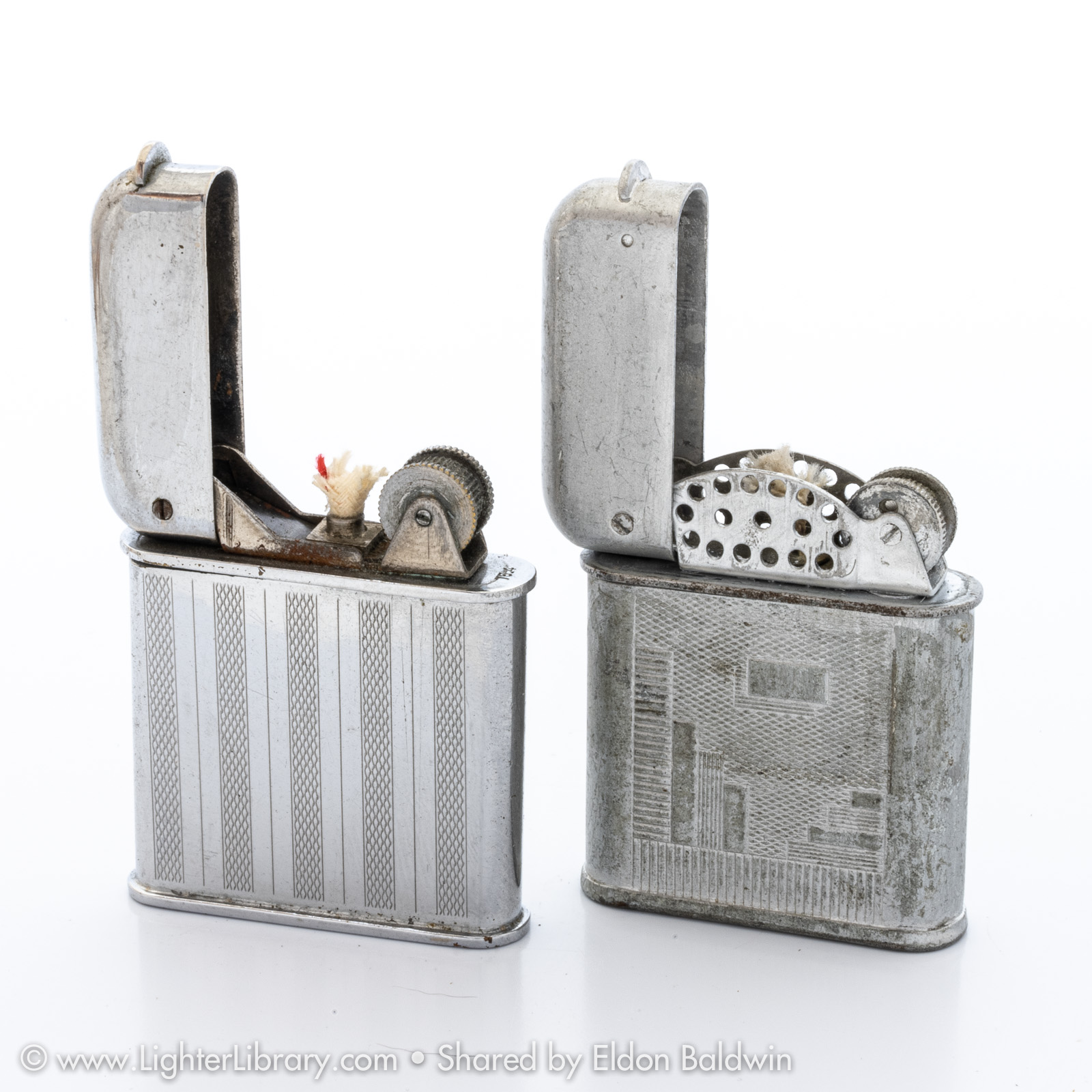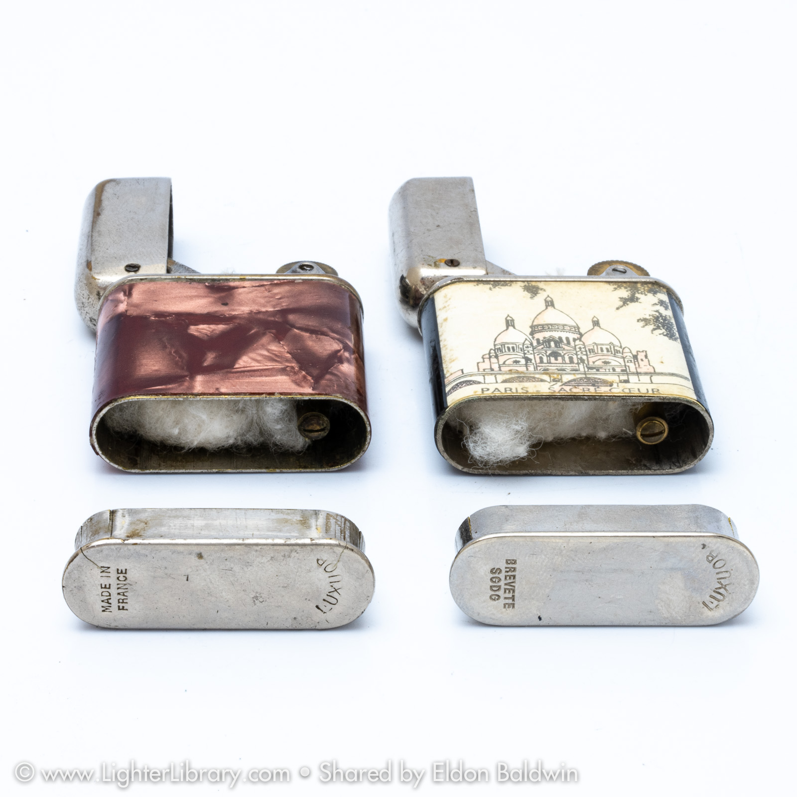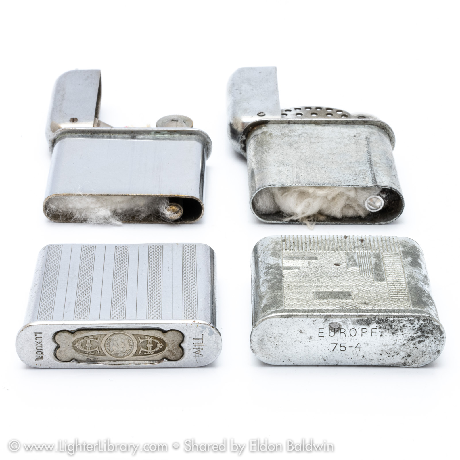 Designed by Rene Cauët in 1938, several variations of the Luxuor flip-top pocket lighter were produced. Models were produced using brass and alloy base metal. The "Europe" model was made from aluminum with a raised wind guard. (EB)