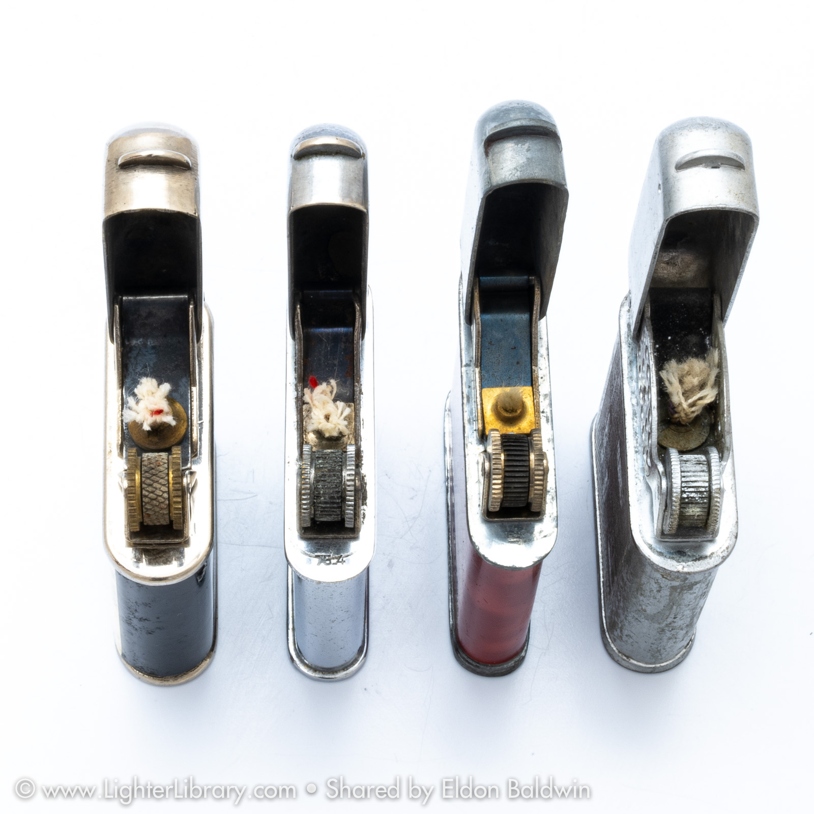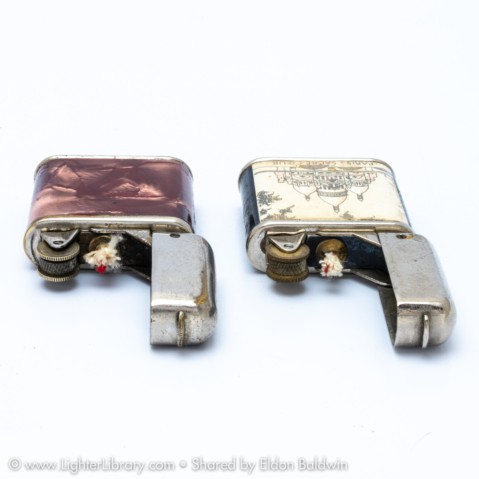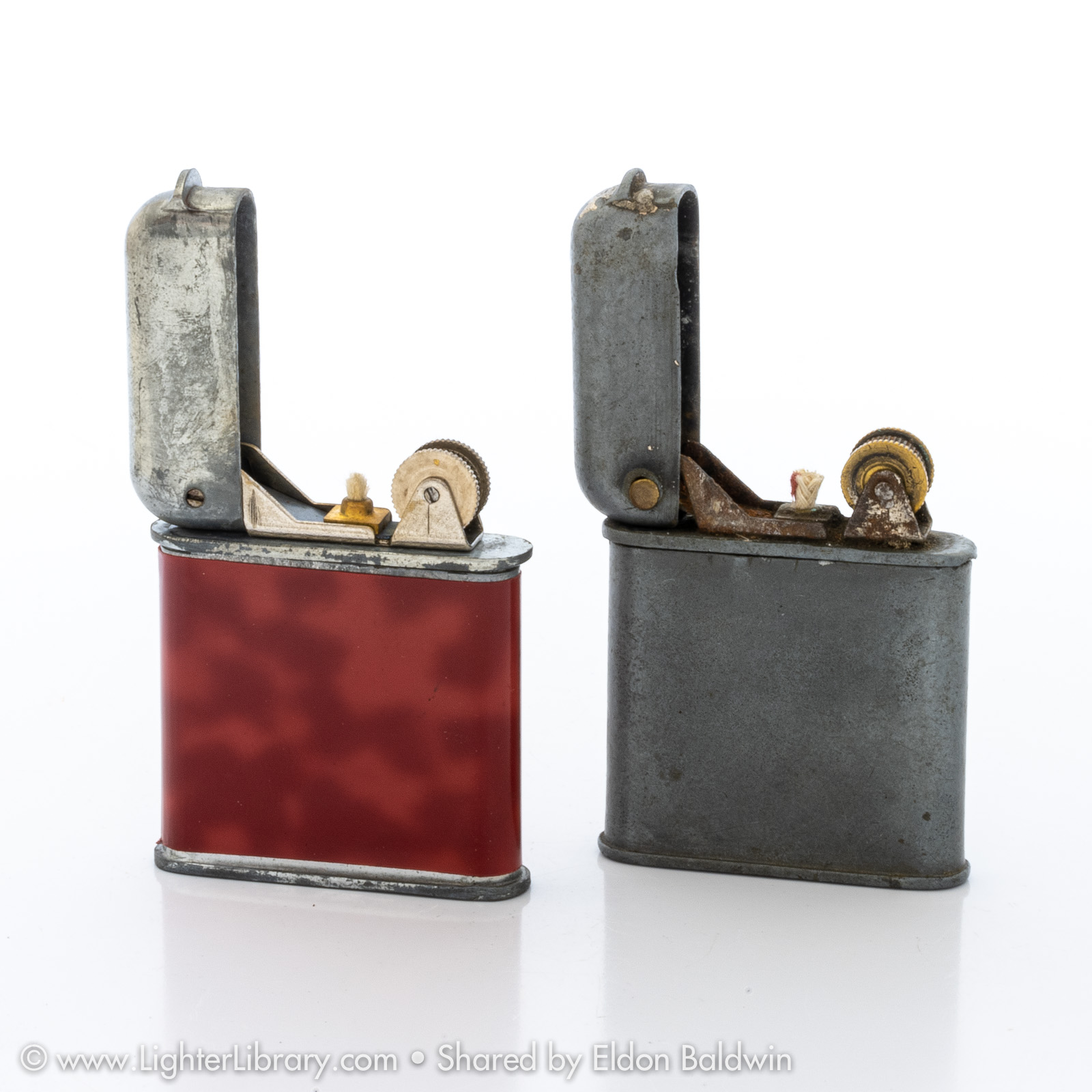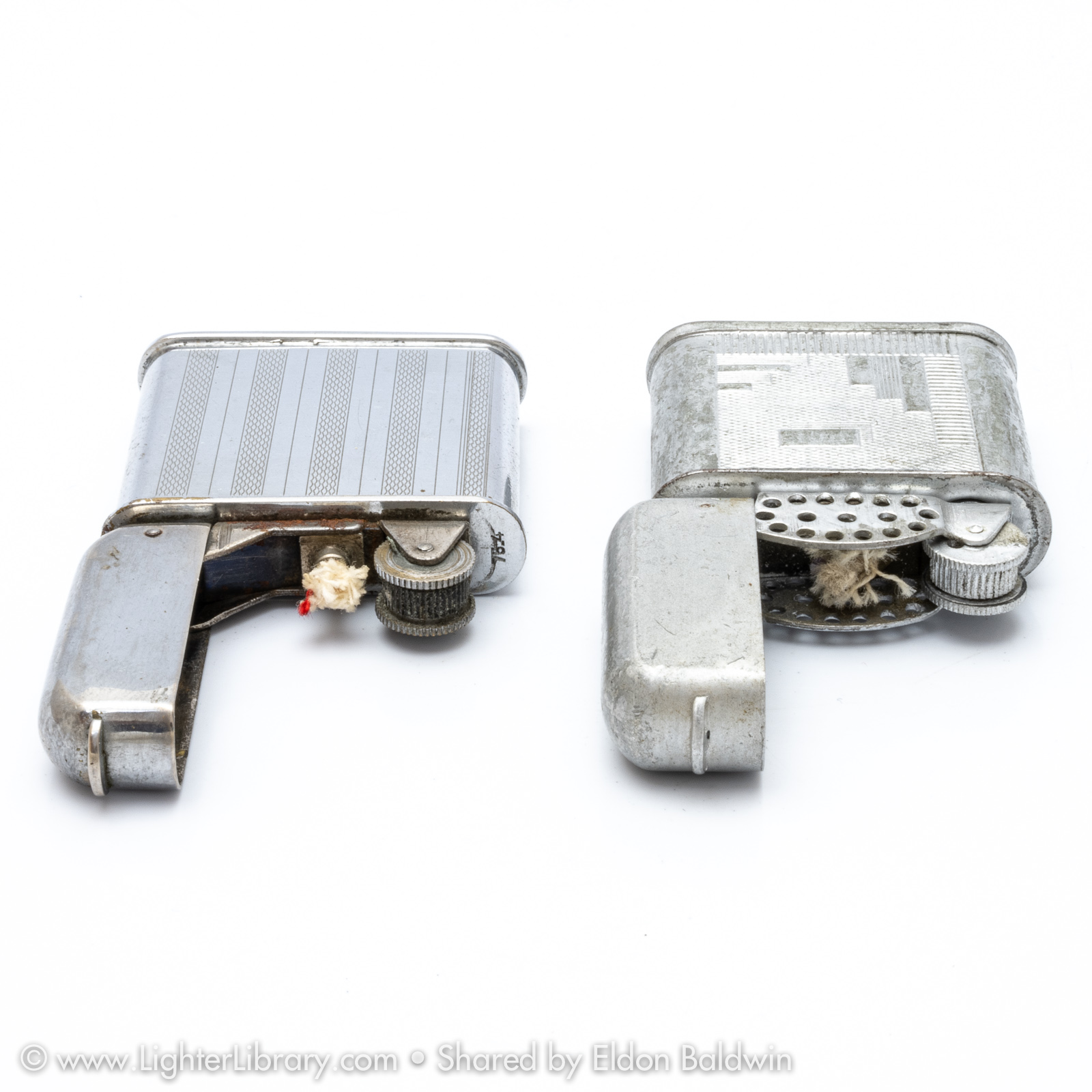 Designed by Rene Cauët in 1938, several variations of the Luxuor flip-top pocket lighter were produced. Models were produced using brass and alloy base metal. The "Europe" model was made from aluminum with a raised wind guard. (EB)