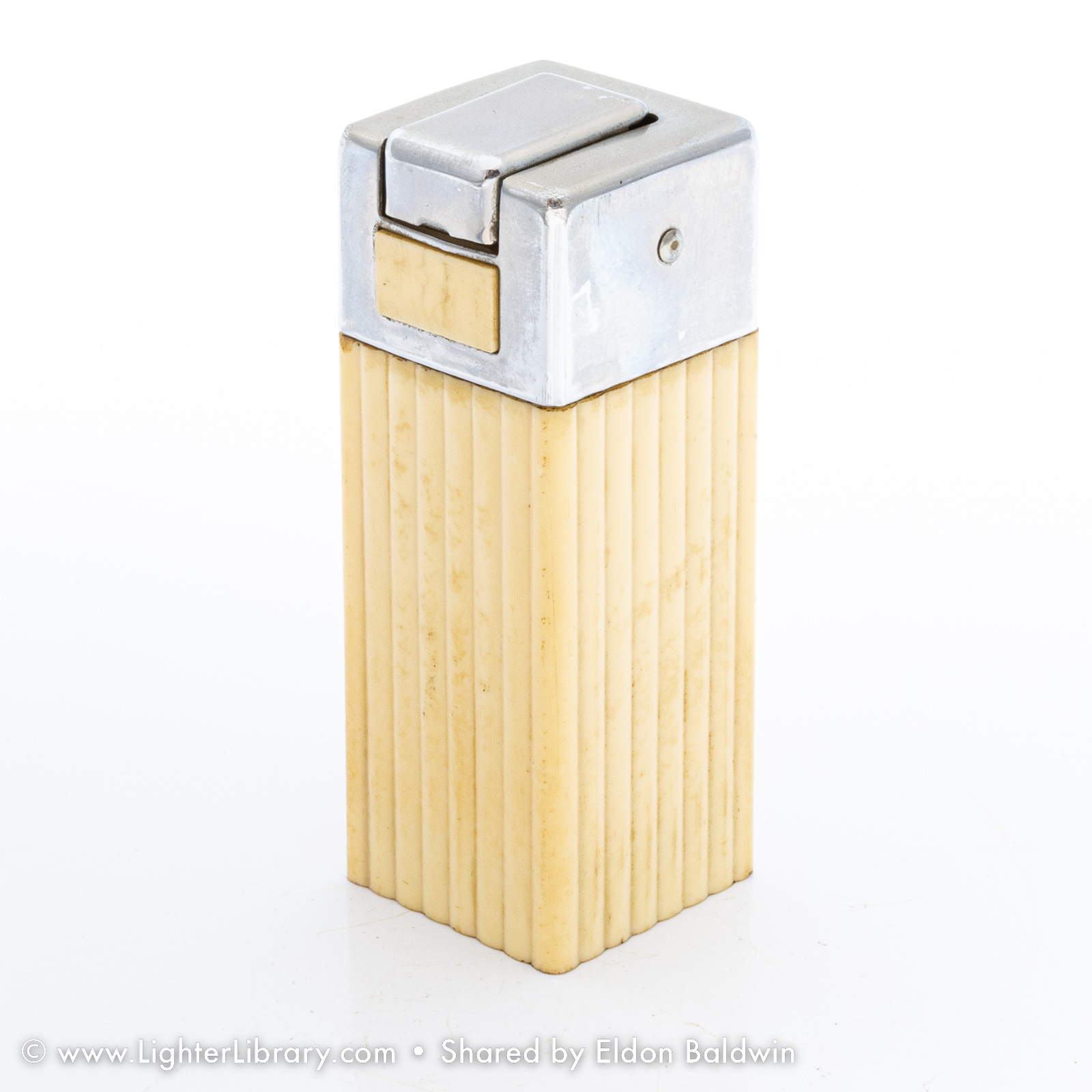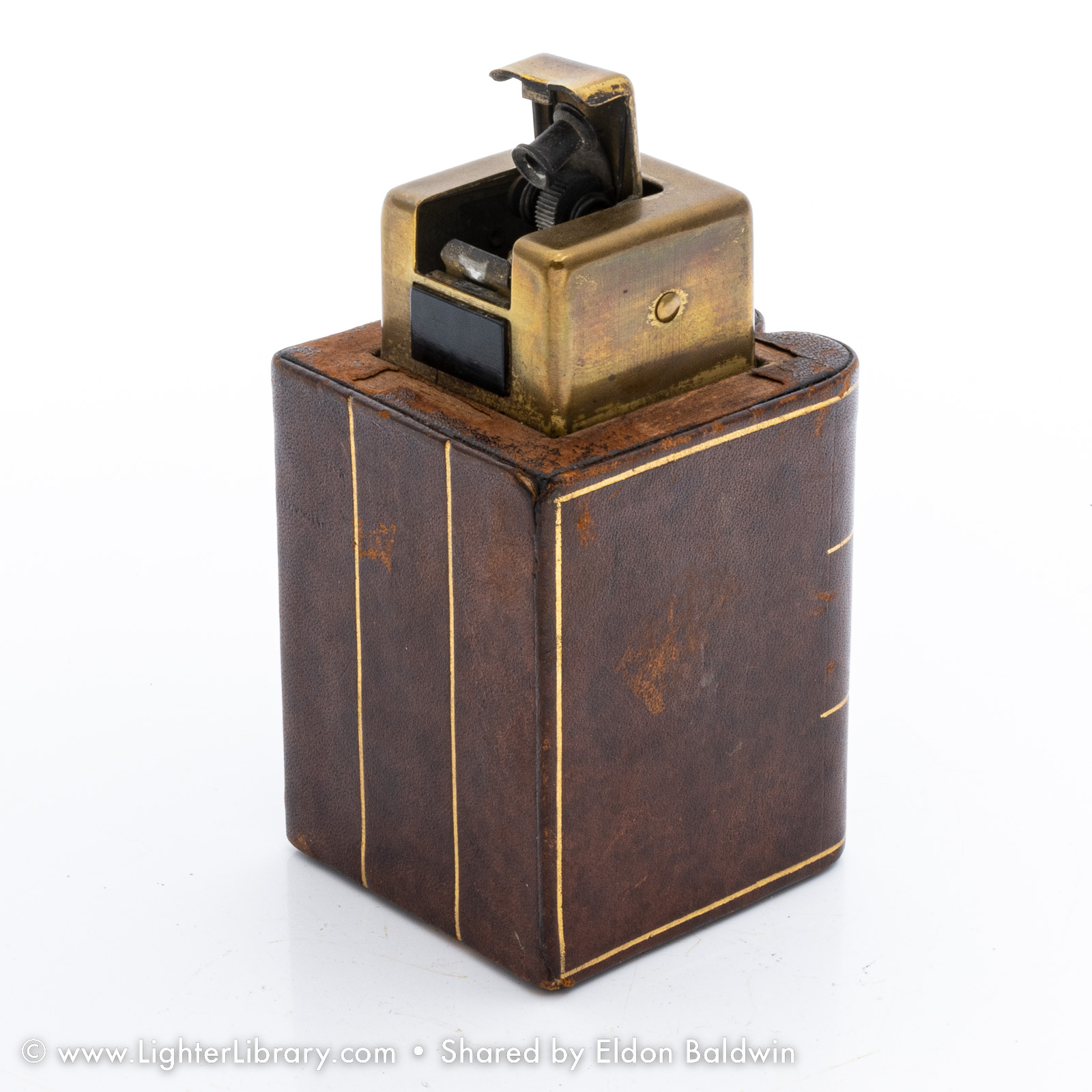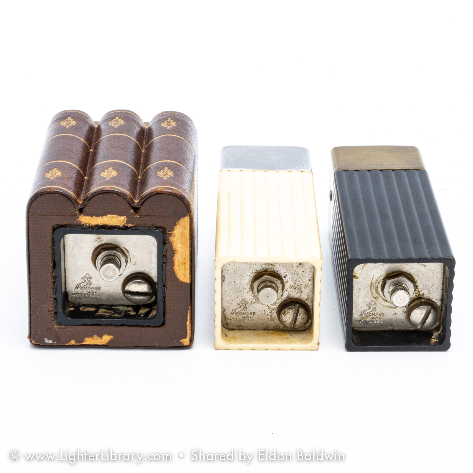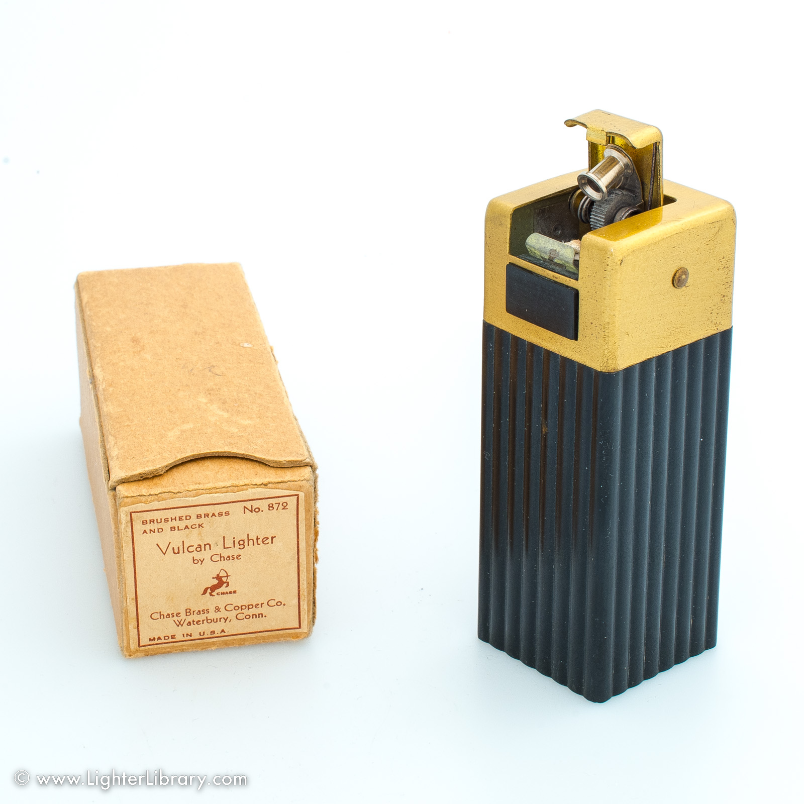 Designed by Russel Bass in 1938, his utility patent for the mechanics of the Vulcan was granted in 1939 and assigned to Chase. Chase only produced this lighters for a couple of years before production was discontinued as the U.S. entered World War 2. Vulcans are most commonly seen with plastic bodies but other figural finish options were offered. (EB)