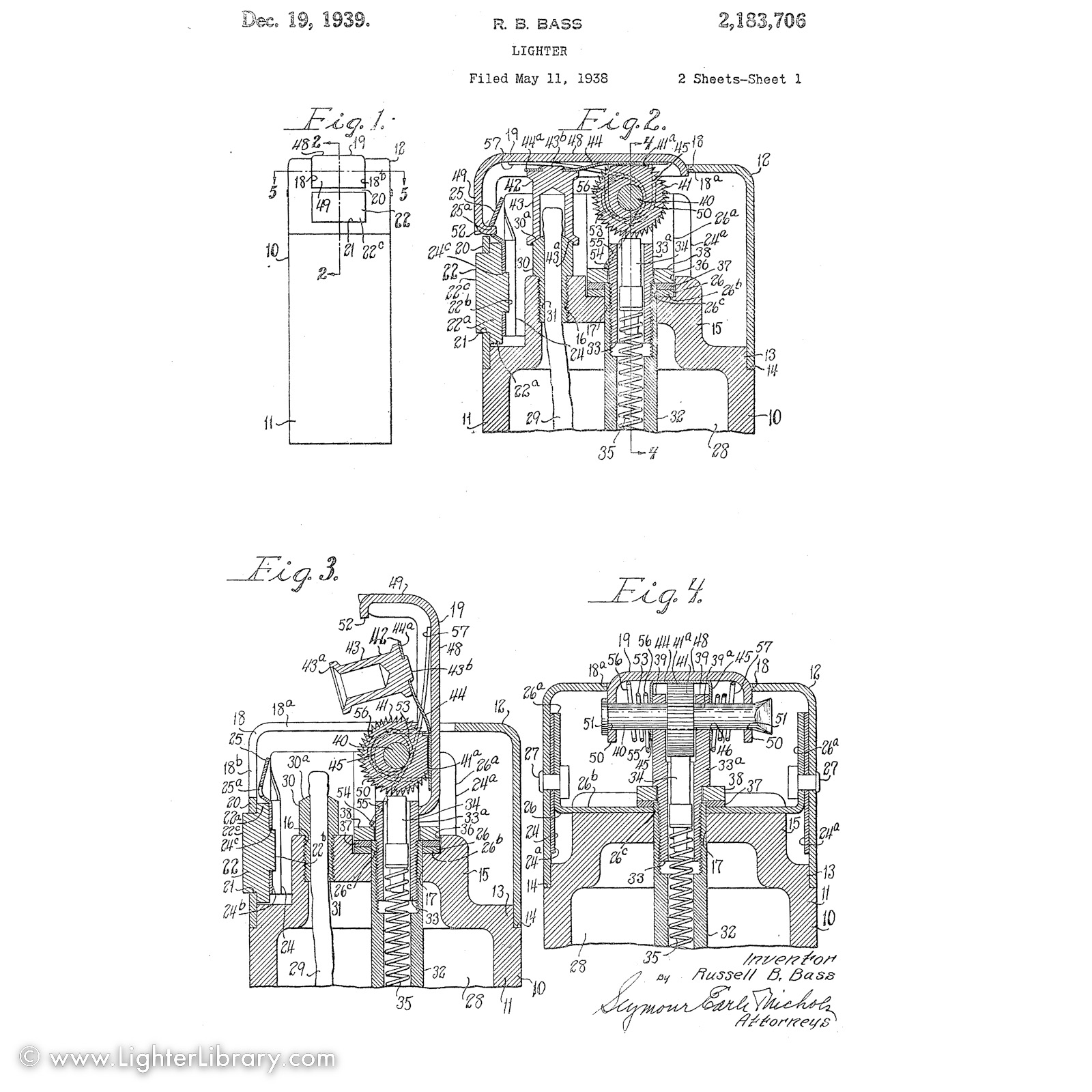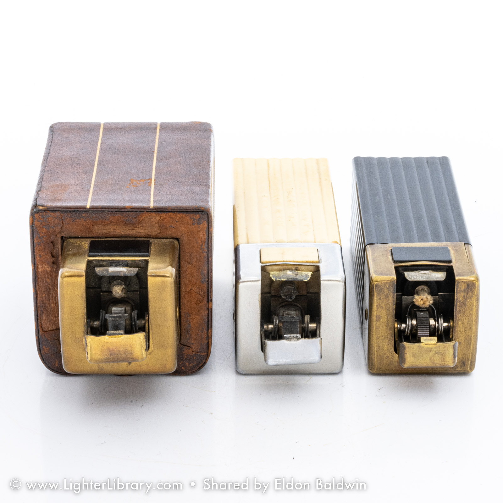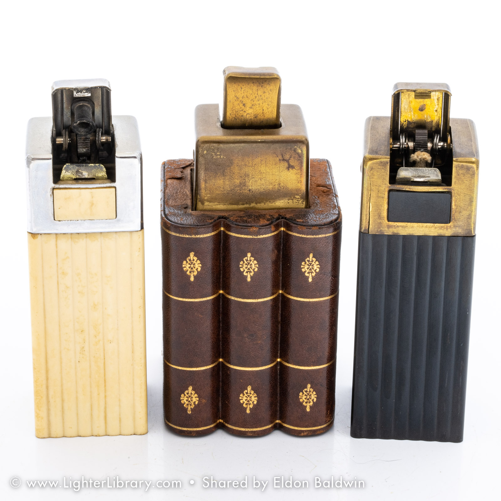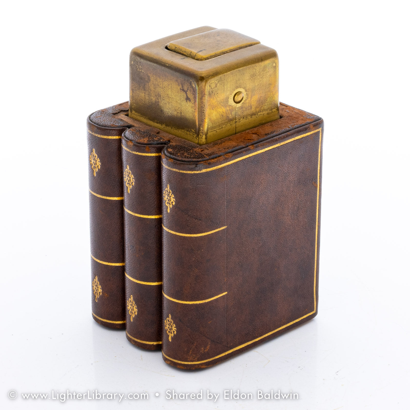 Designed by Russel Bass in 1938, his utility patent for the mechanics of the Vulcan was granted in 1939 and assigned to Chase. Chase only produced this lighters for a couple of years before production was discontinued as the U.S. entered World War 2. Vulcans are most commonly seen with plastic bodies but other figural finish options were offered. (EB)