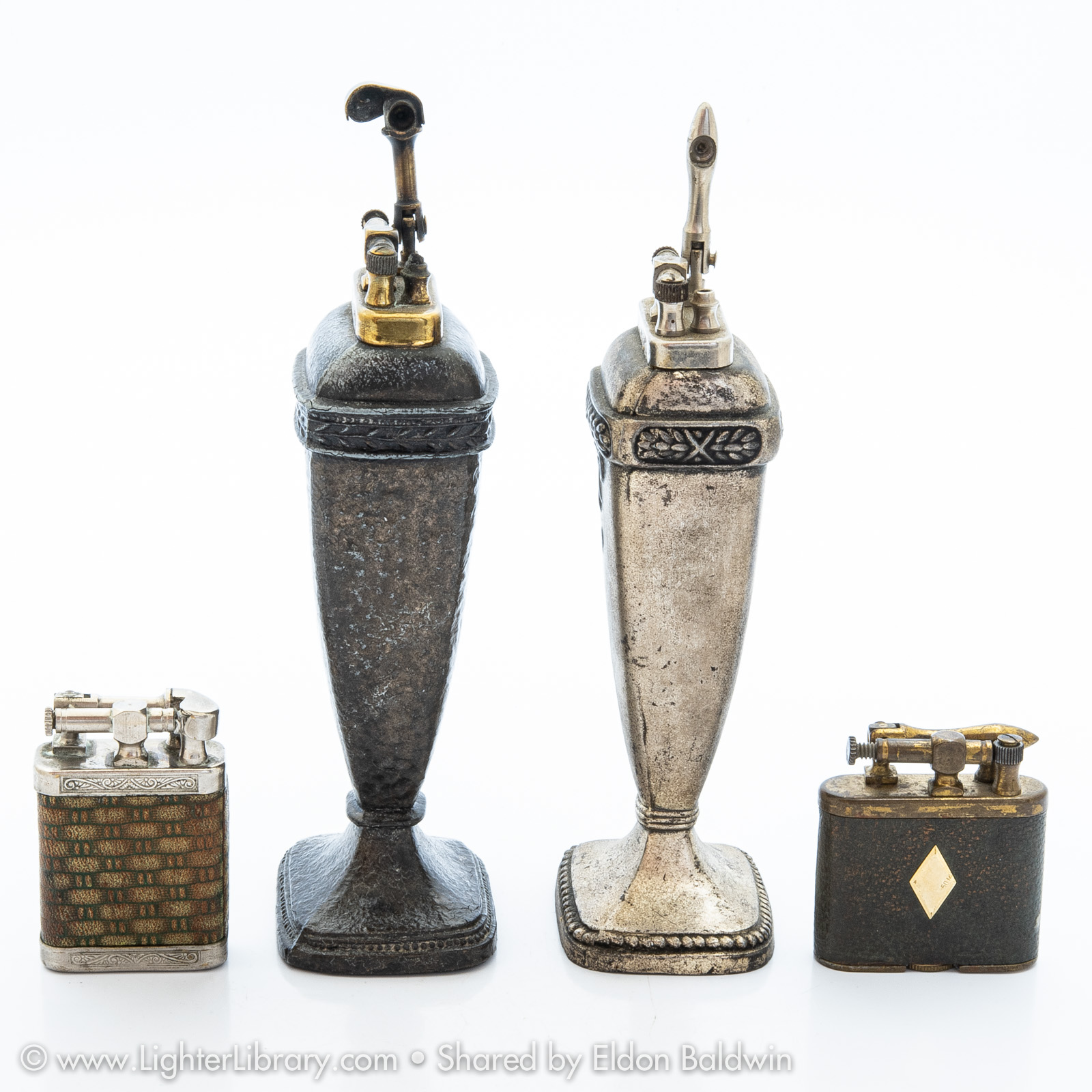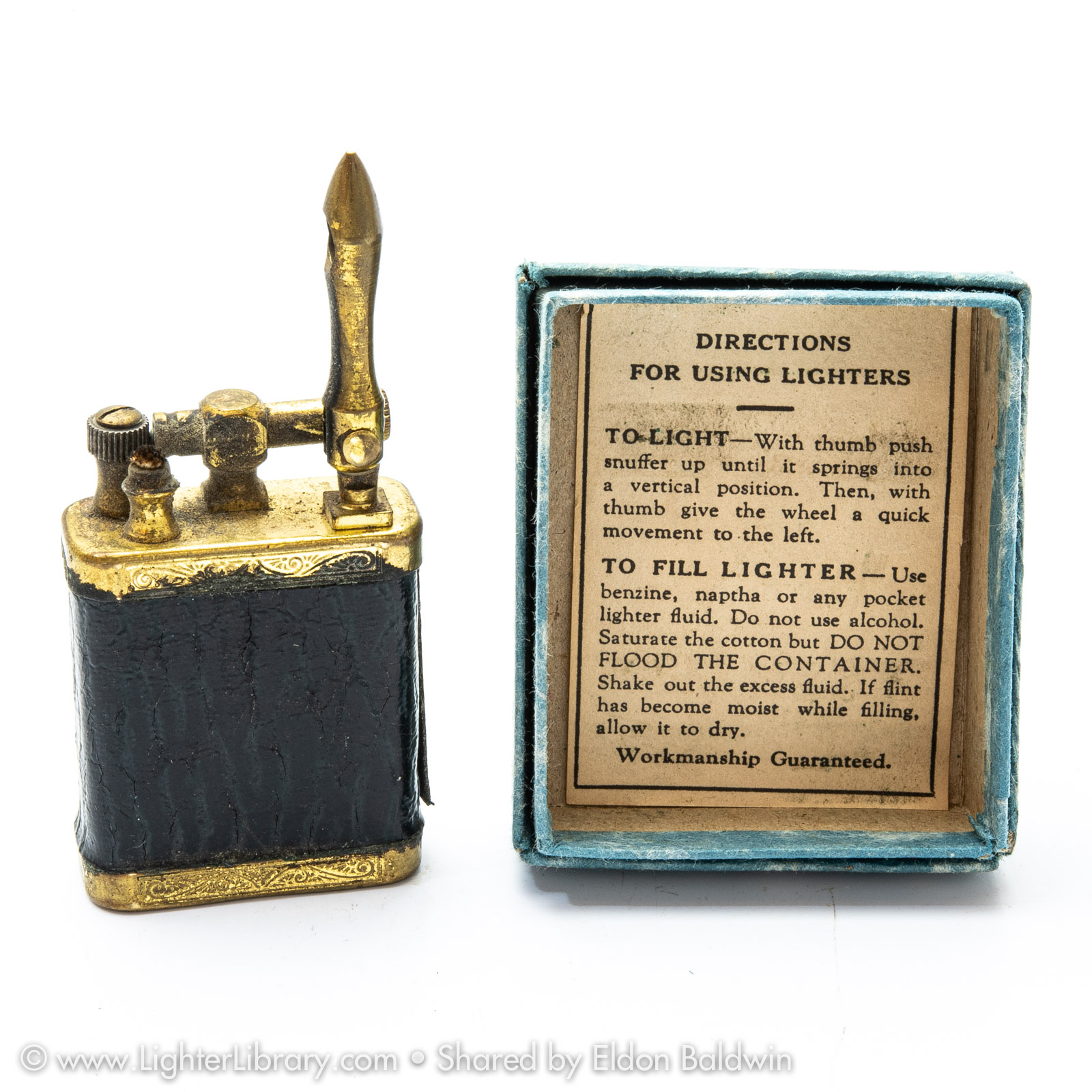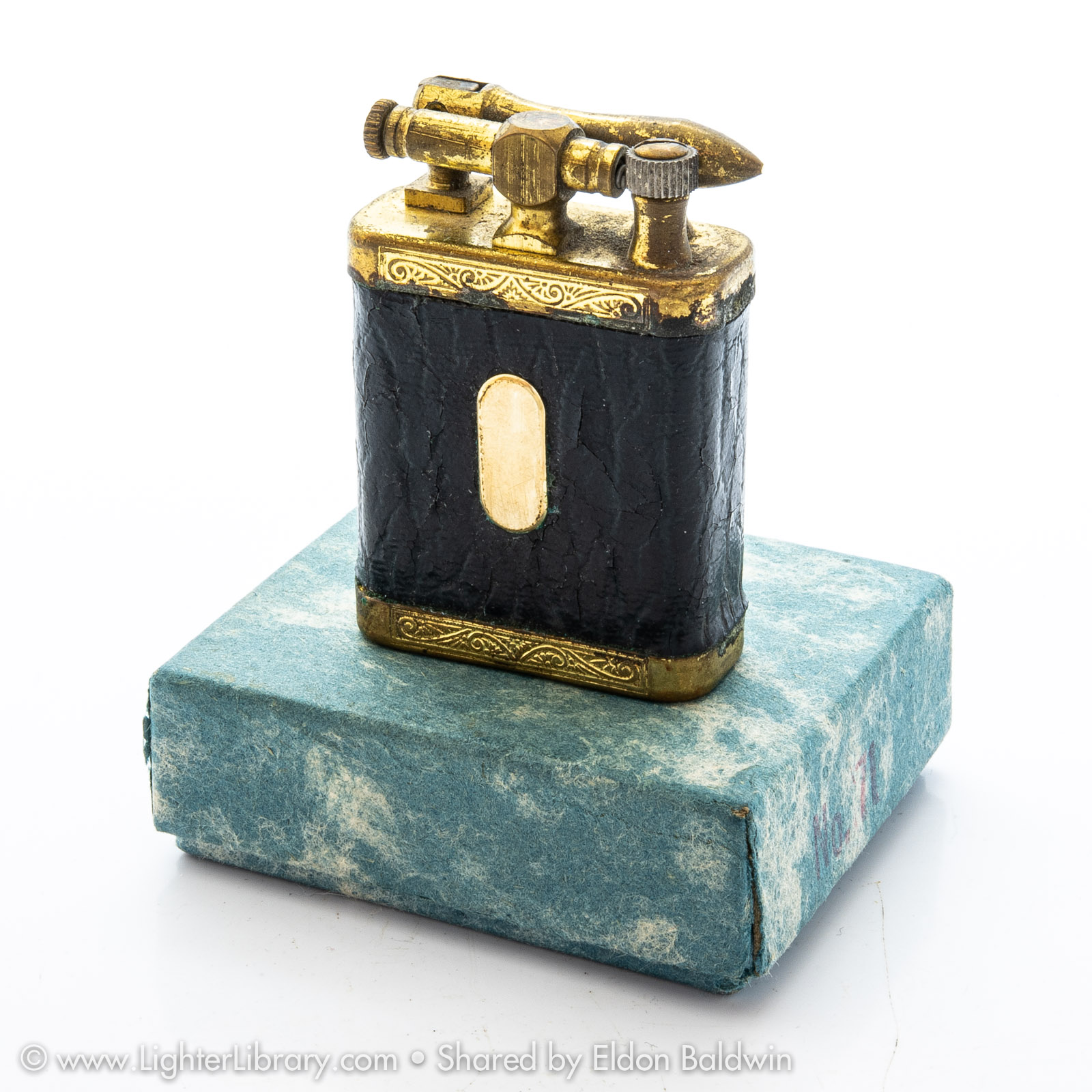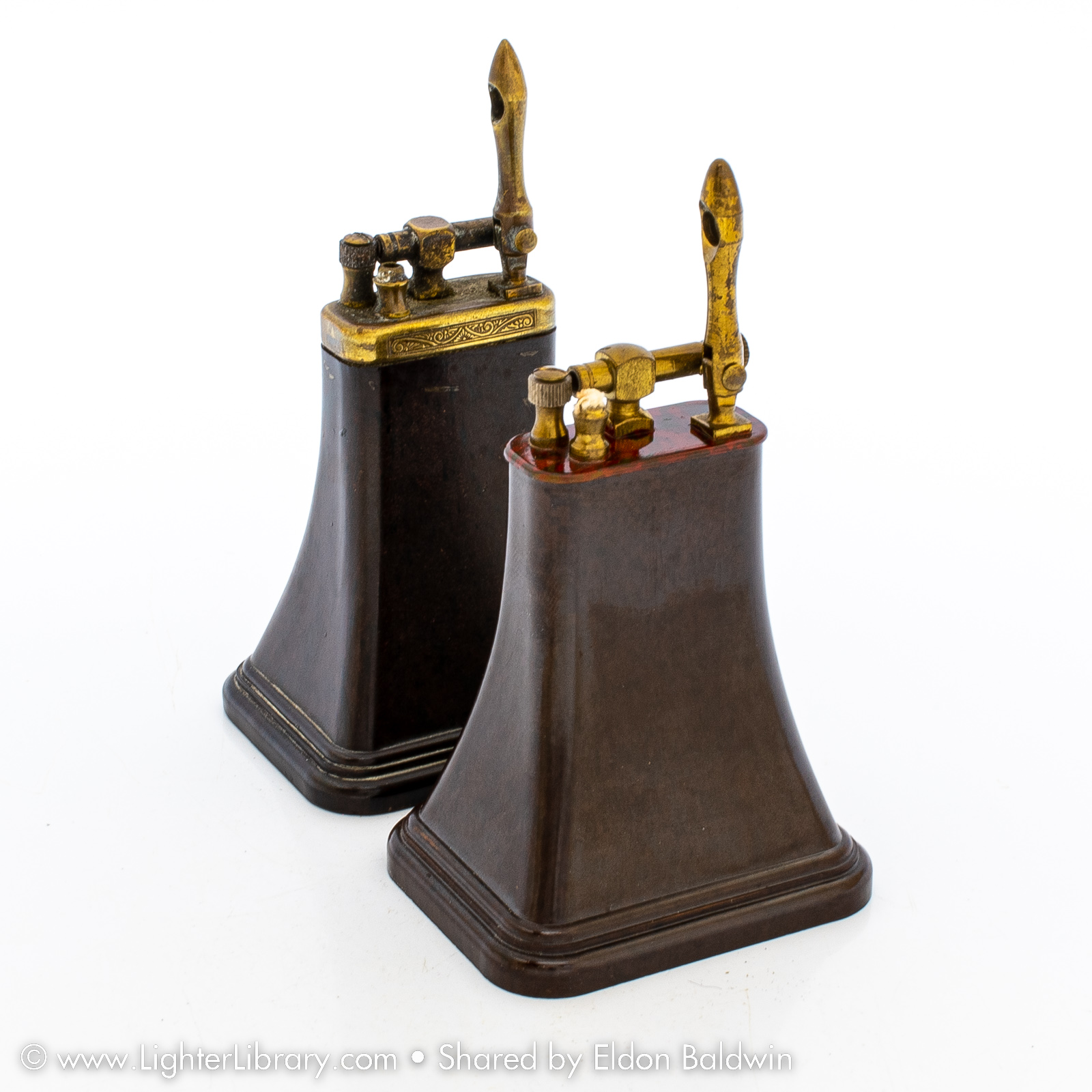 Fay Mfg. produced a broad range of pocket and table lighters based on the mechanism pictured in Henry Schiff's 1928 U.S. Design Patent 77861 for a desk lighter. The patent drawing shows a double bar lift arm mechanism with uniquely shaped snuffer and exposed sparking wheel. Though sometimes advertised using the "Elgin" brandname trademarked by Schiff in 1927, these lighters are not branded usually. Several pocket lighter body shapes and styles were produced using brass, steel and bakelite plastic. Fay similarly offered an eclectic array of table lighters with figural and decorative bases. (EB)