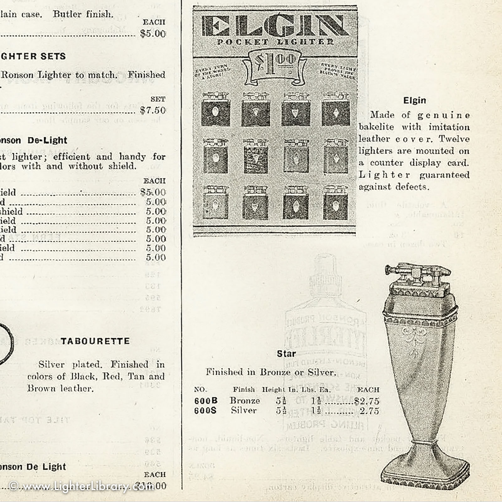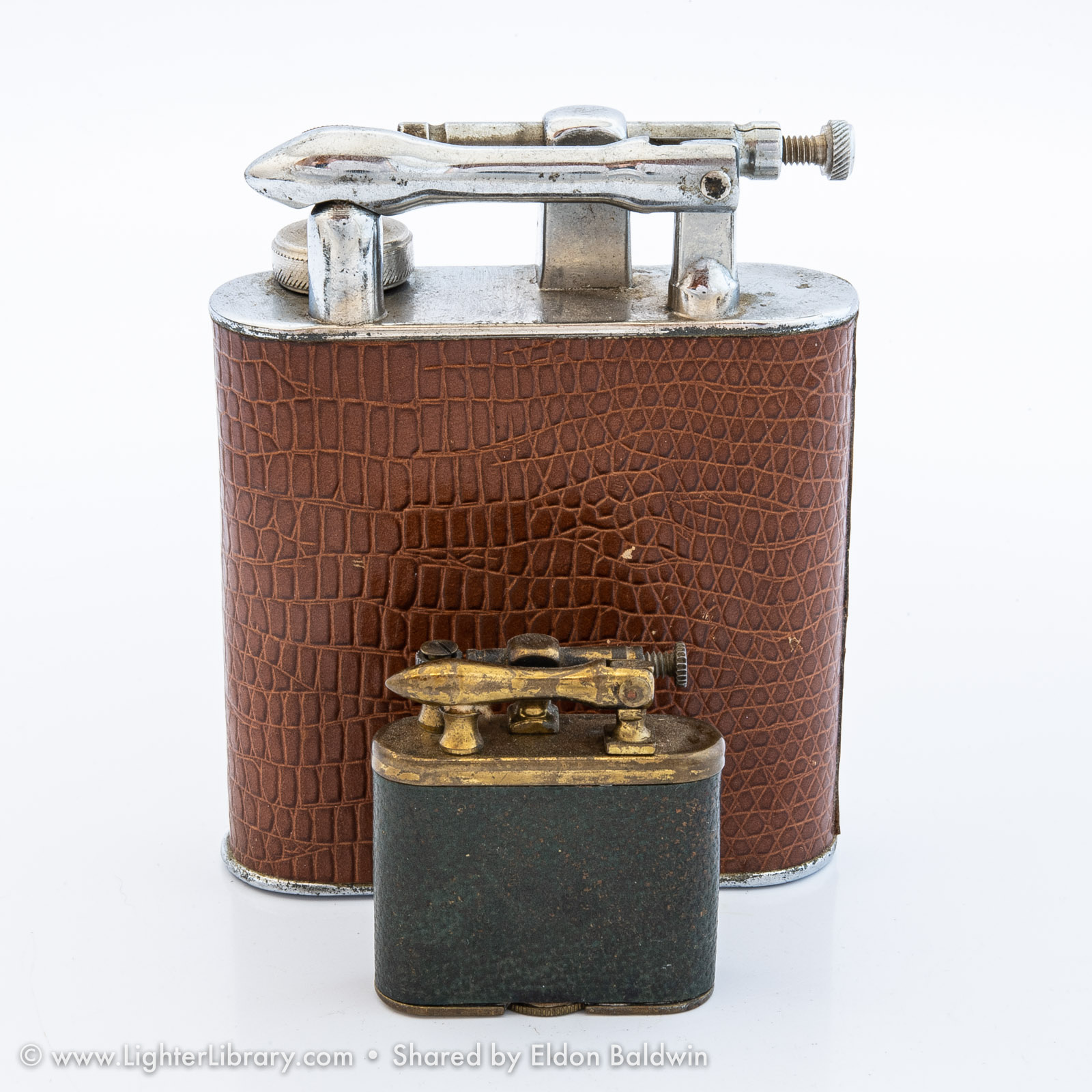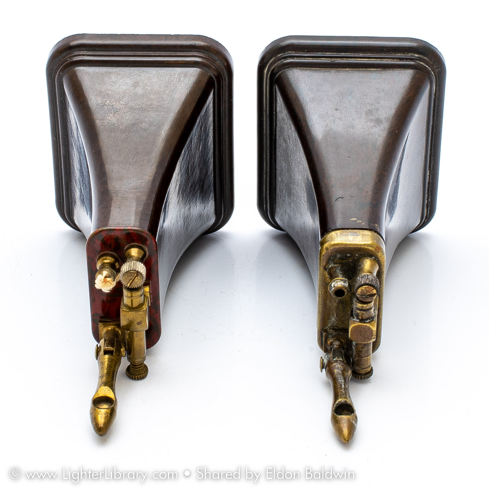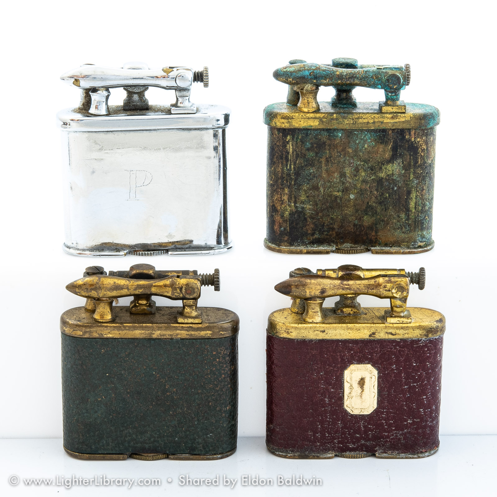 Fay Mfg. produced a broad range of pocket and table lighters based on the mechanism pictured in Henry Schiff's 1928 U.S. Design Patent 77861 for a desk lighter. The patent drawing shows a double bar lift arm mechanism with uniquely shaped snuffer and exposed sparking wheel. Though sometimes advertised using the "Elgin" brandname trademarked by Schiff in 1927, these lighters are not branded usually. Several pocket lighter body shapes and styles were produced using brass, steel and bakelite plastic. Fay similarly offered an eclectic array of table lighters with figural and decorative bases. (EB)