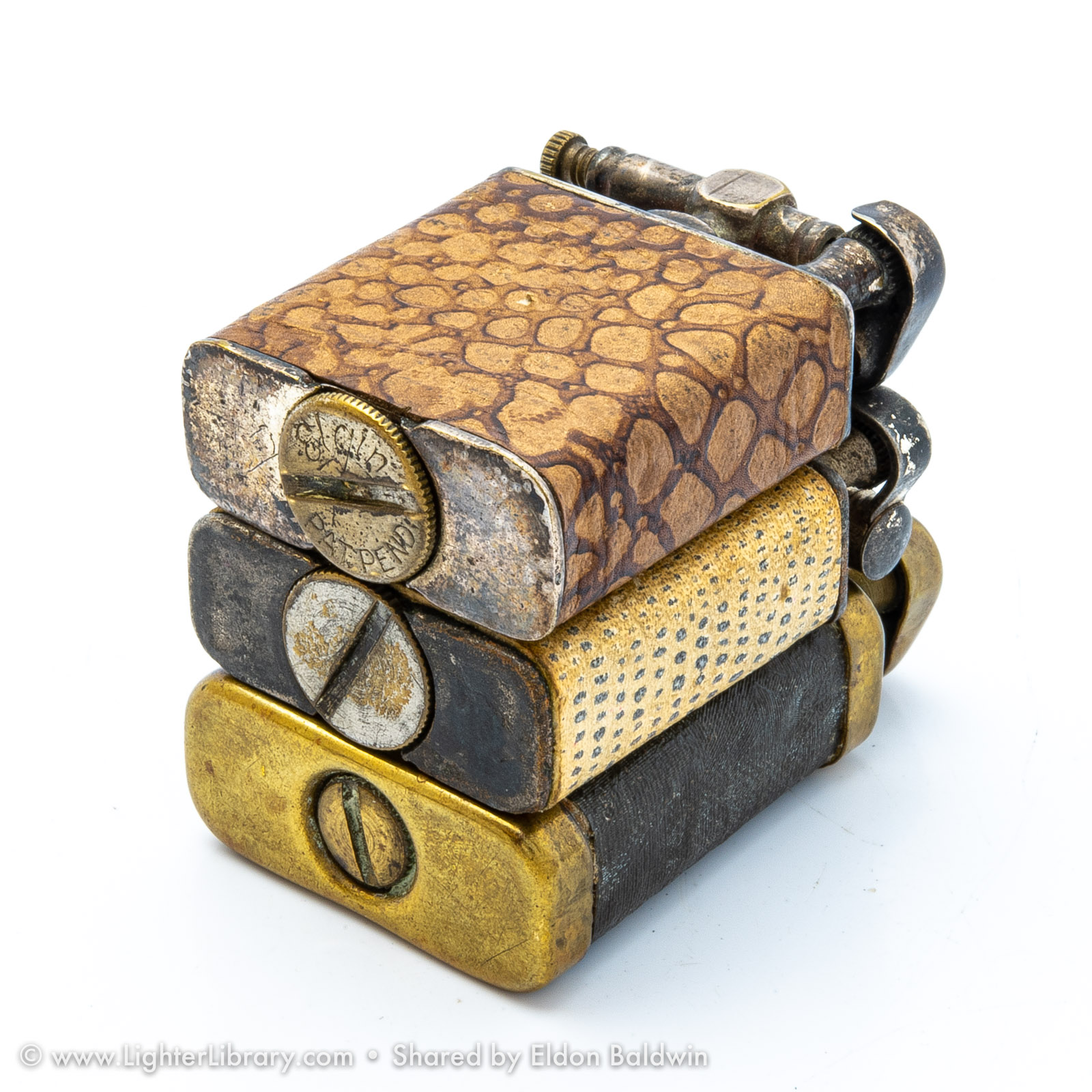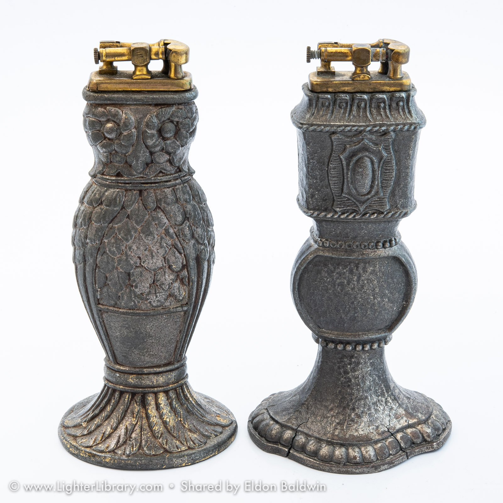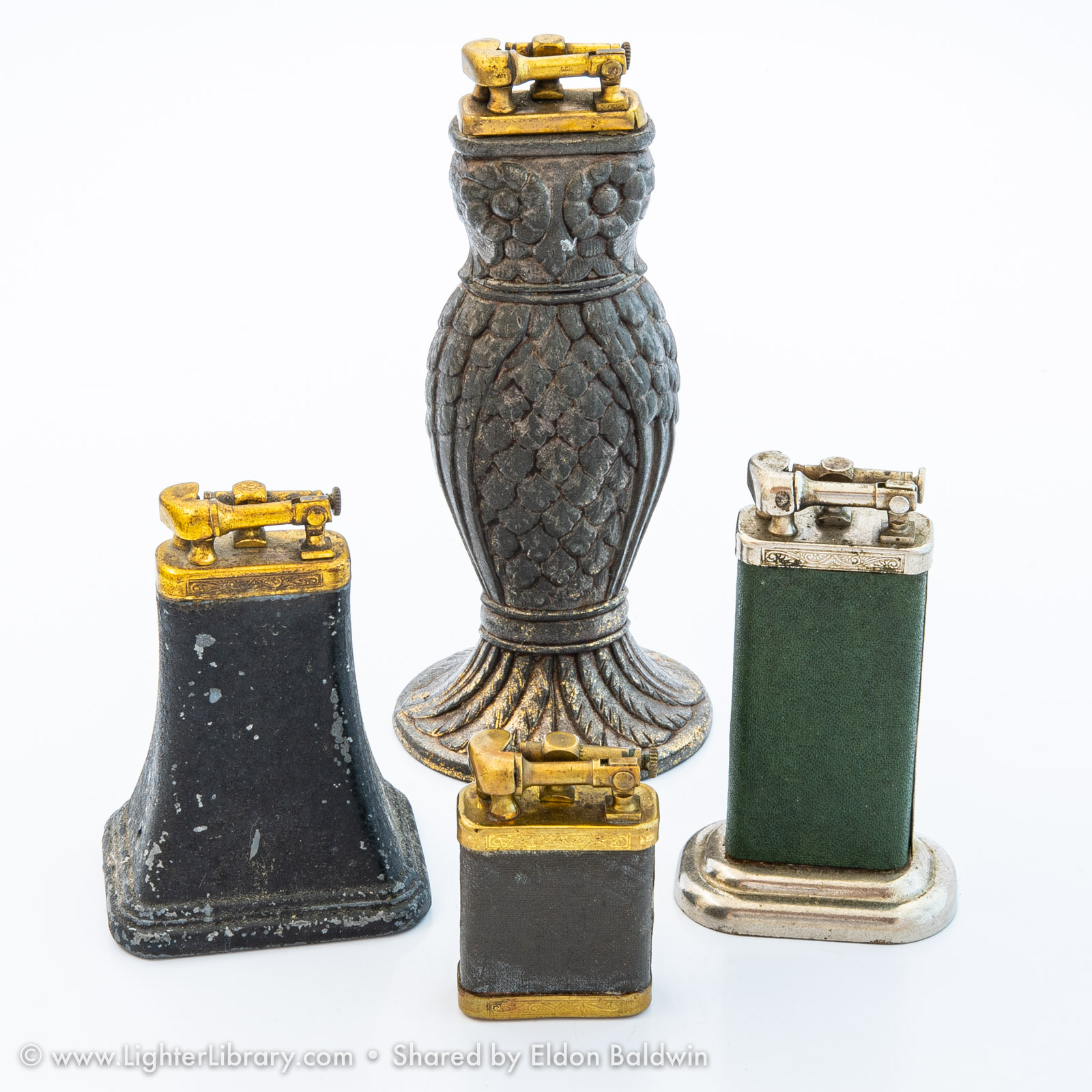Fay manufactured "Elgin" and several other pocket and table lighters based on the manual lighter mechanism shown in Henry Schiff's 1928 U.S. Design Patent 78315. Filed four months after USD77861, the patent drawing of the newer Shiff design shows a double bar lift arm mechanism with snuffer shaped to enclose the sparking wheel (a variation of the famous lift arm design patented by Greenwood & Wise in 1918). "Elgin" and "The Oakes Lighter" are two brandnames Fay used for some of these lighters, many models are unbranded. Fay produced table lighters using the body shapes and mechanism types shown in USD77861 and USD78315 interchangeably as well as eclectic array of other figural and decorative bases. (EB)