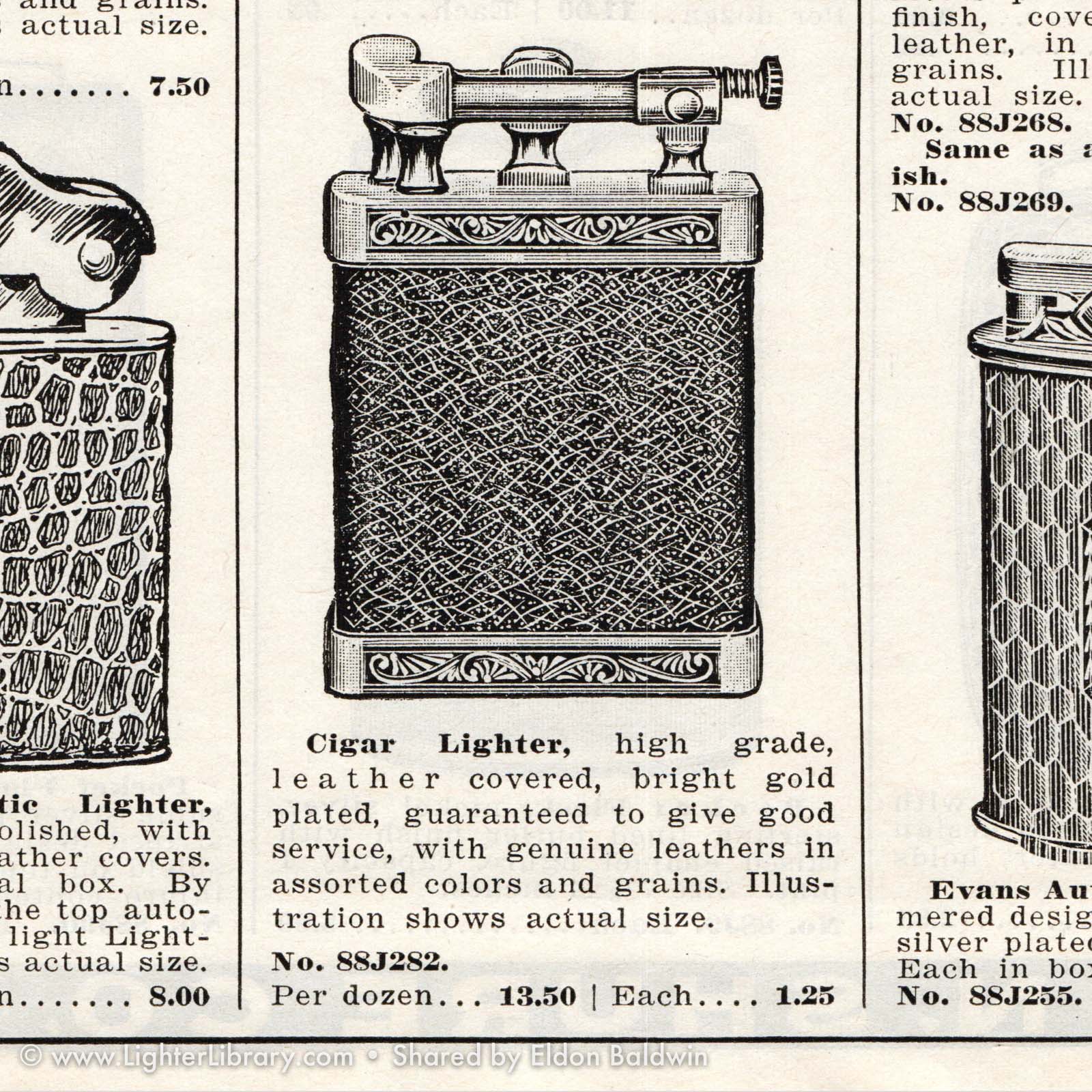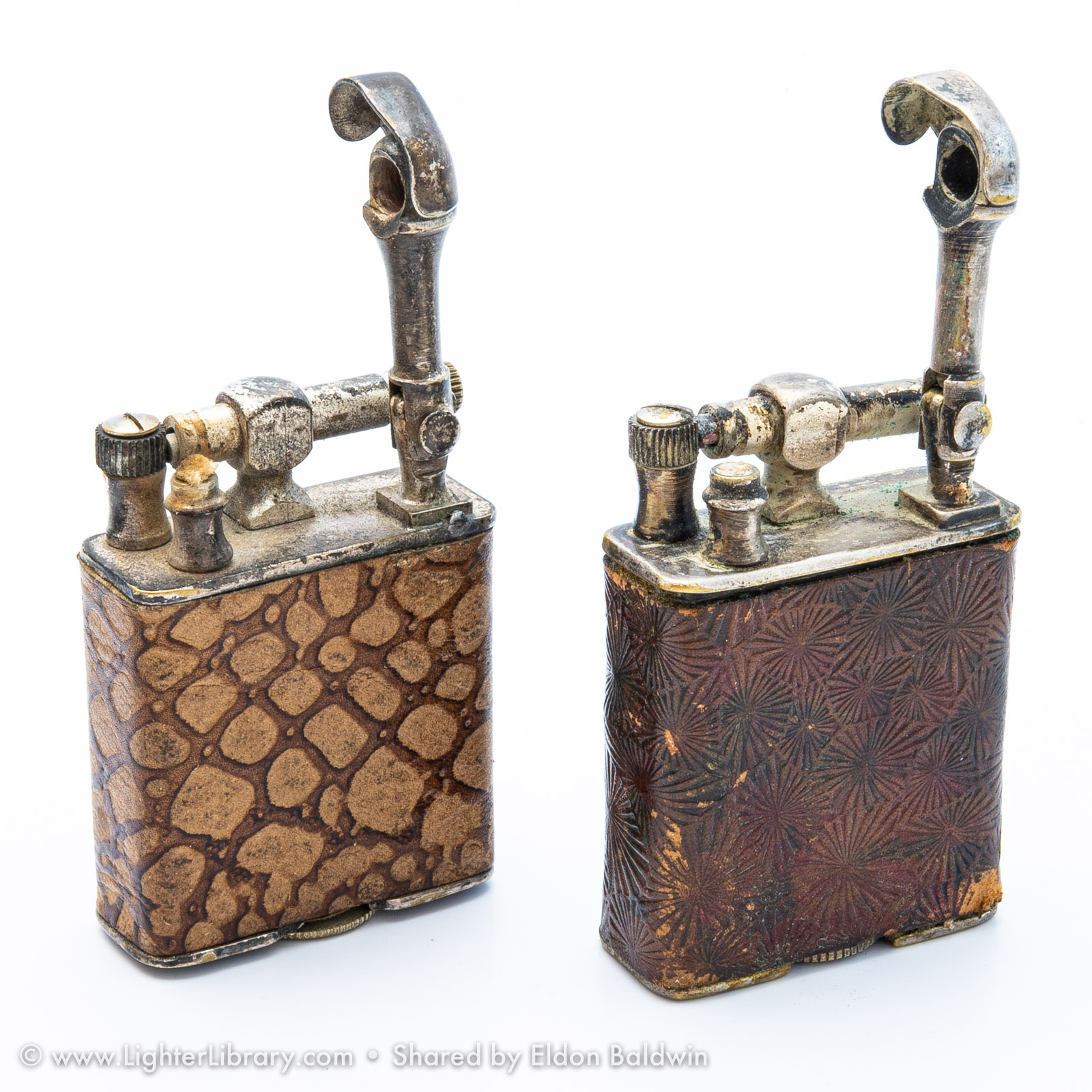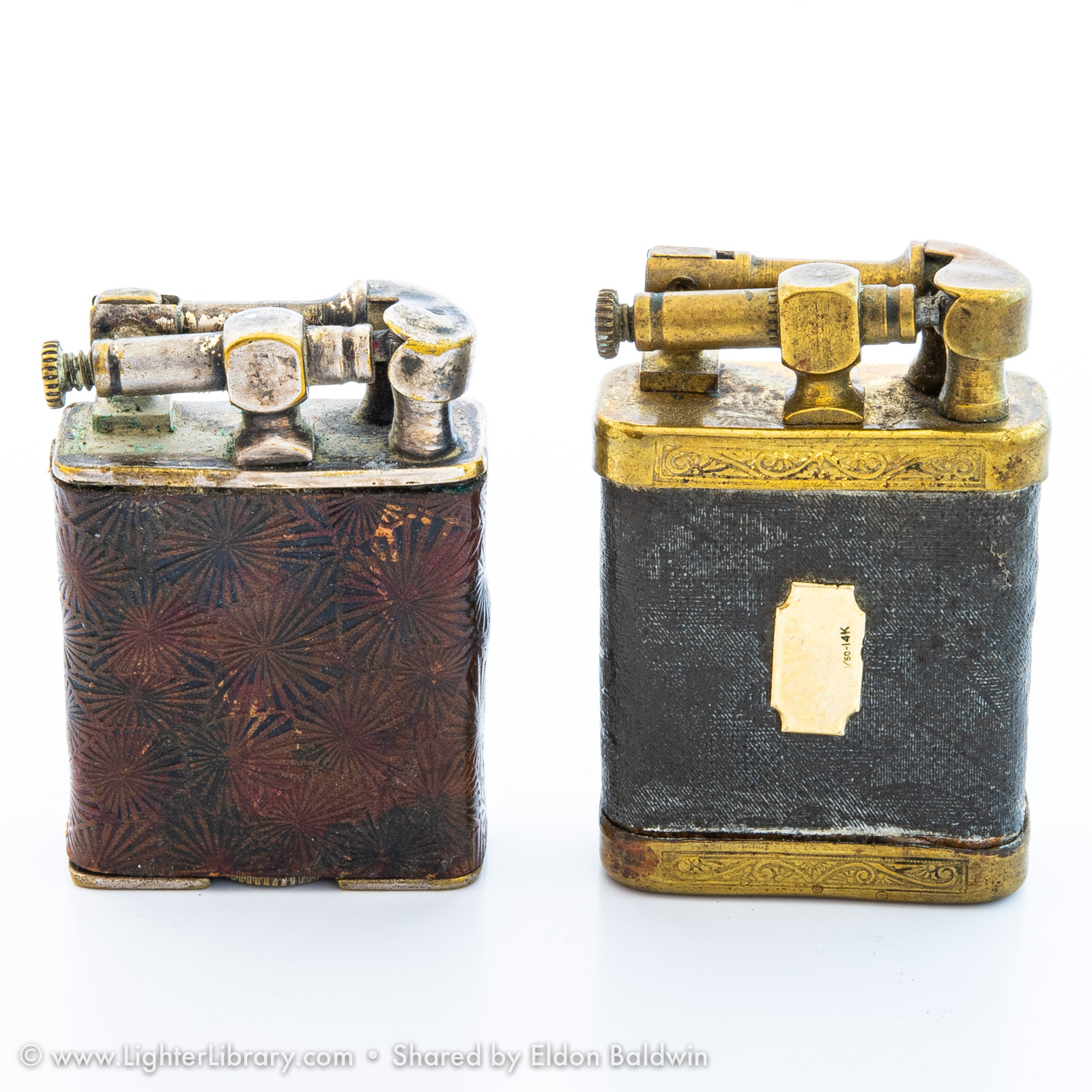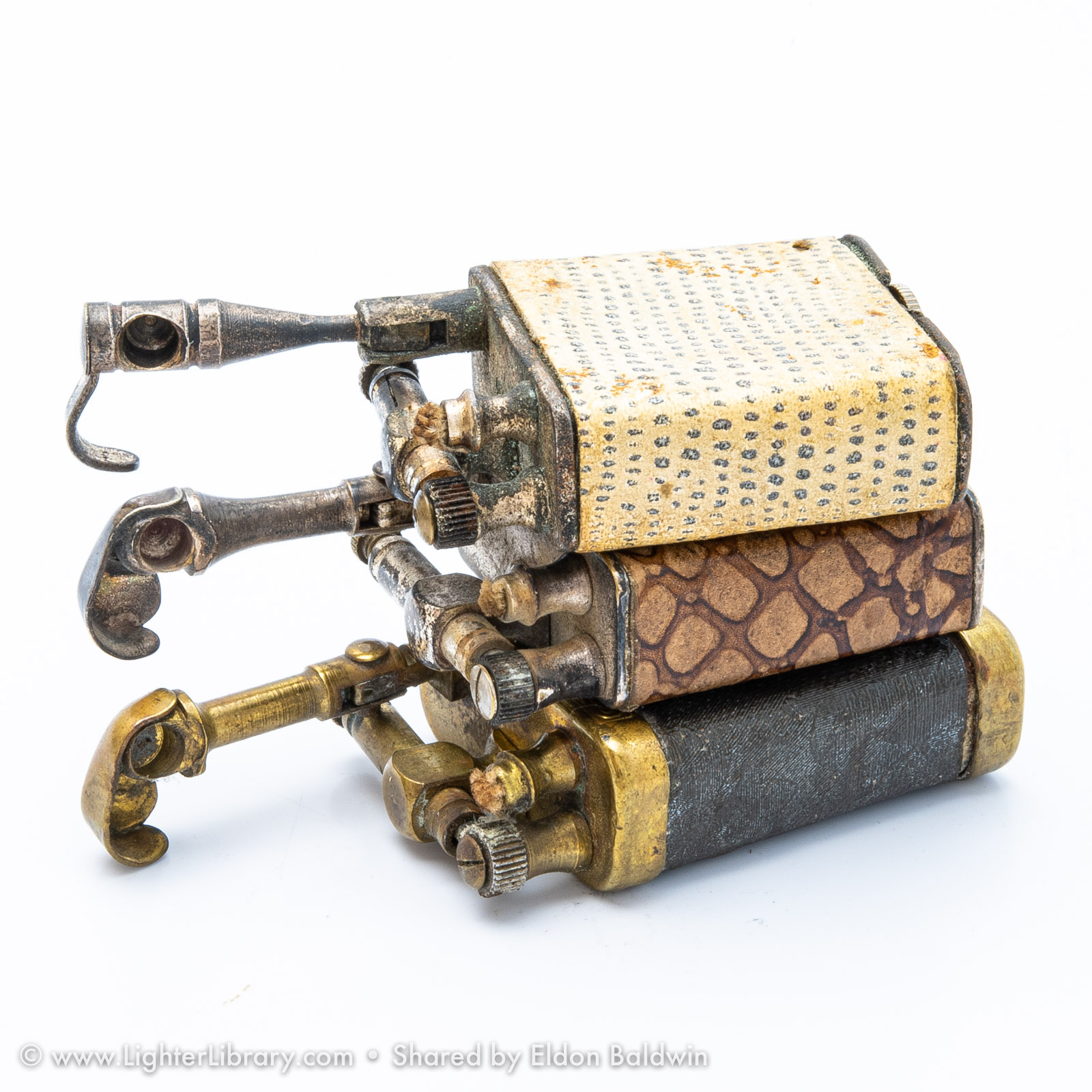 Fay manufactured "Elgin" and several other pocket and table lighters based on the manual lighter mechanism shown in Henry Schiff's 1928 U.S. Design Patent 78315. Filed four months after USD77861, the patent drawing of the newer Shiff design shows a double bar lift arm mechanism with snuffer shaped to enclose the sparking wheel (a variation of the famous lift arm design patented by Greenwood & Wise in 1918). "Elgin" and "The Oakes Lighter" are two brandnames Fay used for some of these lighters, many models are unbranded. Fay produced table lighters using the body shapes and mechanism types shown in USD77861 and USD78315 interchangeably as well as eclectic array of other figural and decorative bases. (EB)