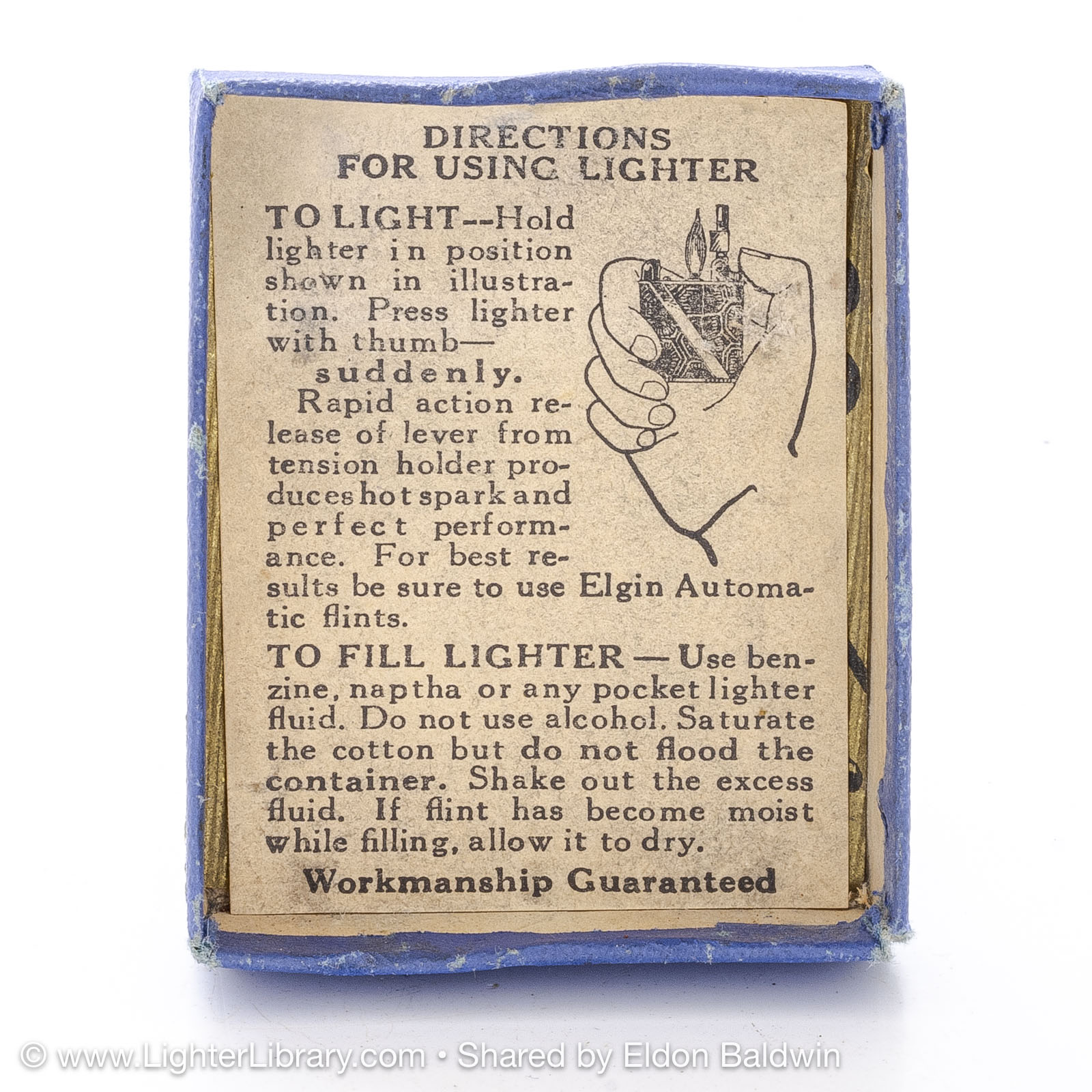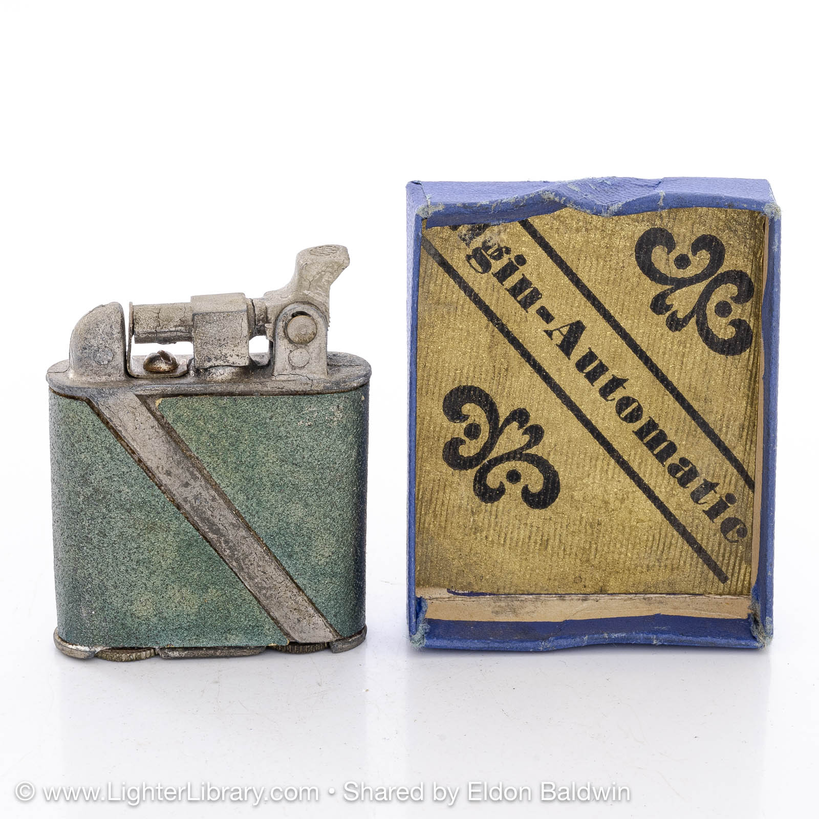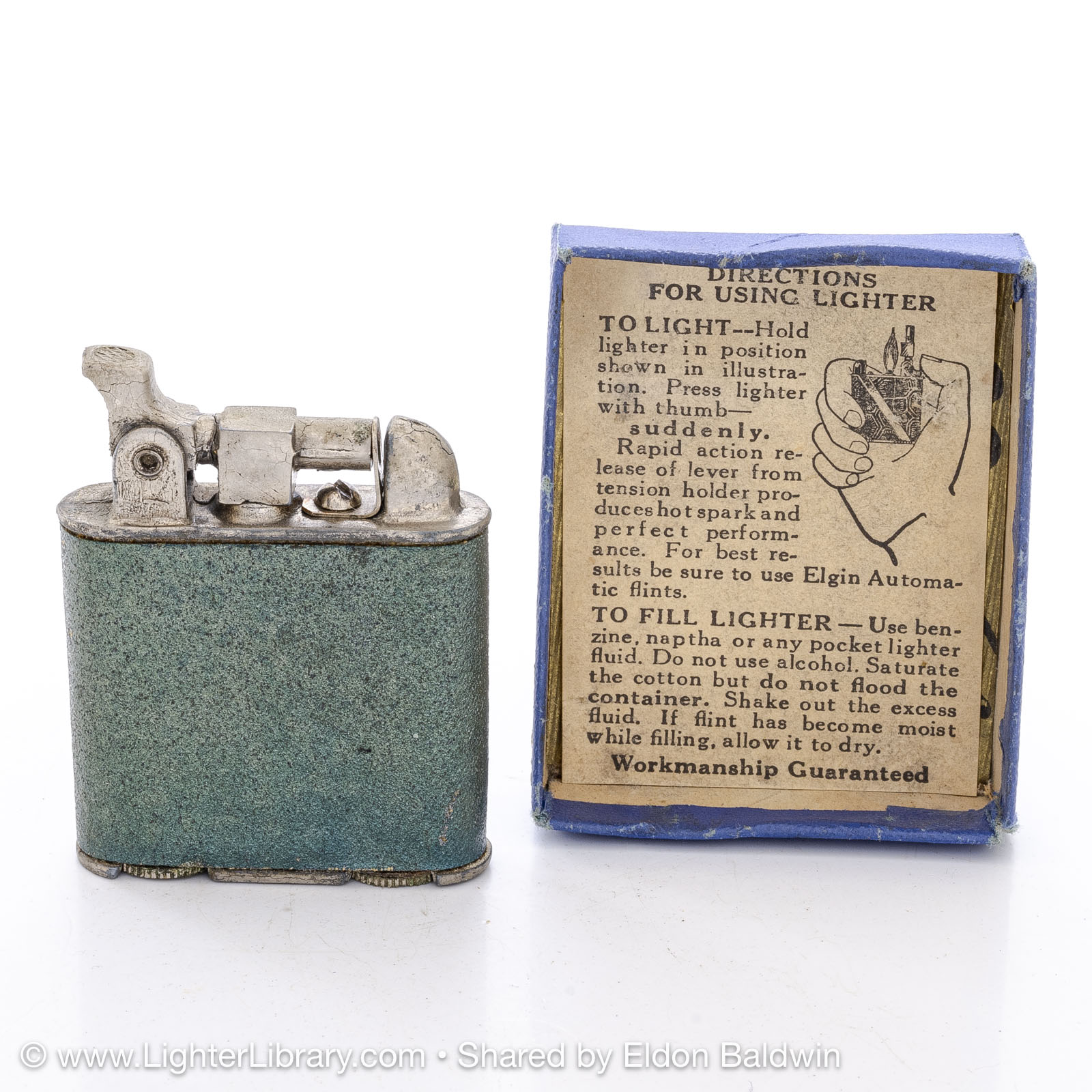 The Elgin-Automatic uses a simple, semi-automatic mechanism that's quite similar to the 1928 Carlton Automatic. Patented by Henry Schiff in 1929, Elgin Automatics are rare and known examples are unbranded. Like many lighters manufactured by Fay, the Elgin Automatic is made from alloy that can get brittle with age so they are often damaged and easily broken. (EB)