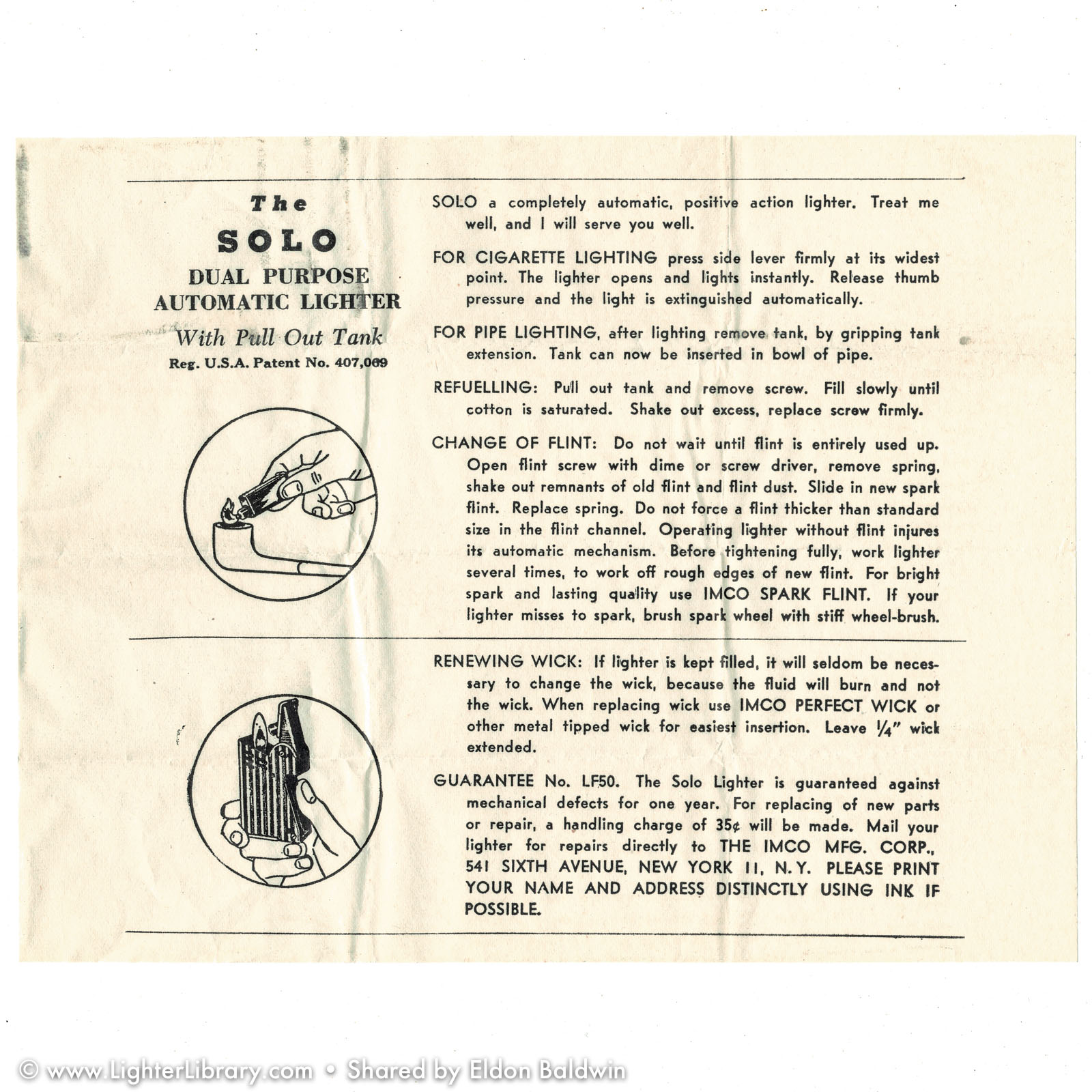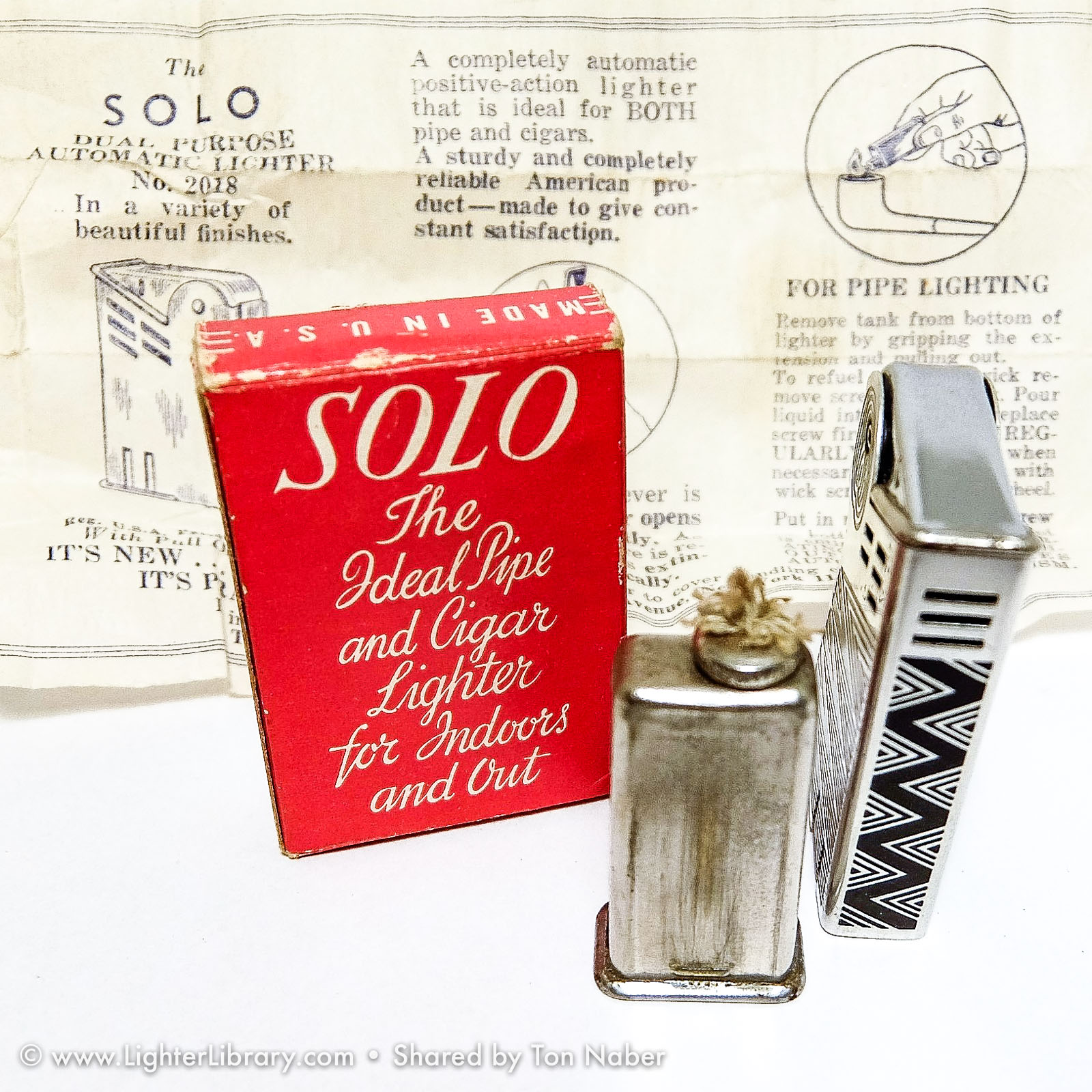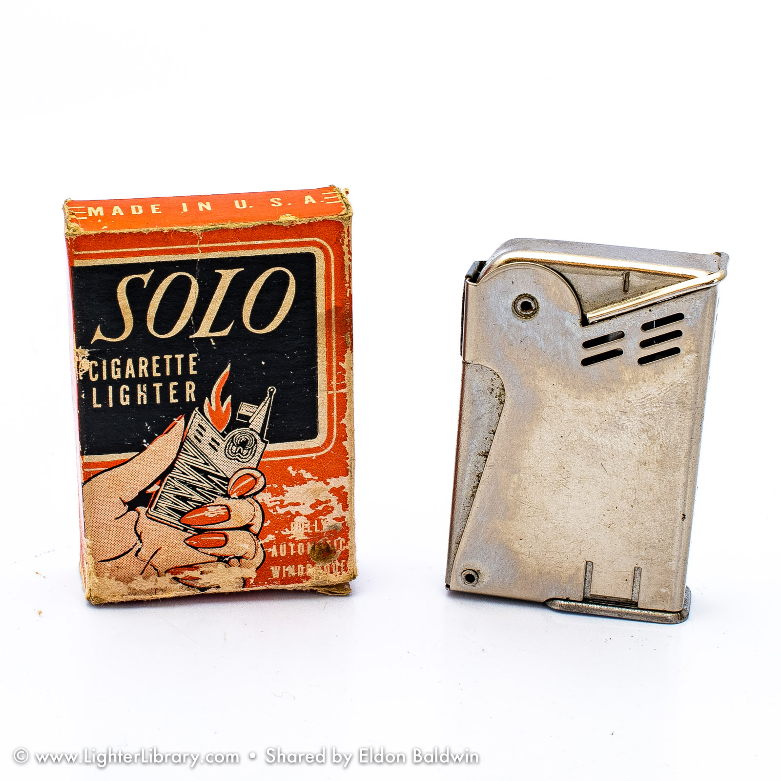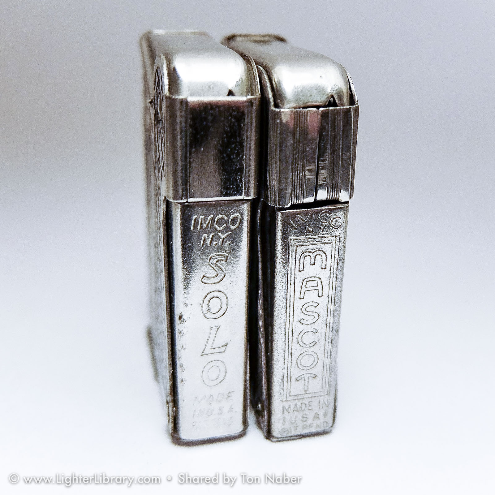The "Mascot" and "Solo" are both IMCO pocket lighters based on Julius Kohn's 1939 U.S. utility patent and manufactured in New York. Though patented and produced in the U.S., the general design and function of these lighter are Austrian in origin. Both lighters use full automatic side-press mechanisms popularized in the U.S. by Kaufmann-Balek. Like KB's Regens lighter, the IMCO Solo features a removable fuel tank for pipe smokers. A lesser-known variation of the same design, the IMCO Mascot has a forward-sliding fuel tank illustrated on page 2 of Kohn's U.S. patent drawing -- a feature designed in 1935 and patented in Austria by Karl Bernhardt. (EB)