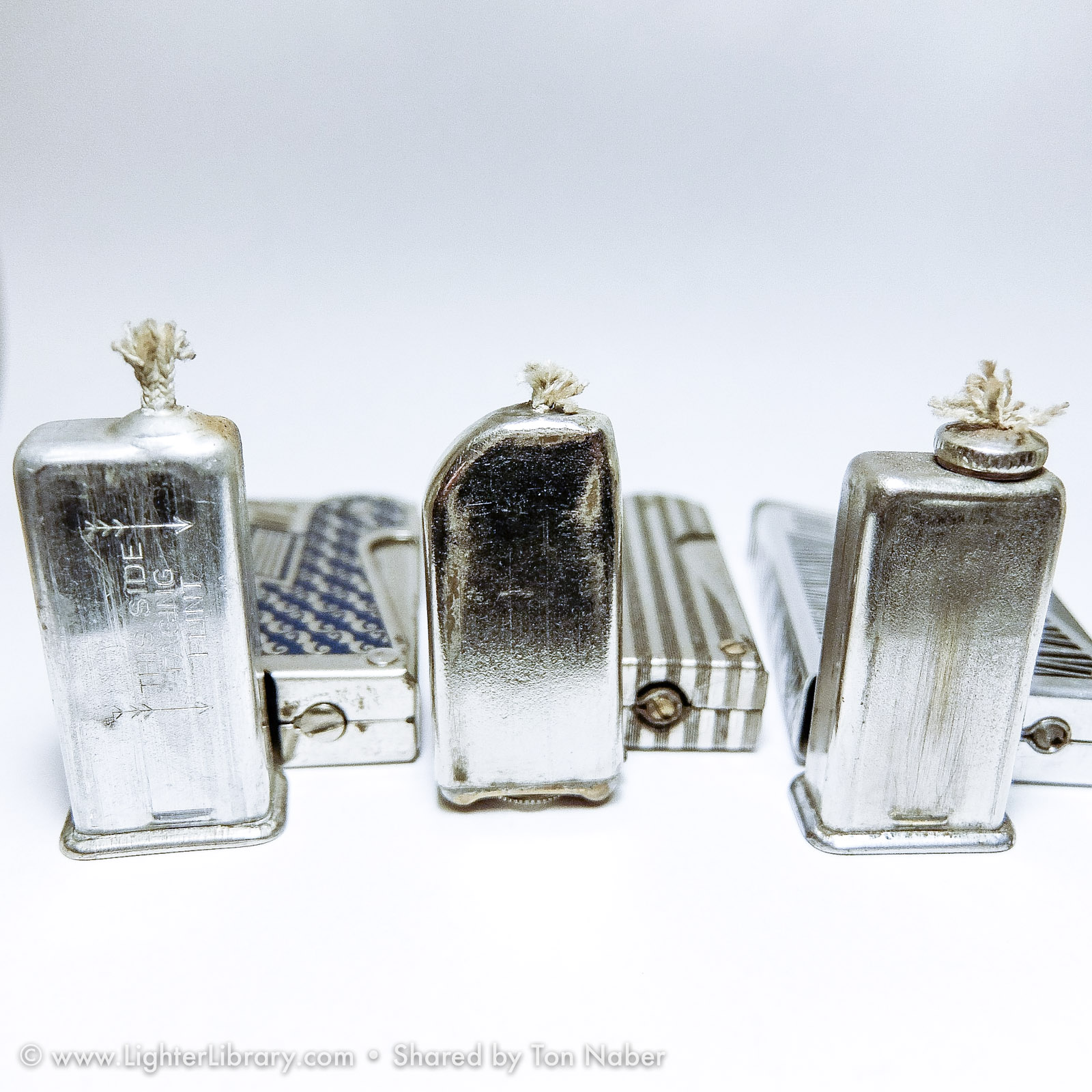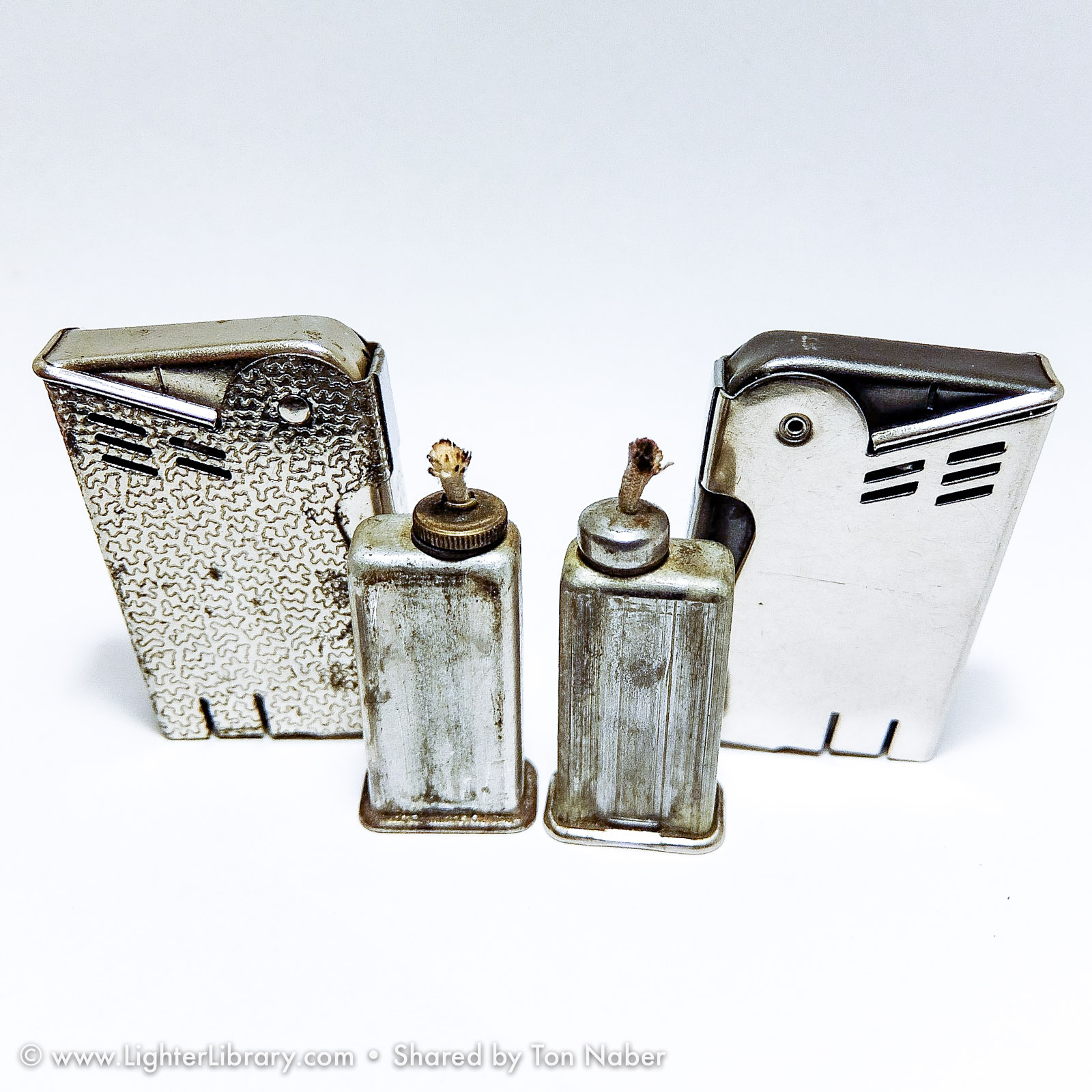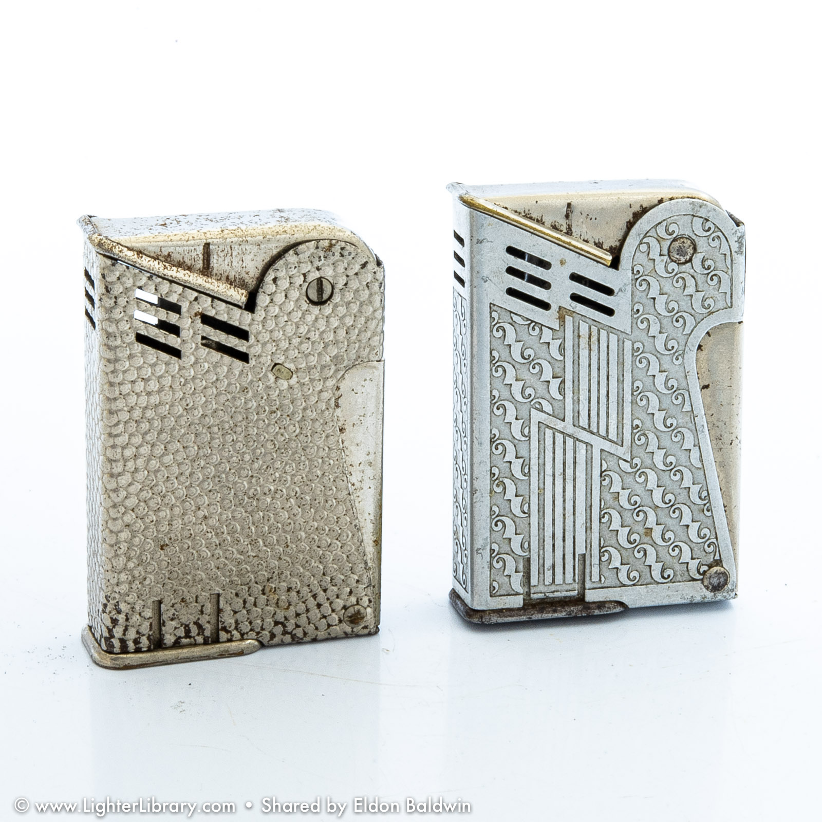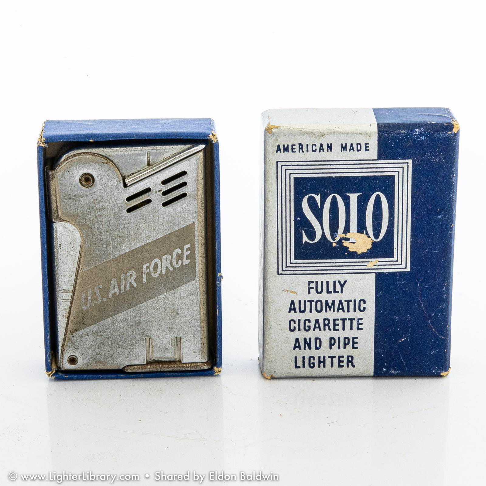 The "Mascot" and "Solo" are both IMCO pocket lighters based on Julius Kohn's 1939 U.S. utility patent and manufactured in New York. Though patented and produced in the U.S., the general design and function of these lighter are Austrian in origin. Both lighters use full automatic side-press mechanisms popularized in the U.S. by Kaufmann-Balek. Like KB's Regens lighter, the IMCO Solo features a removable fuel tank for pipe smokers. A lesser-known variation of the same design, the IMCO Mascot has a forward-sliding fuel tank illustrated on page 2 of Kohn's U.S. patent drawing -- a feature designed in 1935 and patented in Austria by Karl Bernhardt. (EB)