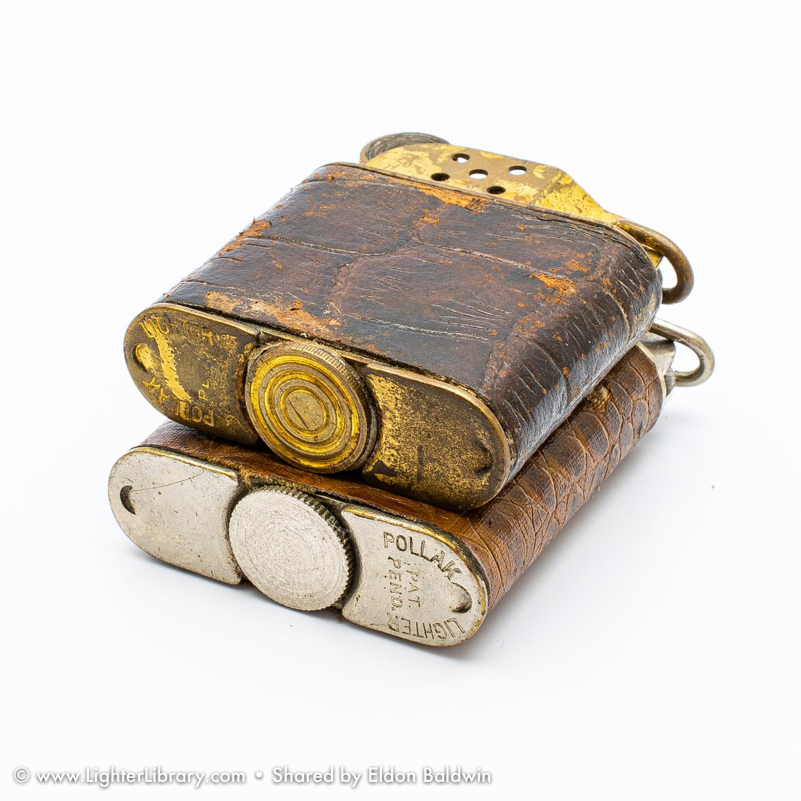 The Pollak Pickwick is a single bar lift arm pocket lighter that was offered in two sizes. Its design features include an enlarged decorative thumbwheel, windguard and affixed chain loop. The Pickwick name is not branded on these lighters, it is used in 1929 advertising.