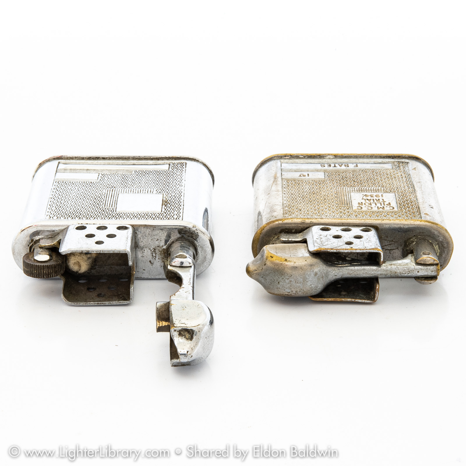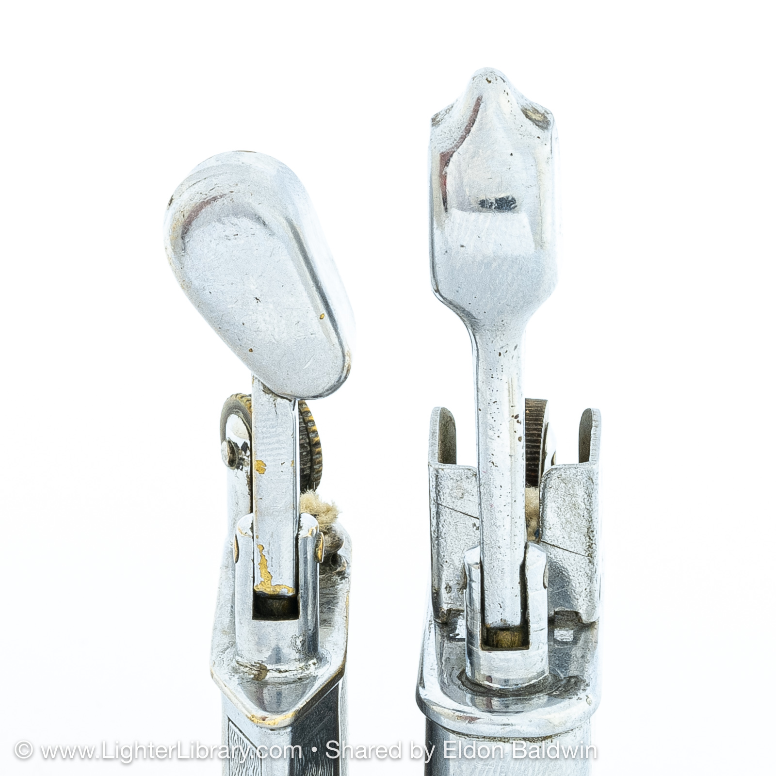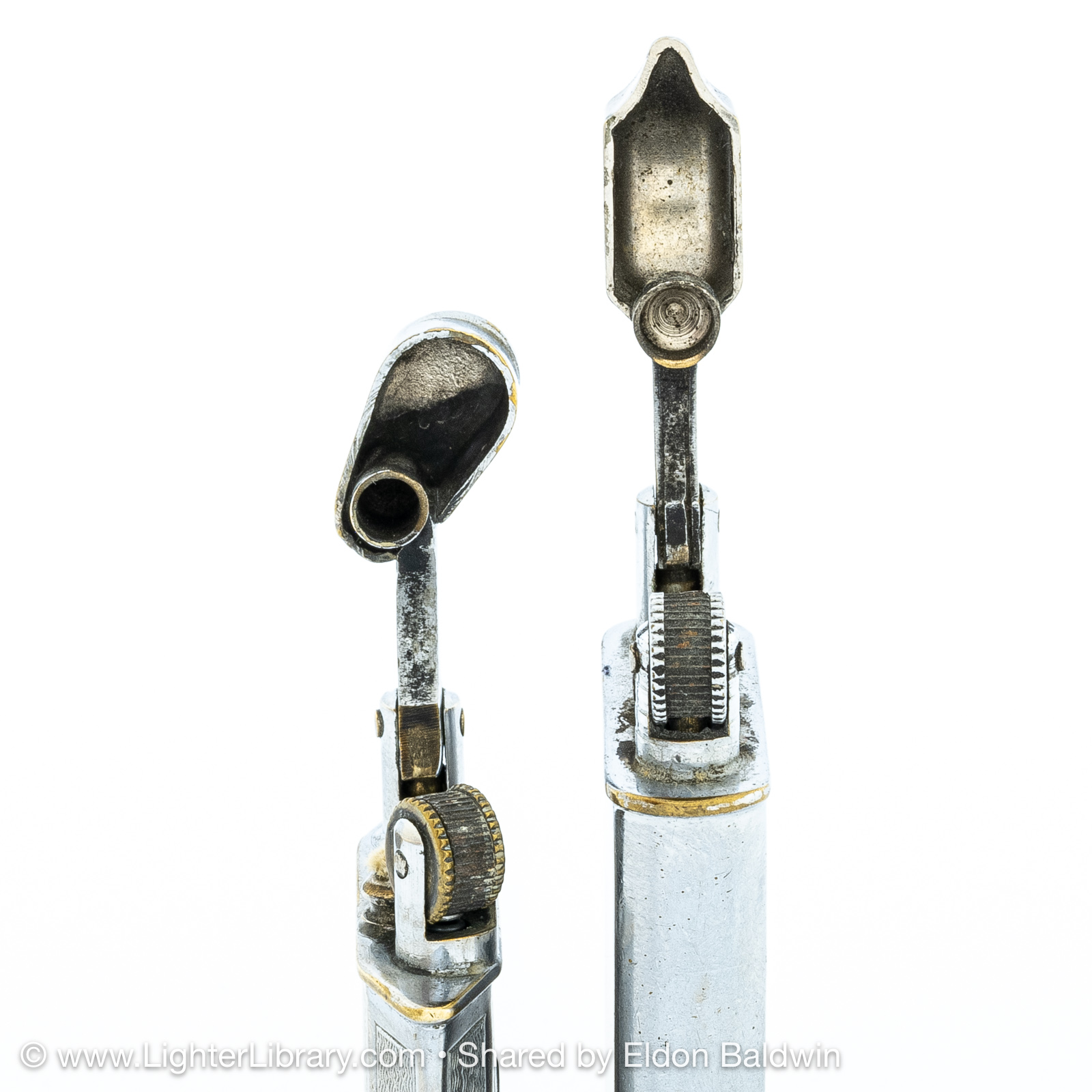 Produced during the 1930s, Polo single bar lift arm models are largely undocumented. Factory-assigned names for these Polo models are currently unknown, "single bar lift arm" is simply a physical description. Different models were produced with straight and angled snuffers. Straight snuffer models were offered in at least two sizes, with optional wind guard, and screw-on bases for table use. The angled snuffer models have this shape because of the unique off-center orientation of the thumbwheel. (EB)