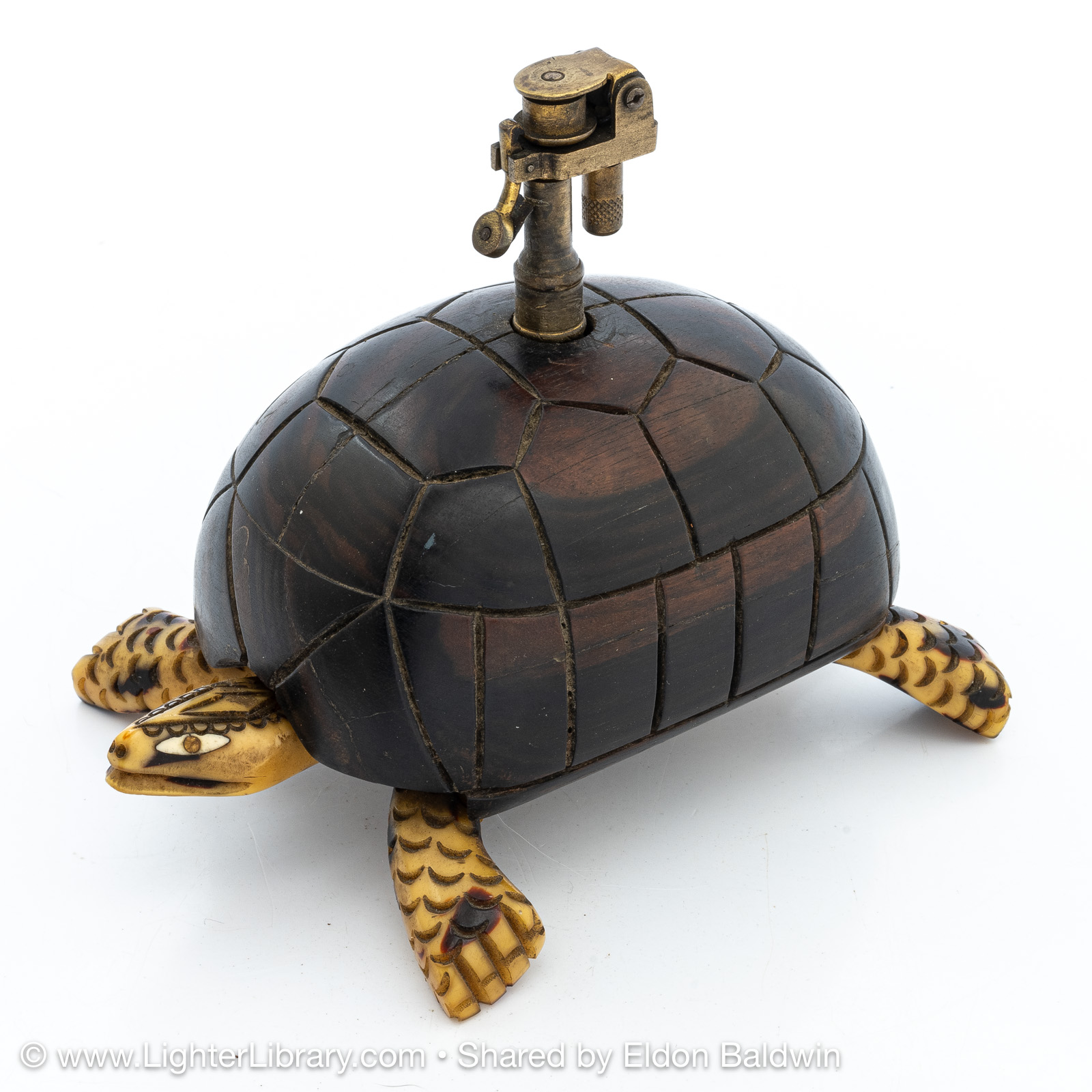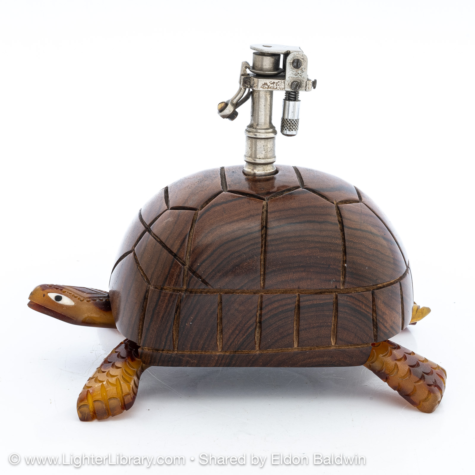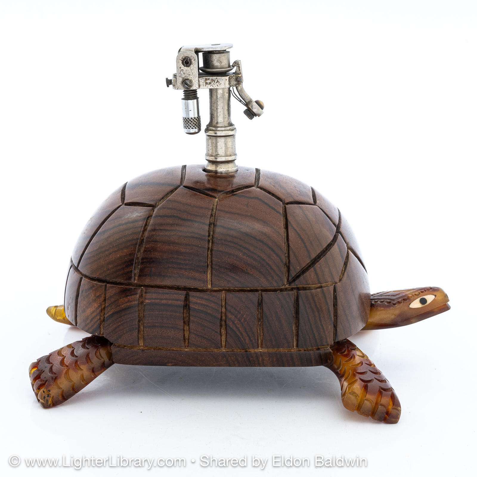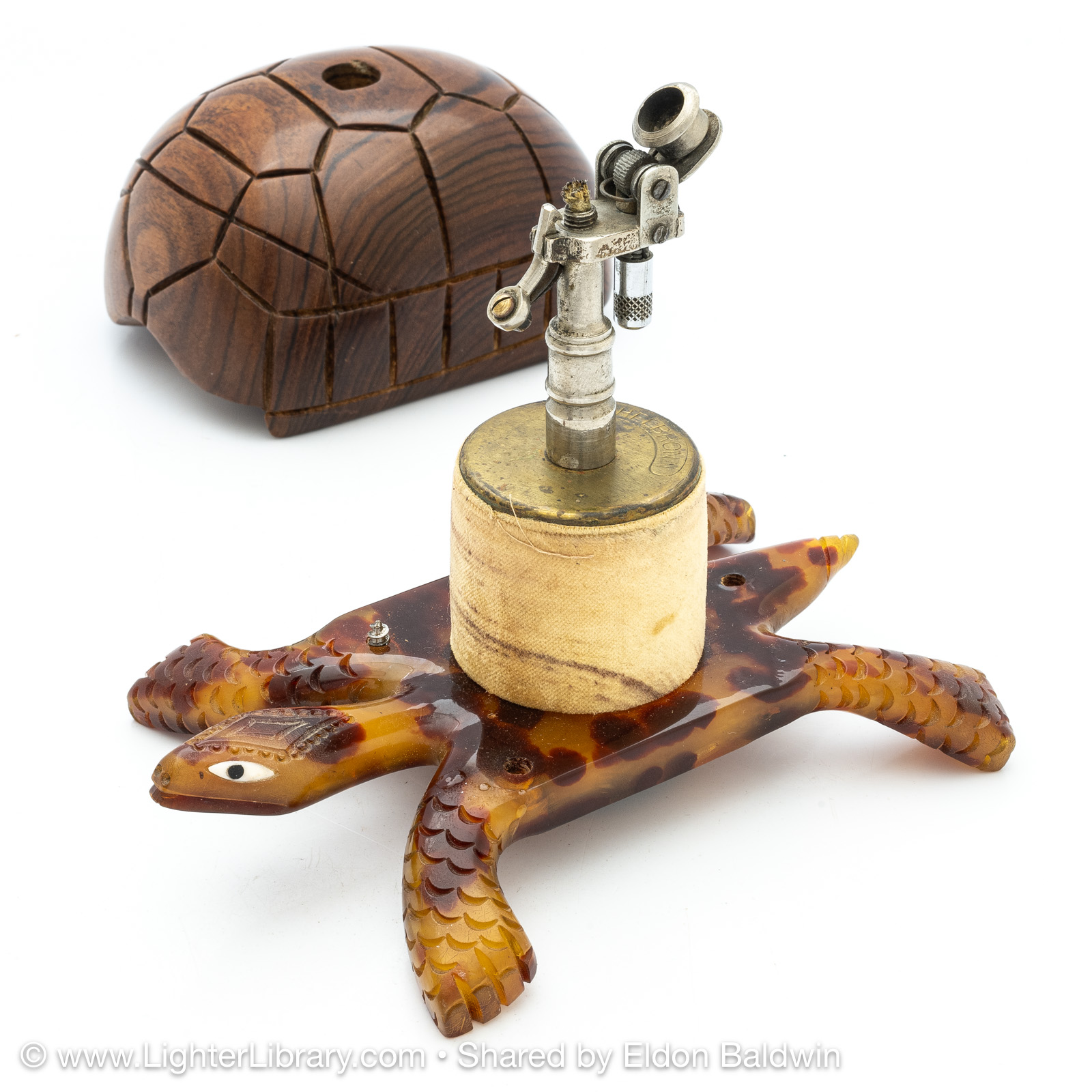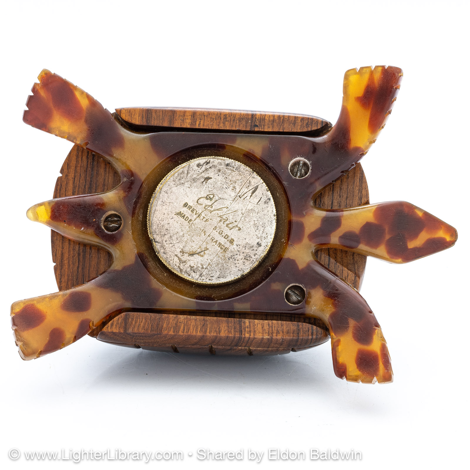 Produced during the 1930s, these figural tortoise table lighters are comprised of an Éclair Model 702 mounted into a plastic casting of the creature's head, feet and tail adorned with a solid exotic wood shell. Quercia produced different versions of the Tortue with articulating and fixed heads. The articulating version has a hexagonal head shape, fixed version have a diamond head shape. The mechanisms were offered with assorted plated finishes, different colors were used for the plastic extremities, ebony and palm wood species were offered for the shell. (EB)