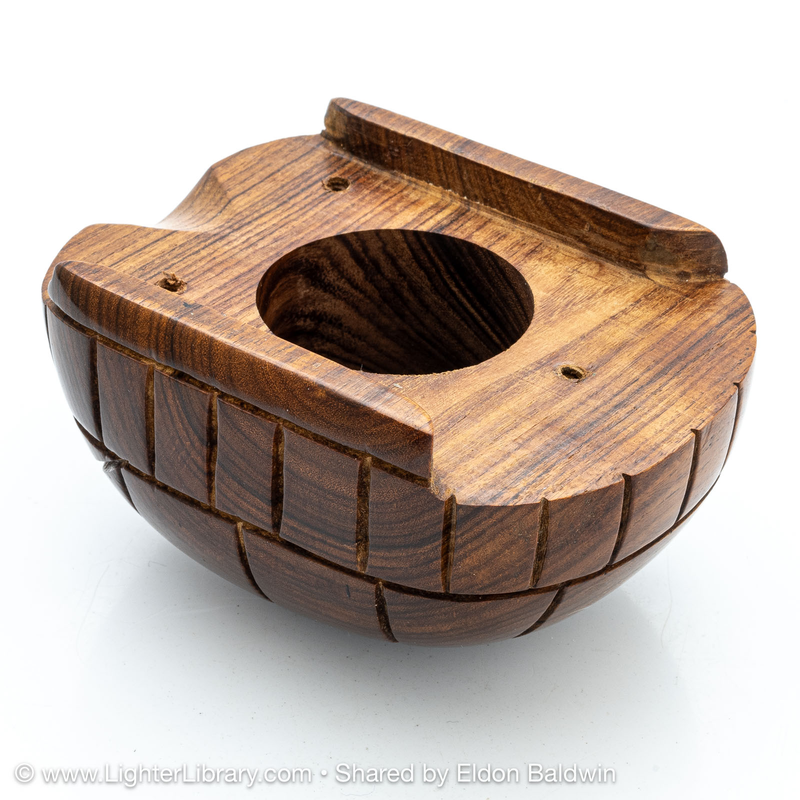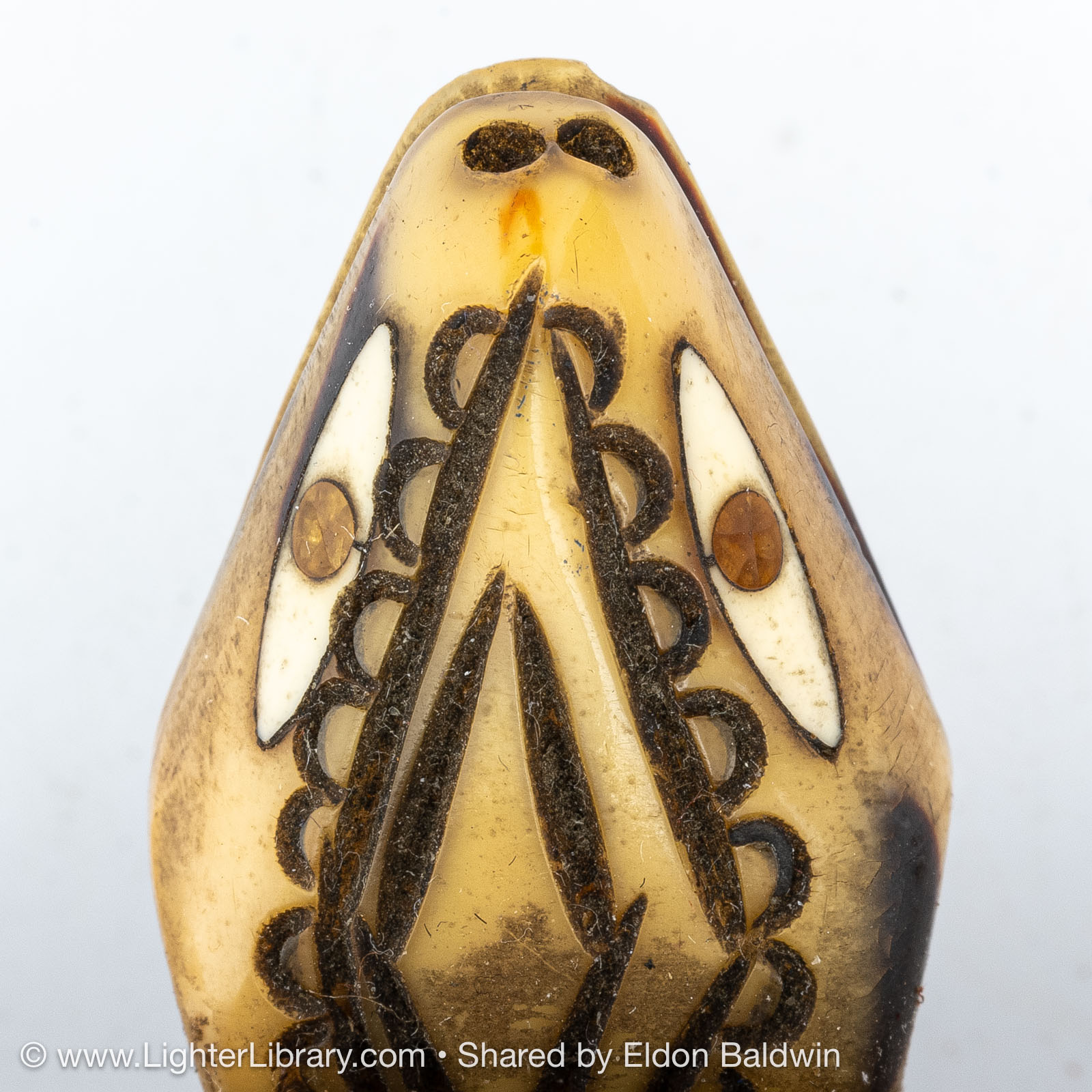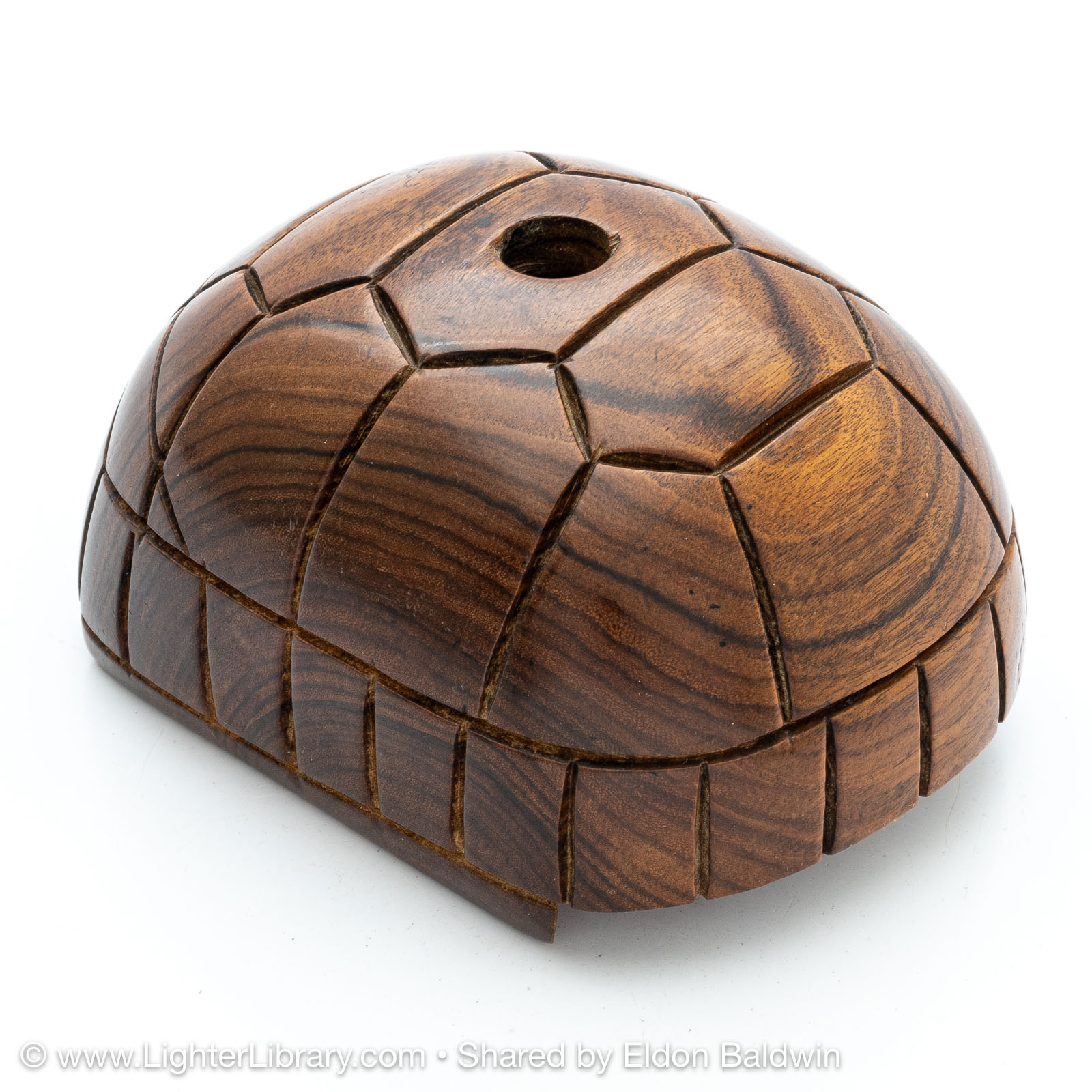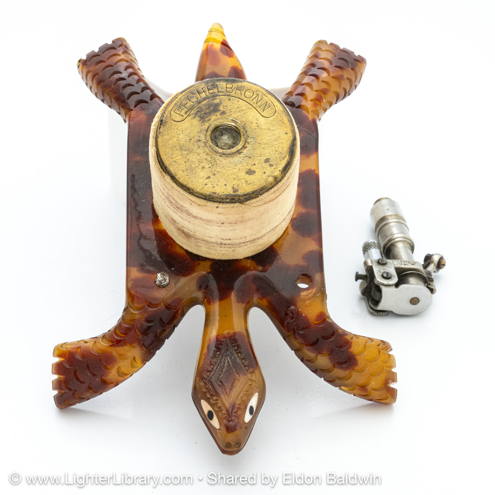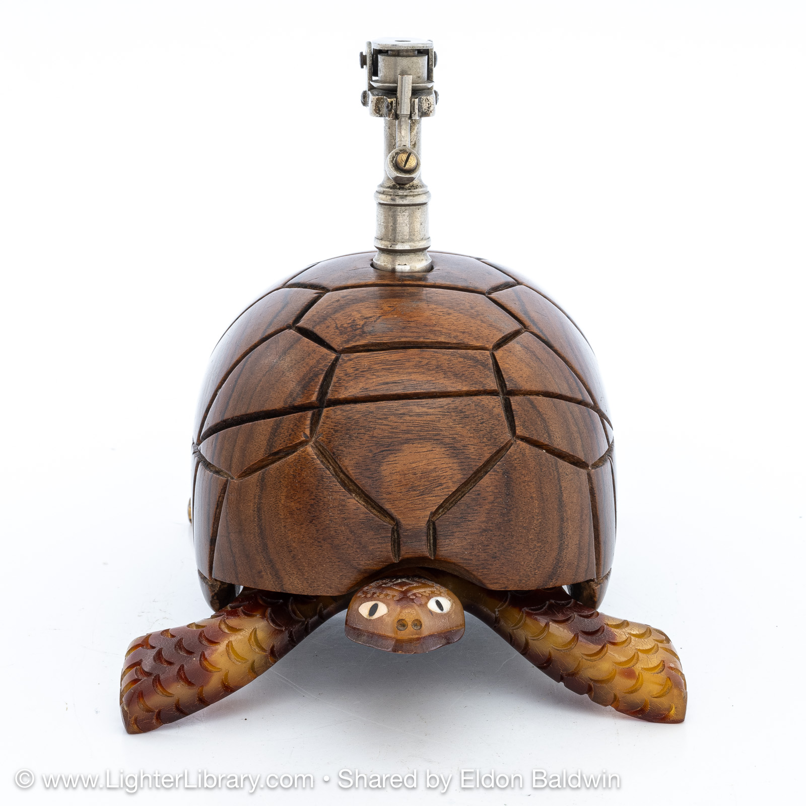 Produced during the 1930s, these figural tortoise table lighters are comprised of an Éclair Model 702 mounted into a plastic casting of the creature's head, feet and tail adorned with a solid exotic wood shell. Quercia produced different versions of the Tortue with articulating and fixed heads. The articulating version has a hexagonal head shape, fixed version have a diamond head shape. The mechanisms were offered with assorted plated finishes, different colors were used for the plastic extremities, ebony and palm wood species were offered for the shell. (EB)