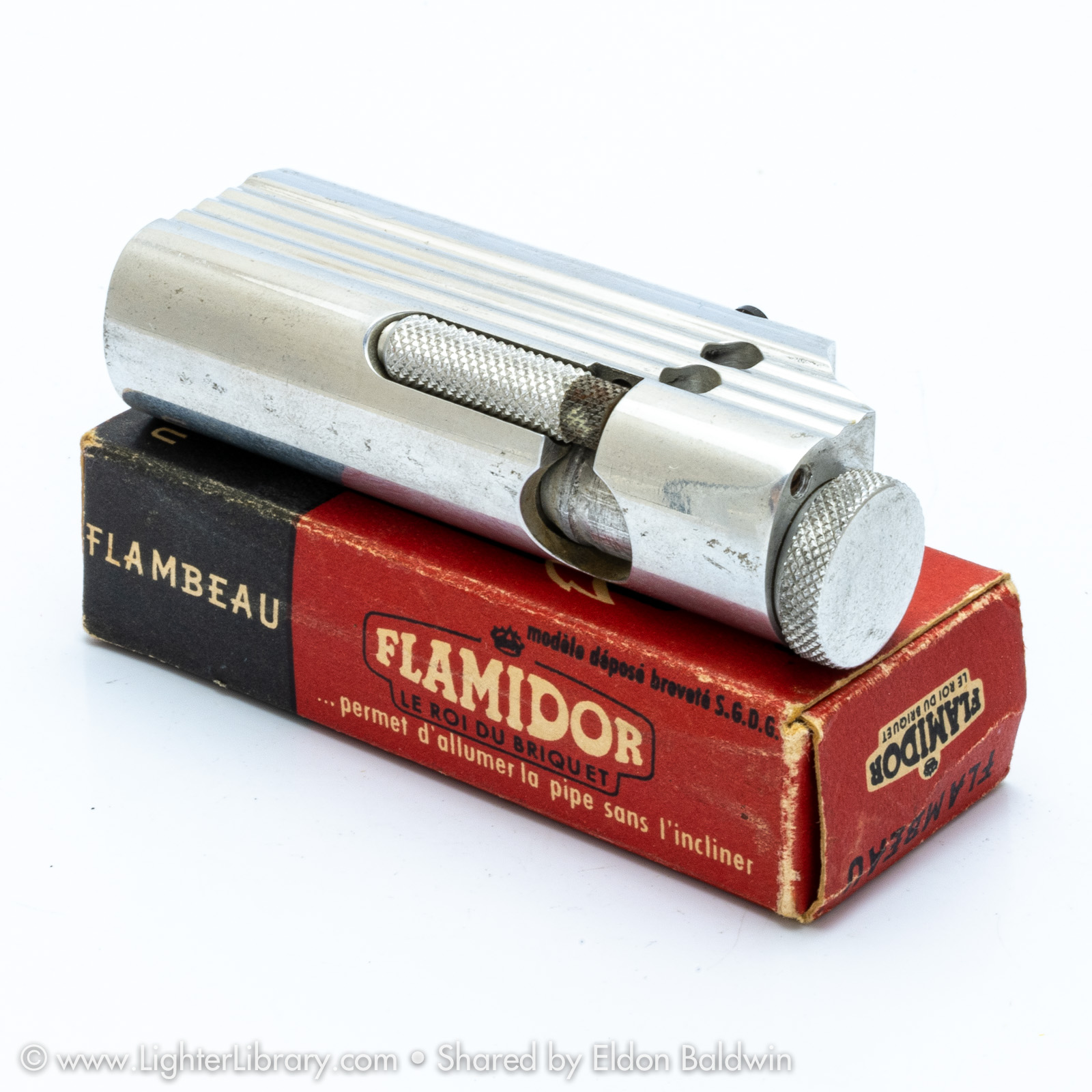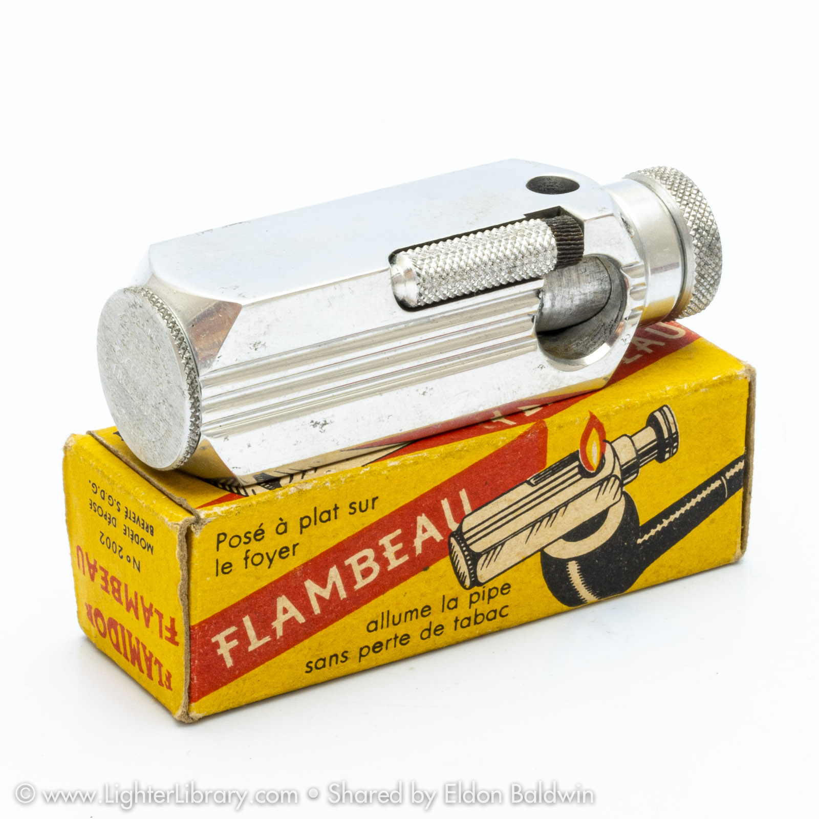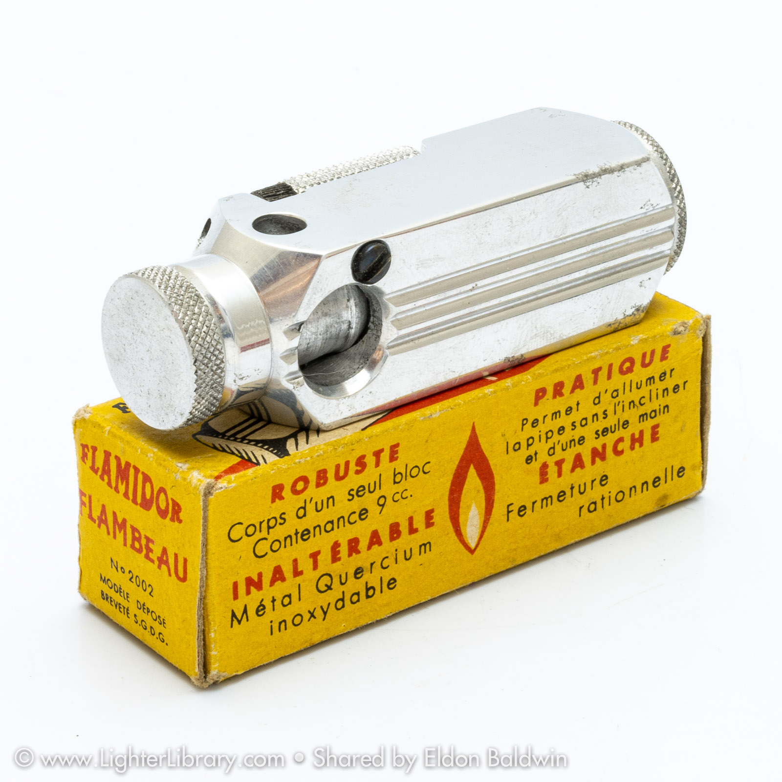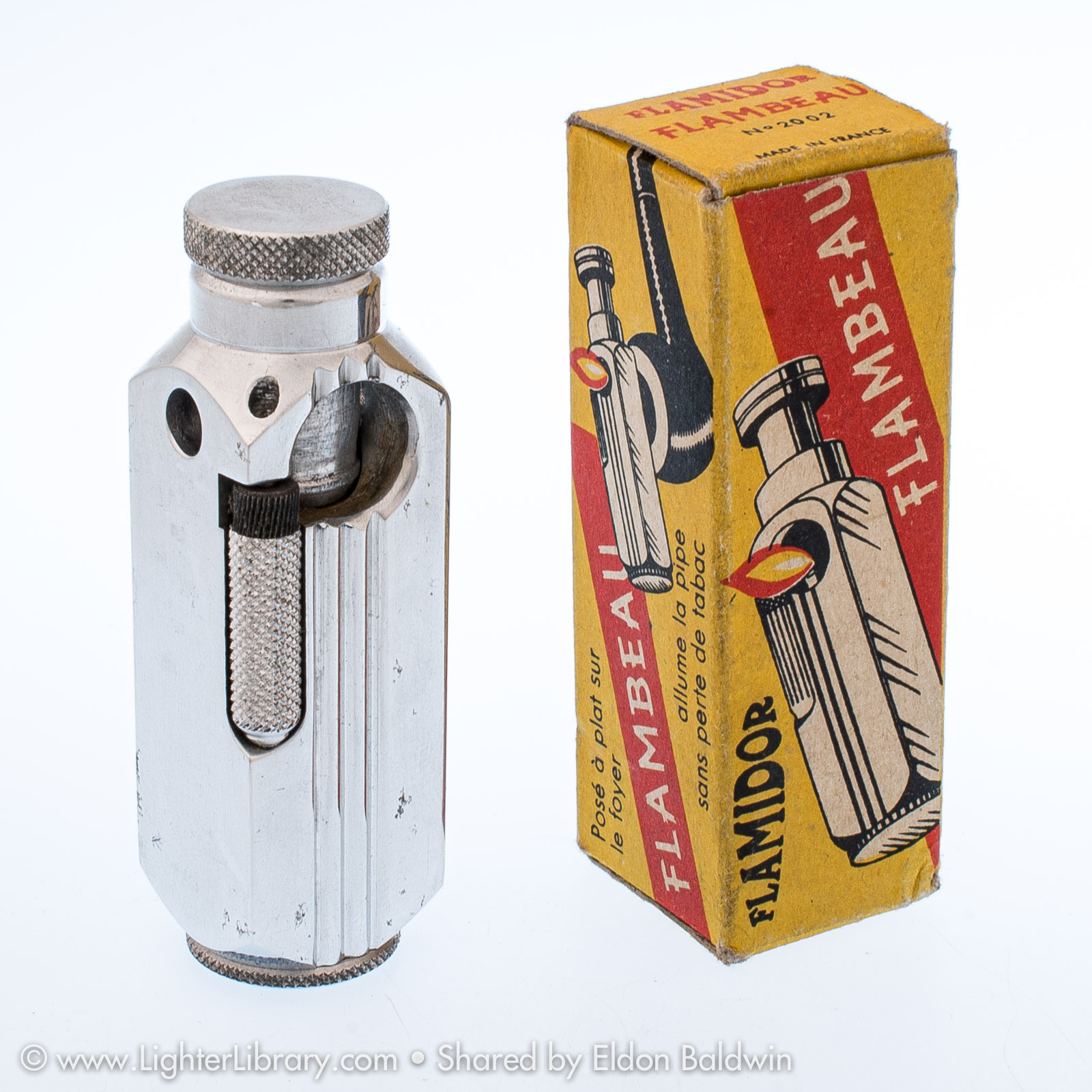 Patented in 1948, at least two versions of the Flambeau were produced. Very similar to the patent drawing, no.2002 is the most commonly seen Flambeau model. Model no.2006 features an asymmetric body shape but functions similarly. An unbranded and undocumented miniature version was also produced featuring a hexagonal body shape. Whether this mini Flambeau is an authentic Flamidor model or a copy. (EB)