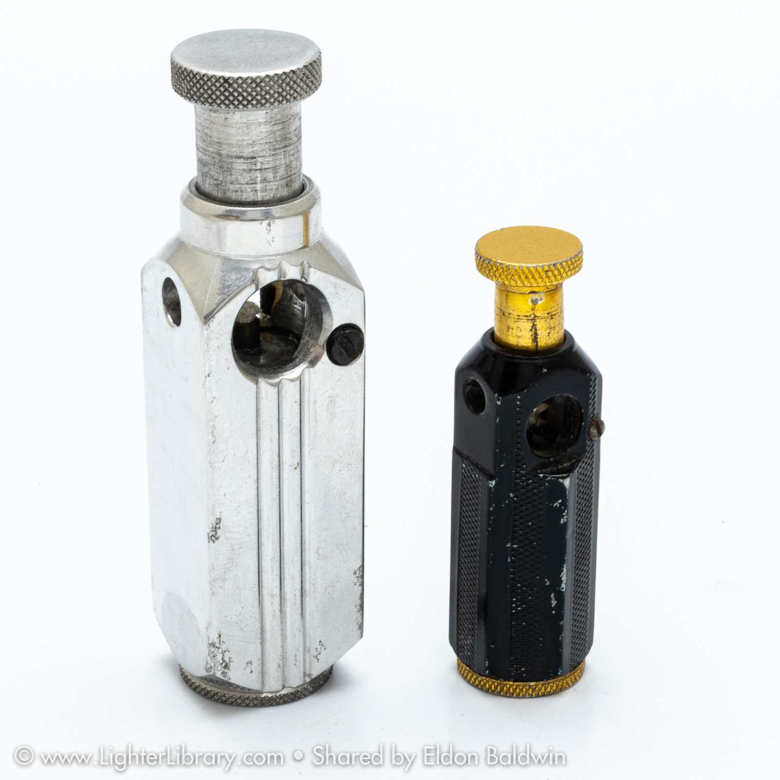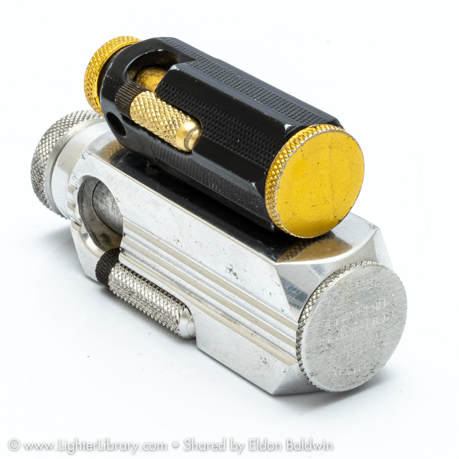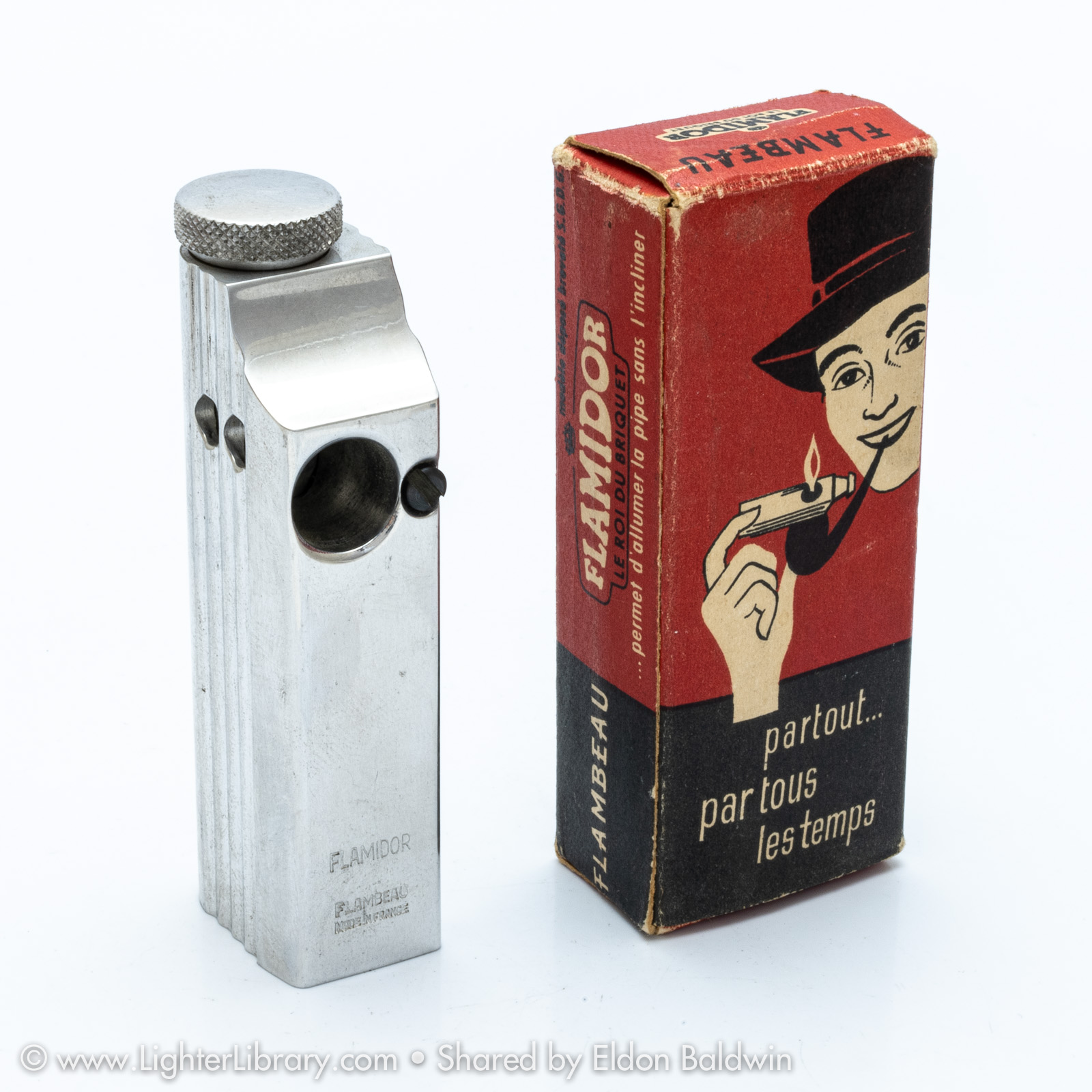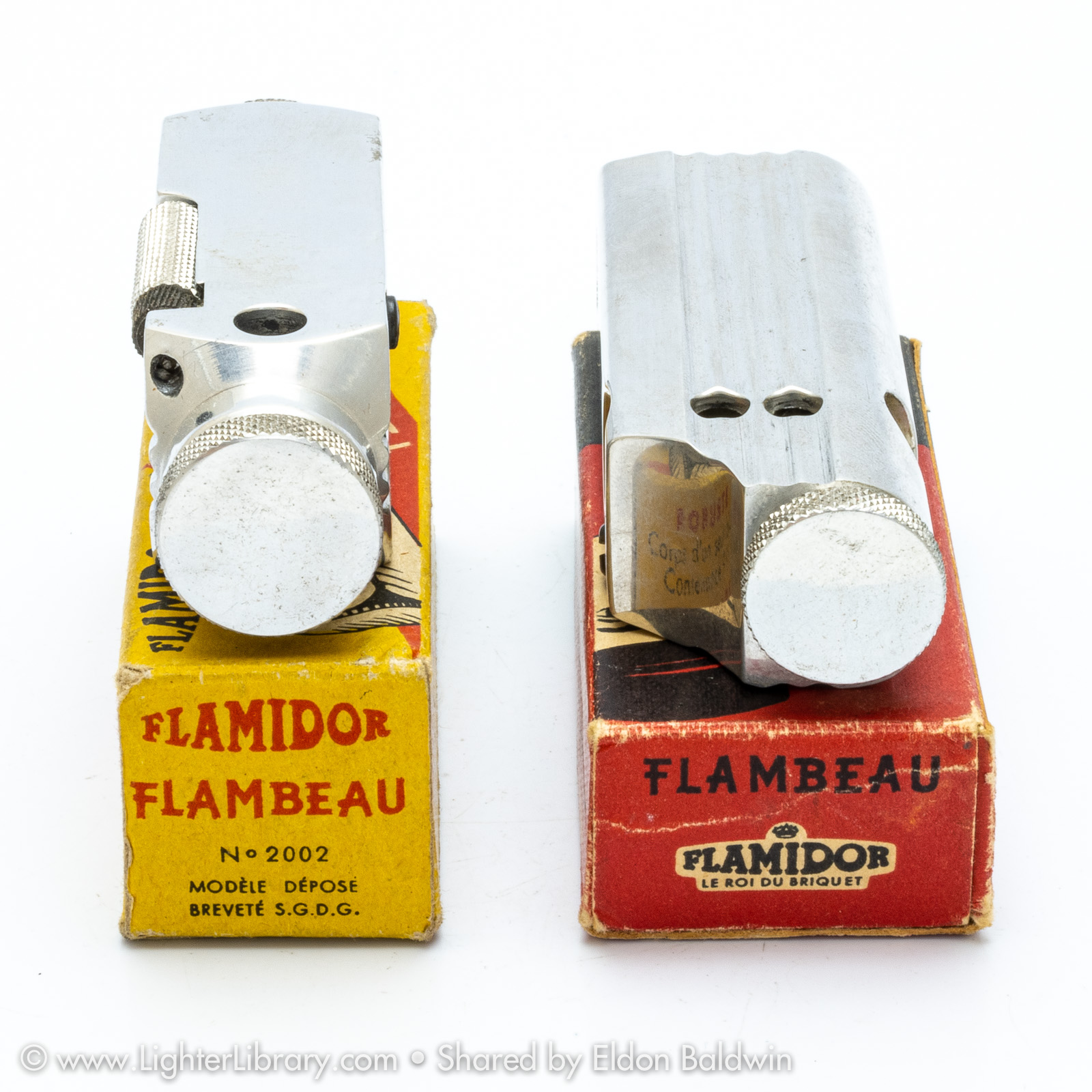 Patented in 1948, at least two versions of the Flambeau were produced. Very similar to the patent drawing, no.2002 is the most commonly seen Flambeau model. Model no.2006 features an asymmetric body shape but functions similarly. An unbranded and undocumented miniature version was also produced featuring a hexagonal body shape. Whether this mini Flambeau is an authentic Flamidor model or a copy. (EB)