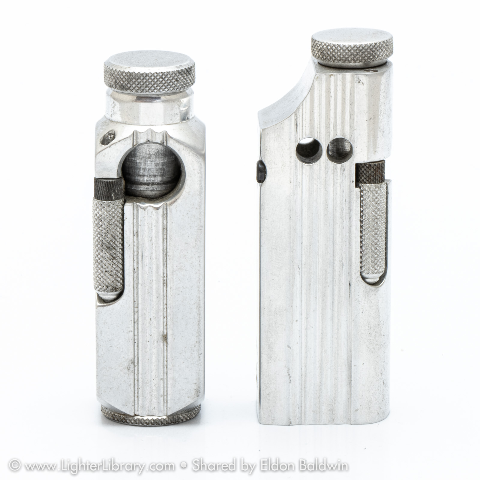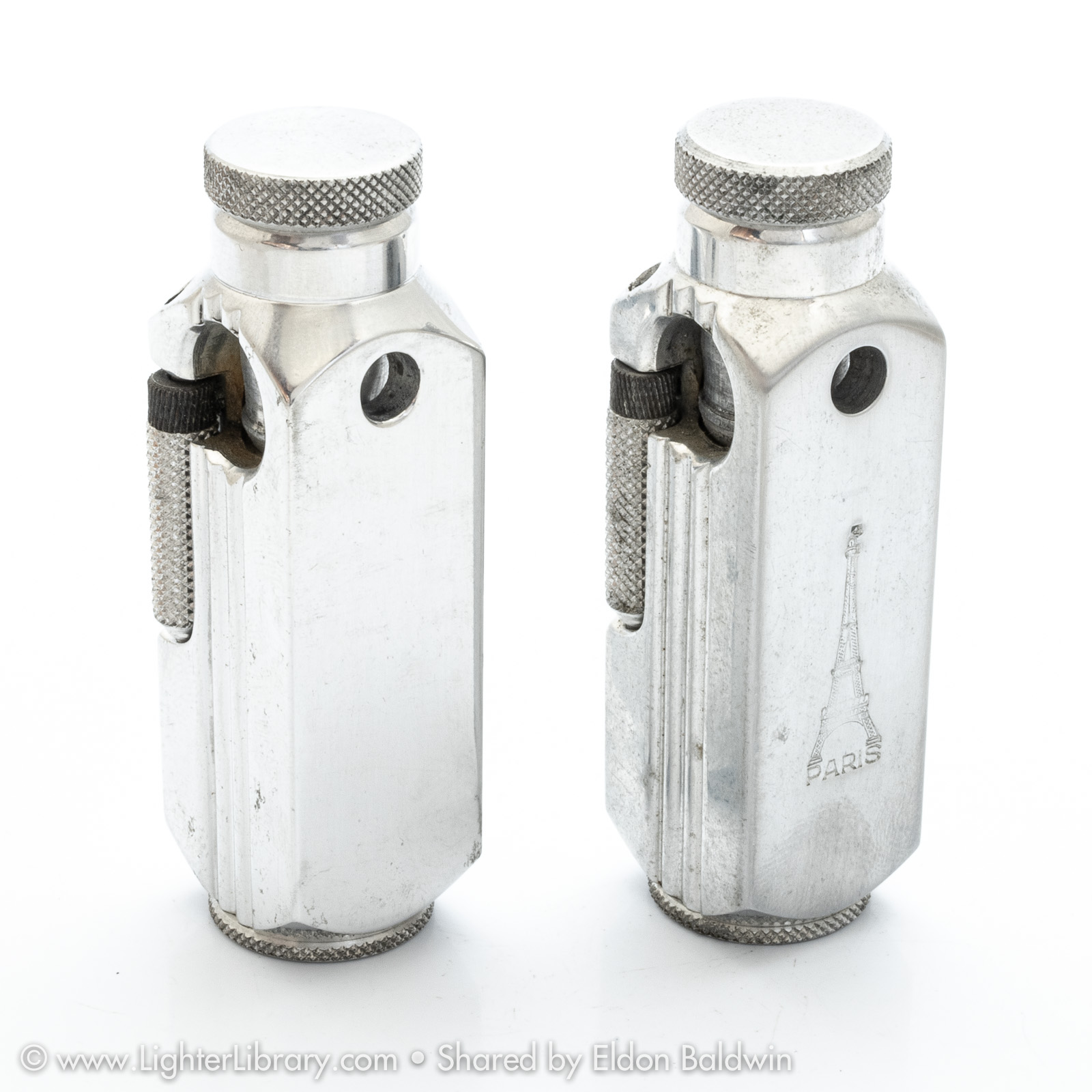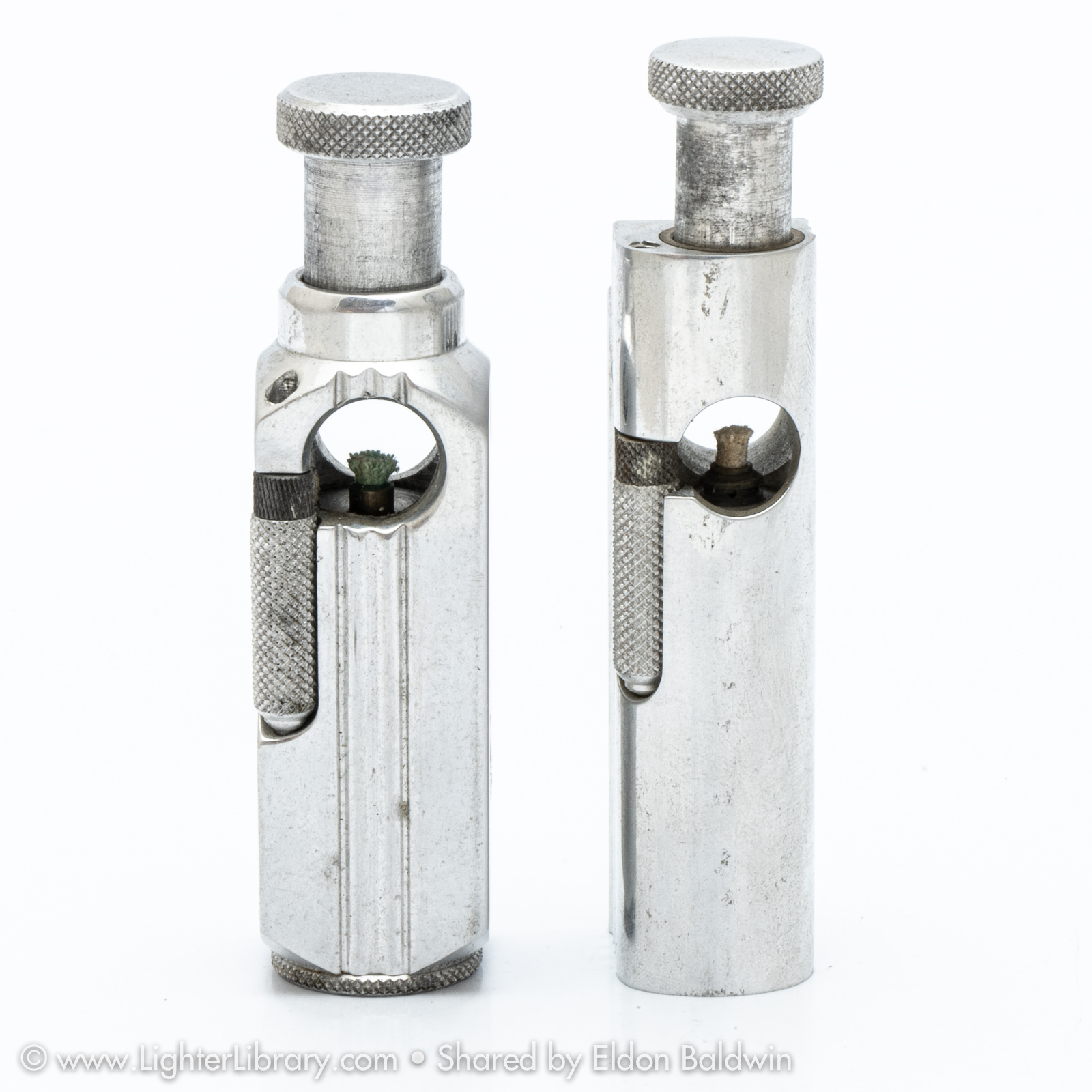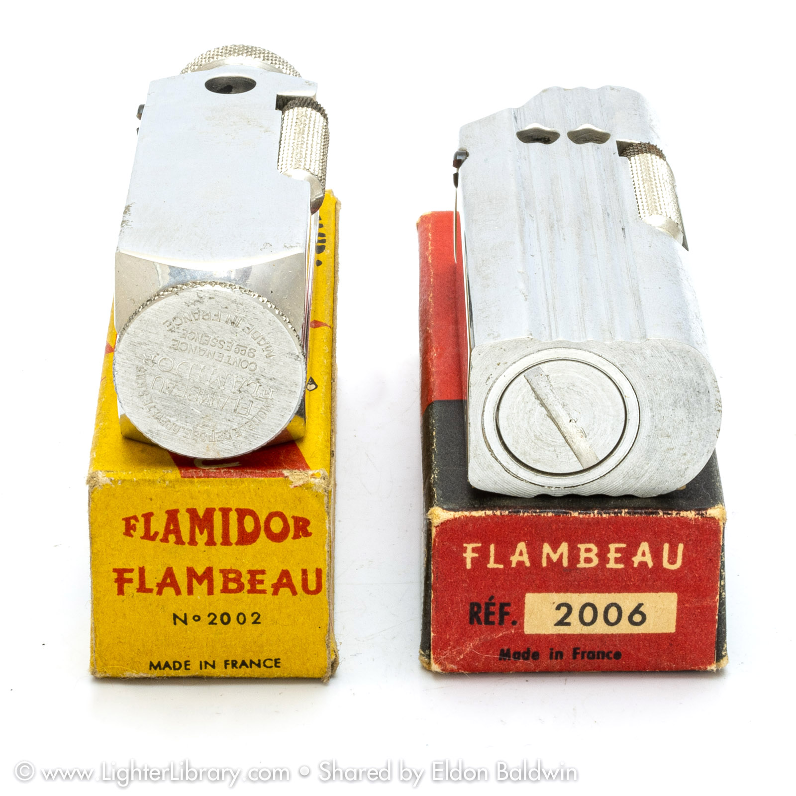 Patented in 1948, at least two versions of the Flambeau were produced. Very similar to the patent drawing, no.2002 is the most commonly seen Flambeau model. Model no.2006 features an asymmetric body shape but functions similarly. An unbranded and undocumented miniature version was also produced featuring a hexagonal body shape. Whether this mini Flambeau is an authentic Flamidor model or a copy. (EB)