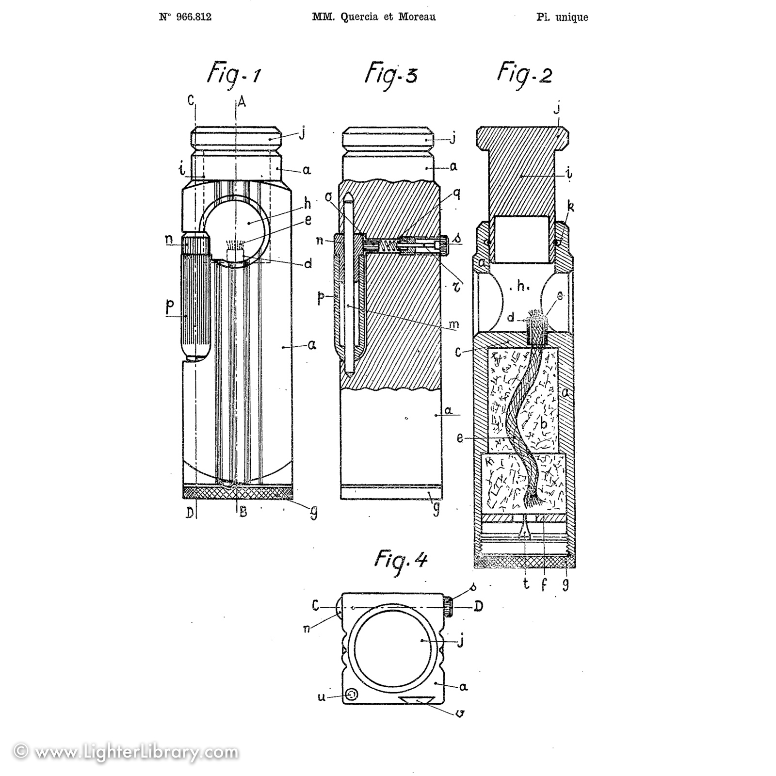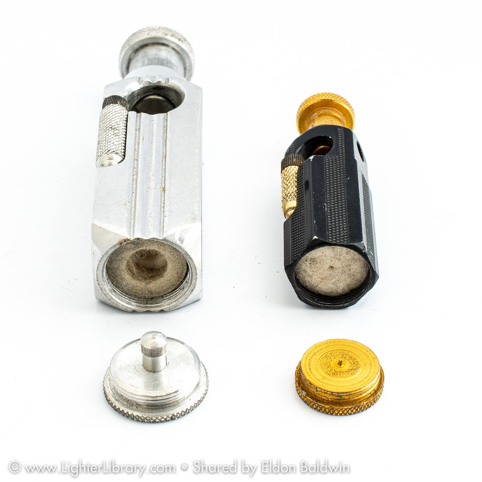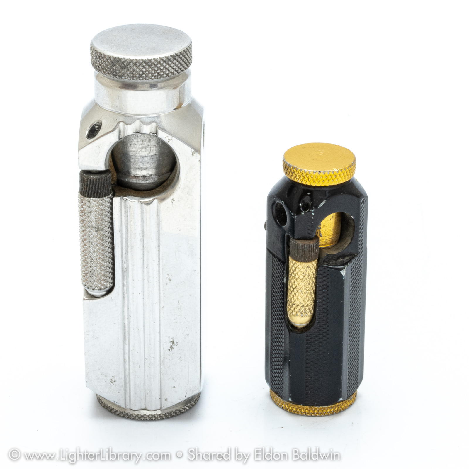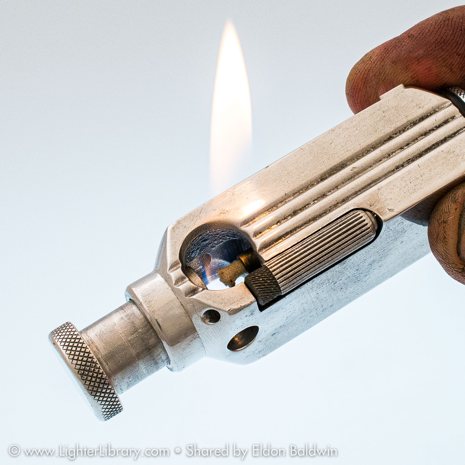 Patented in 1948, at least two versions of the Flambeau were produced. Very similar to the patent drawing, no.2002 is the most commonly seen Flambeau model. Model no.2006 features an asymmetric body shape but functions similarly. An unbranded and undocumented miniature version was also produced featuring a hexagonal body shape. Whether this mini Flambeau is an authentic Flamidor model or a copy. (EB)