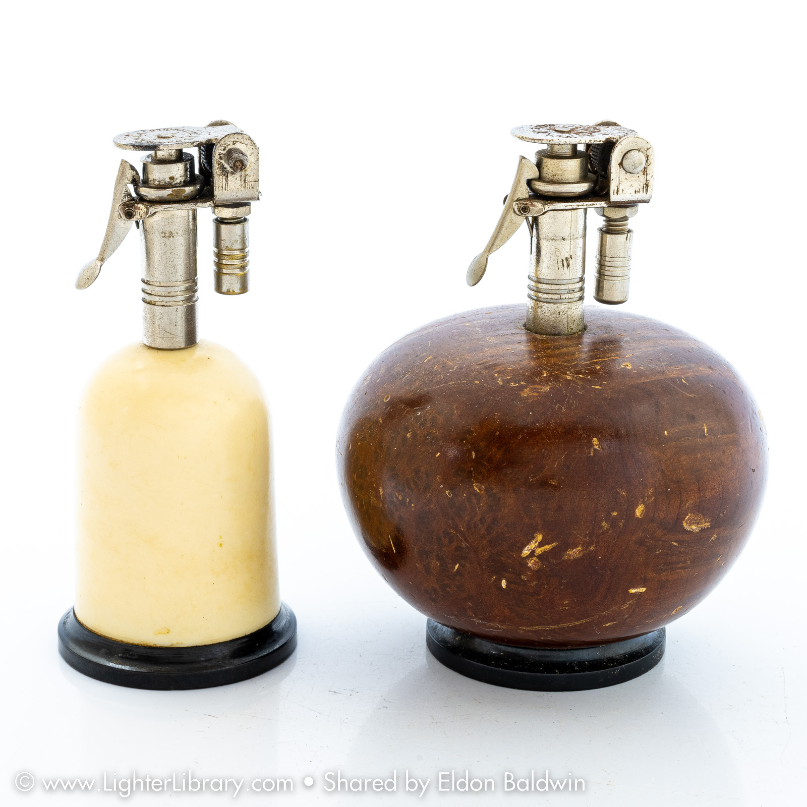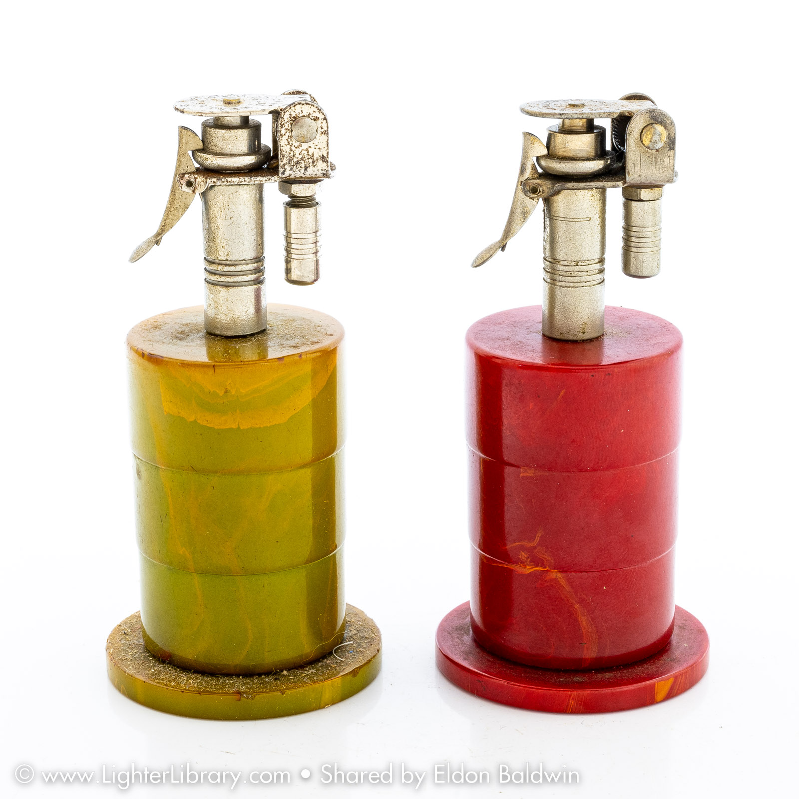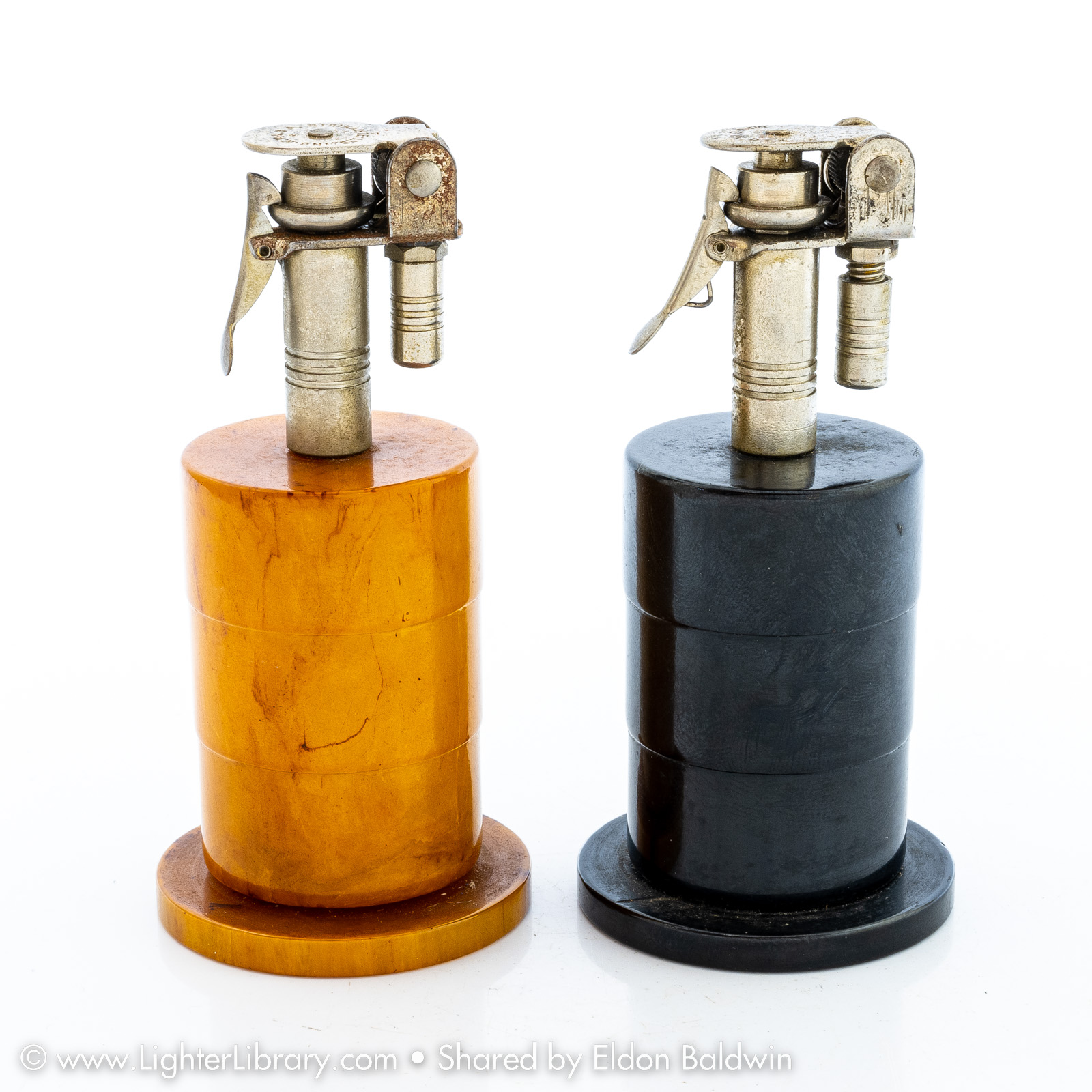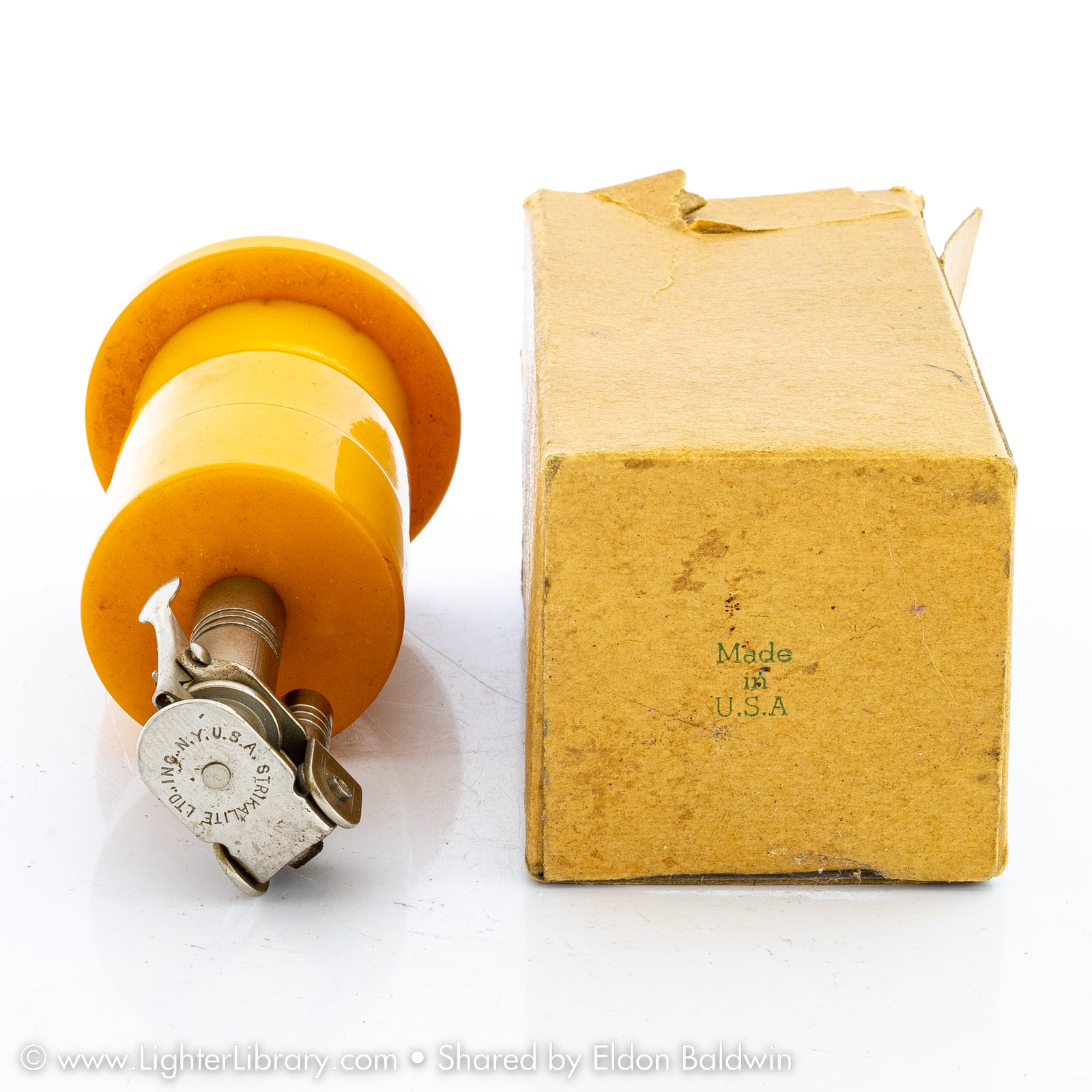 Strikalite semi automatic table lighters are copies of the Quercia Éclair manufactured in the United States from the mid-1930s until the early 1940s. Most commonly seen with bakelite and catalin finishes, glass and wood cased options were also offered. (EB)