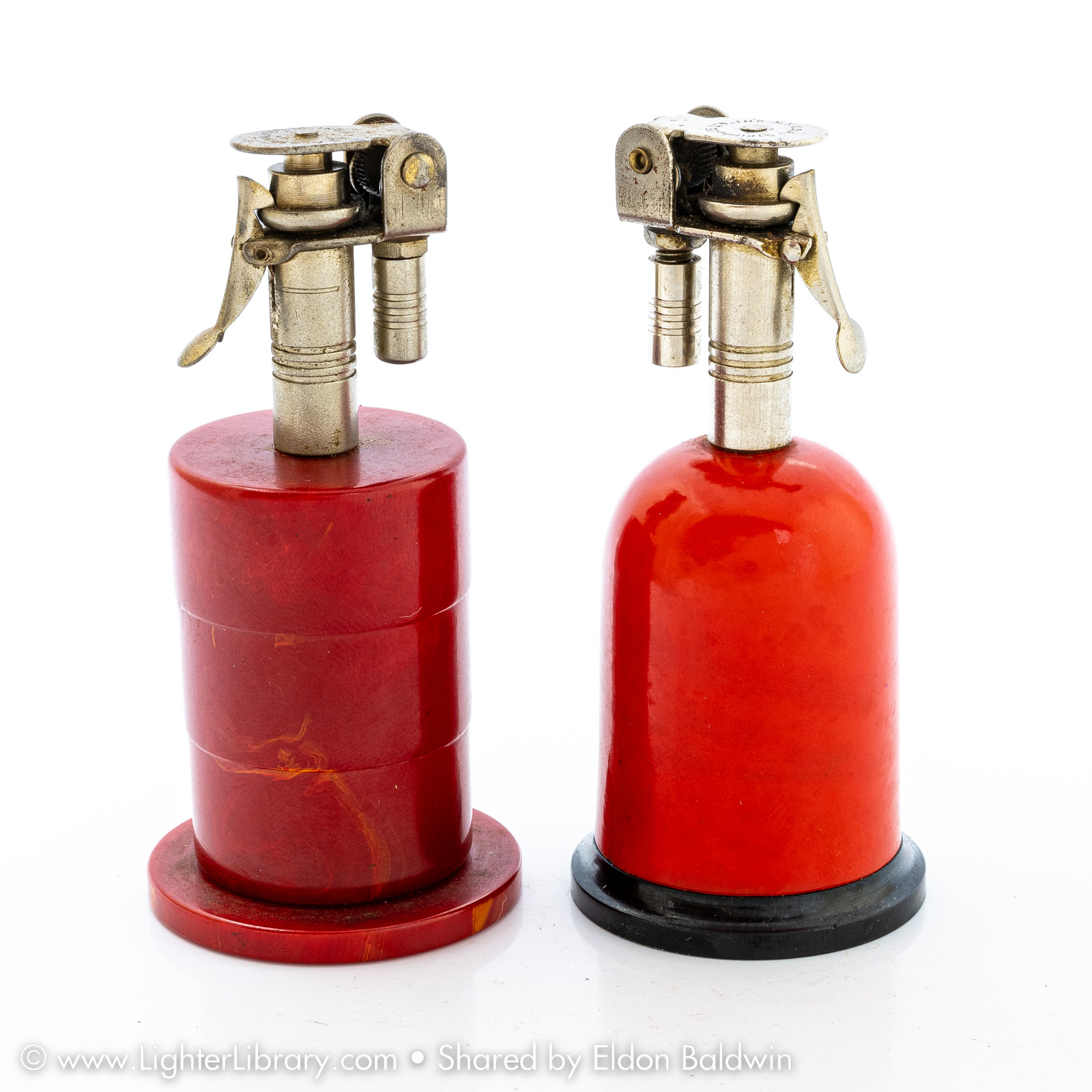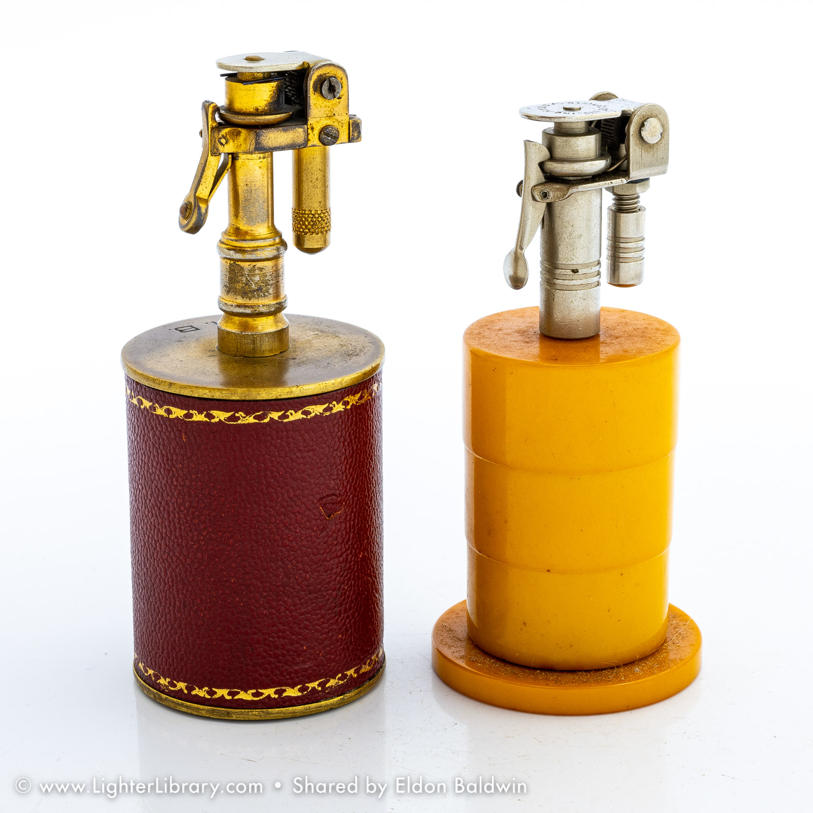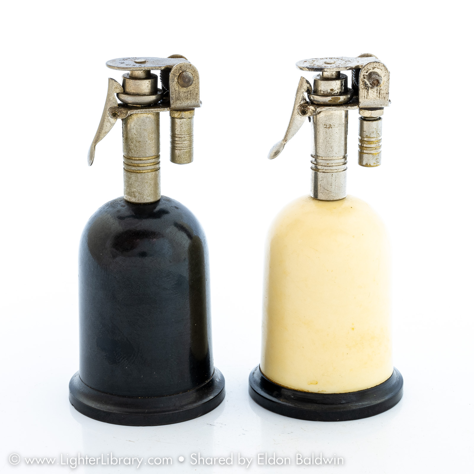 Strikalite semi automatic table lighters are copies of the Quercia Éclair manufactured in the United States from the mid-1930s until the early 1940s. Most commonly seen with bakelite and catalin finishes, glass and wood cased options were also offered. (EB)