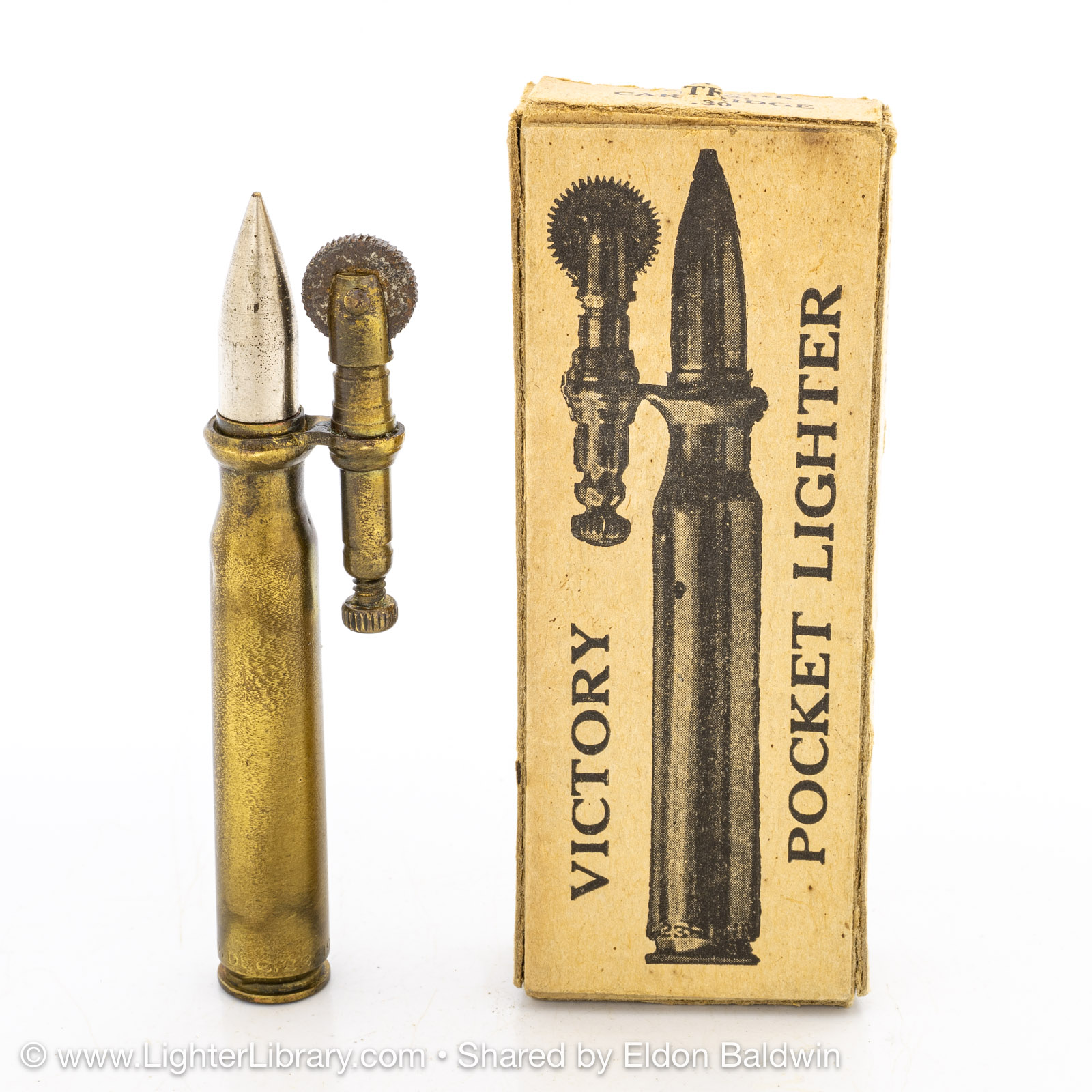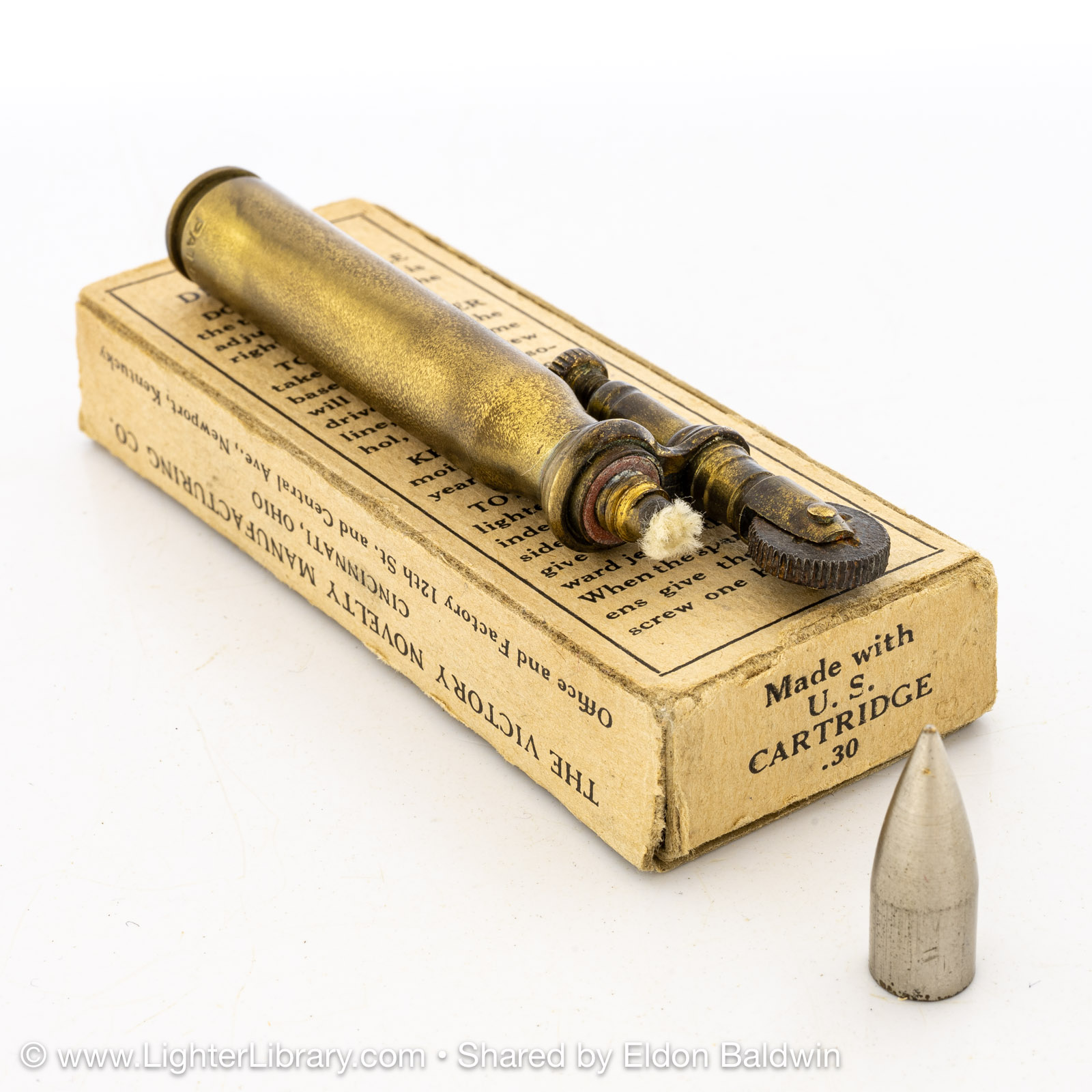 Manufactured using authentic .30 U.S. brass cartridge shells after World War 1, the Victory Pocket Lighter was patented by Maurice Ginsburg in 1919. Often misidentified as trench art or trench lighters, these lighters were manufactured in Newport, Kentucky. (EB)