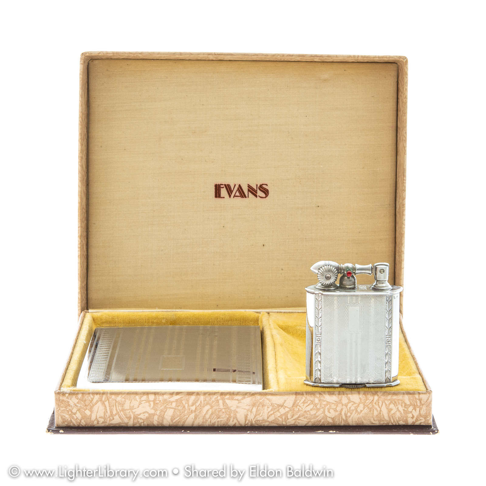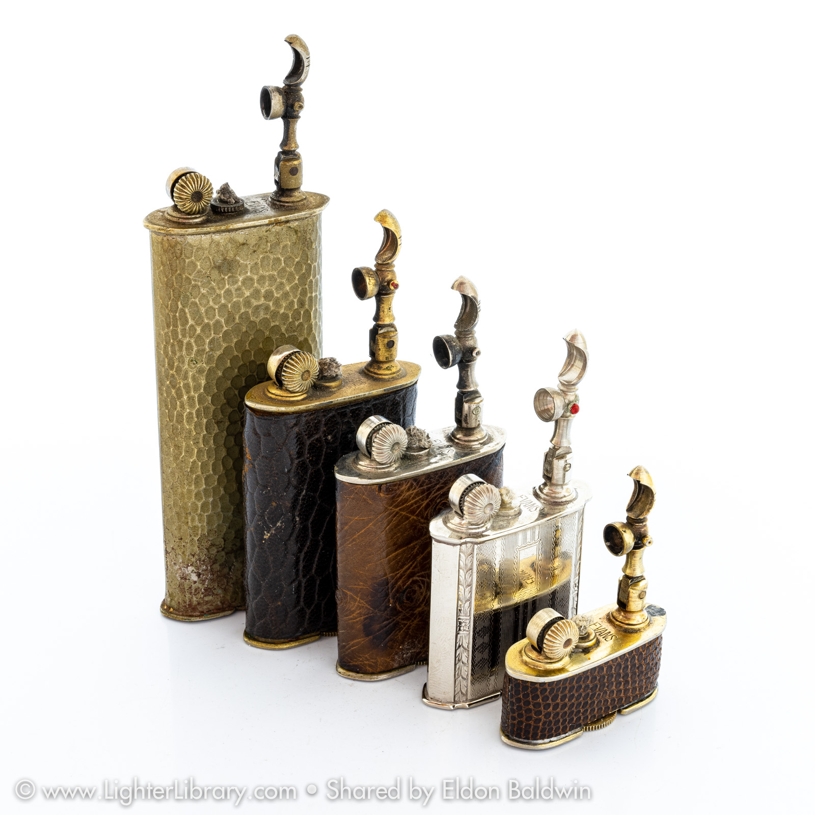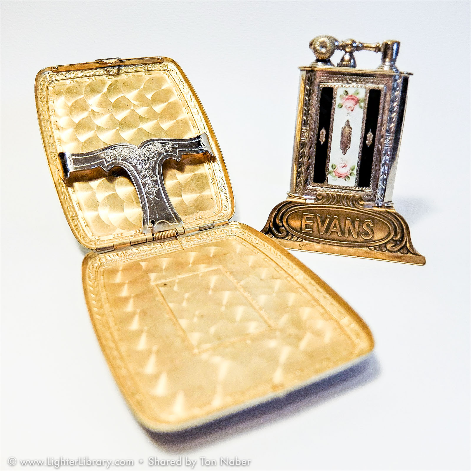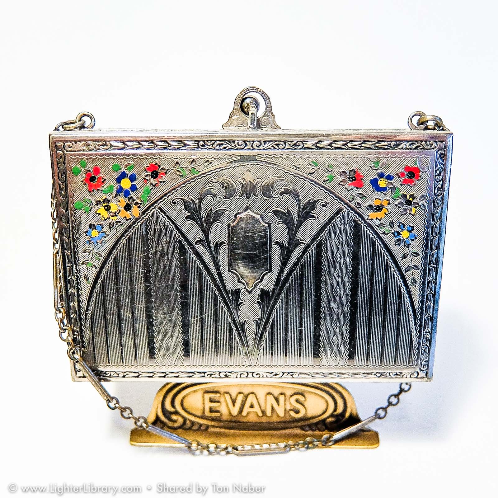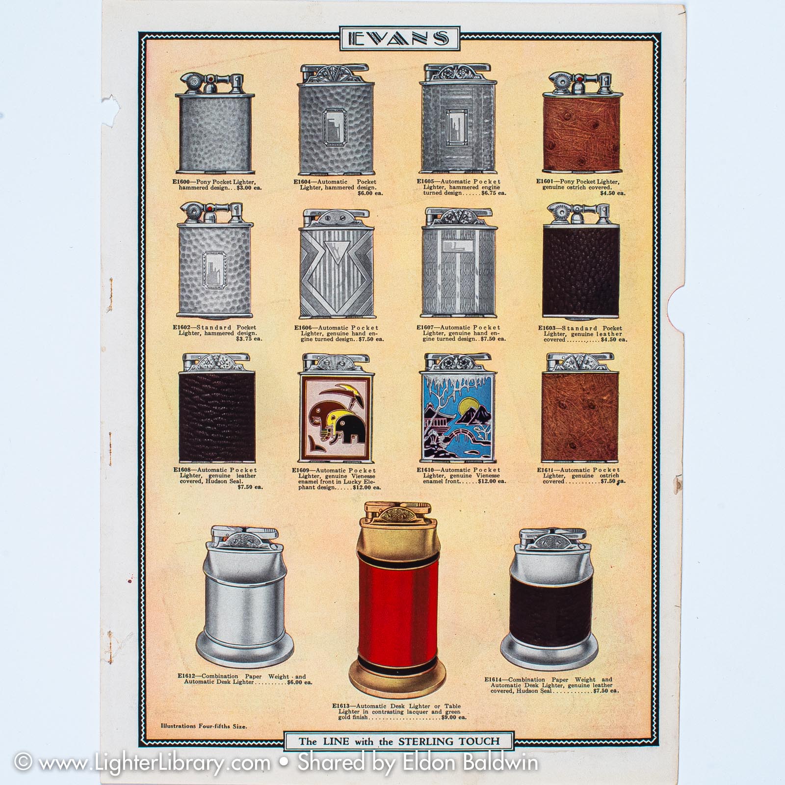 Patented in 1927, these earliest models were simply named the Evans Lighter. This type of manual lighter is described as a 'single bar lift arm' and collectors usually refer to these first models as 'Evans lift arms', distincting them from other lighters Evans sold in later years using the same name. i.e. Evans Lift Arm is not a proper name used by the manufacturer but it's a helpful nickname to prevent confusion when discussing this brand. This page gives a general overview of available information (dates, models, sizes, etc.) but you must visit Terry Post's amazing collection of these Evans Lighters to fully appreciate the stunning finishes that were produced. (EB)