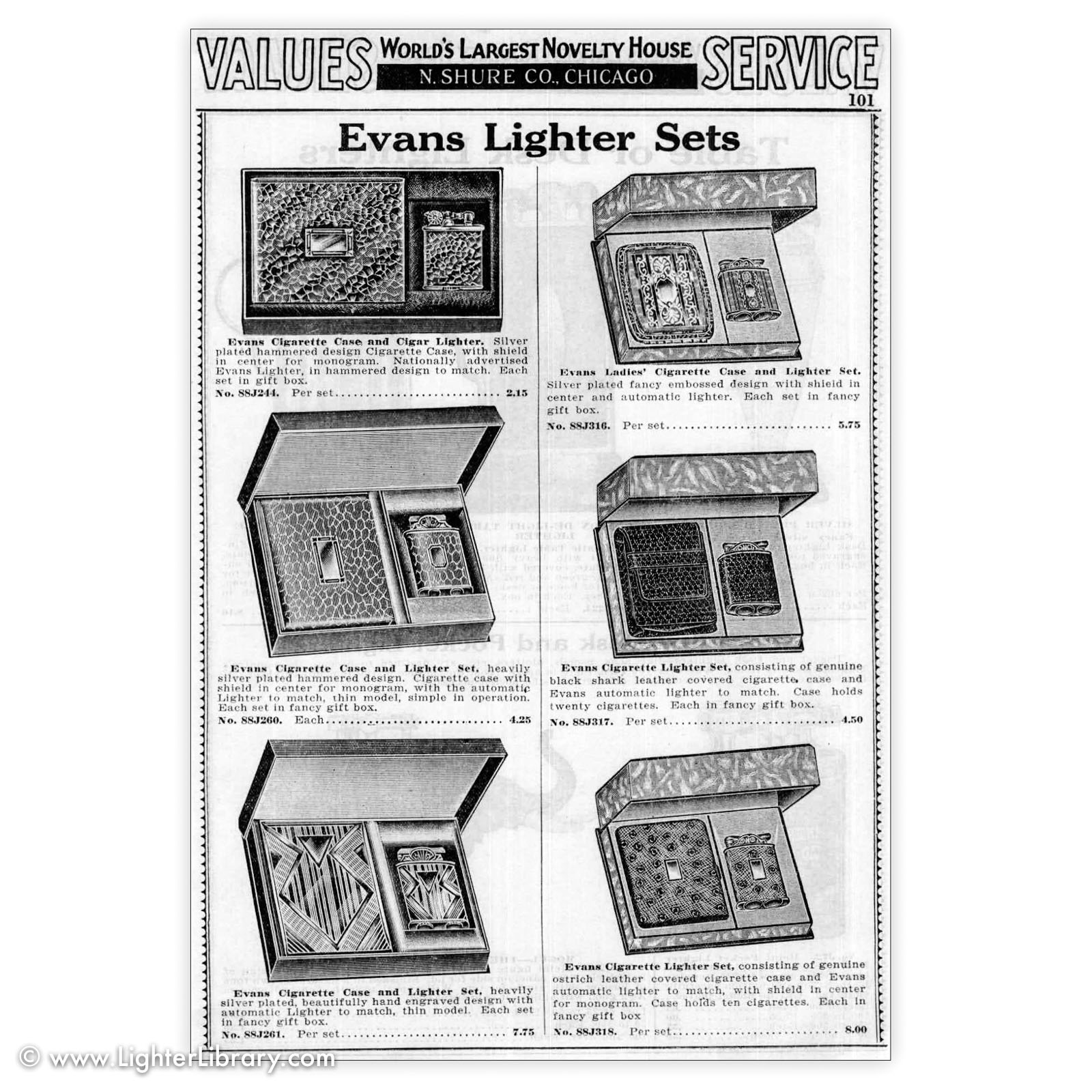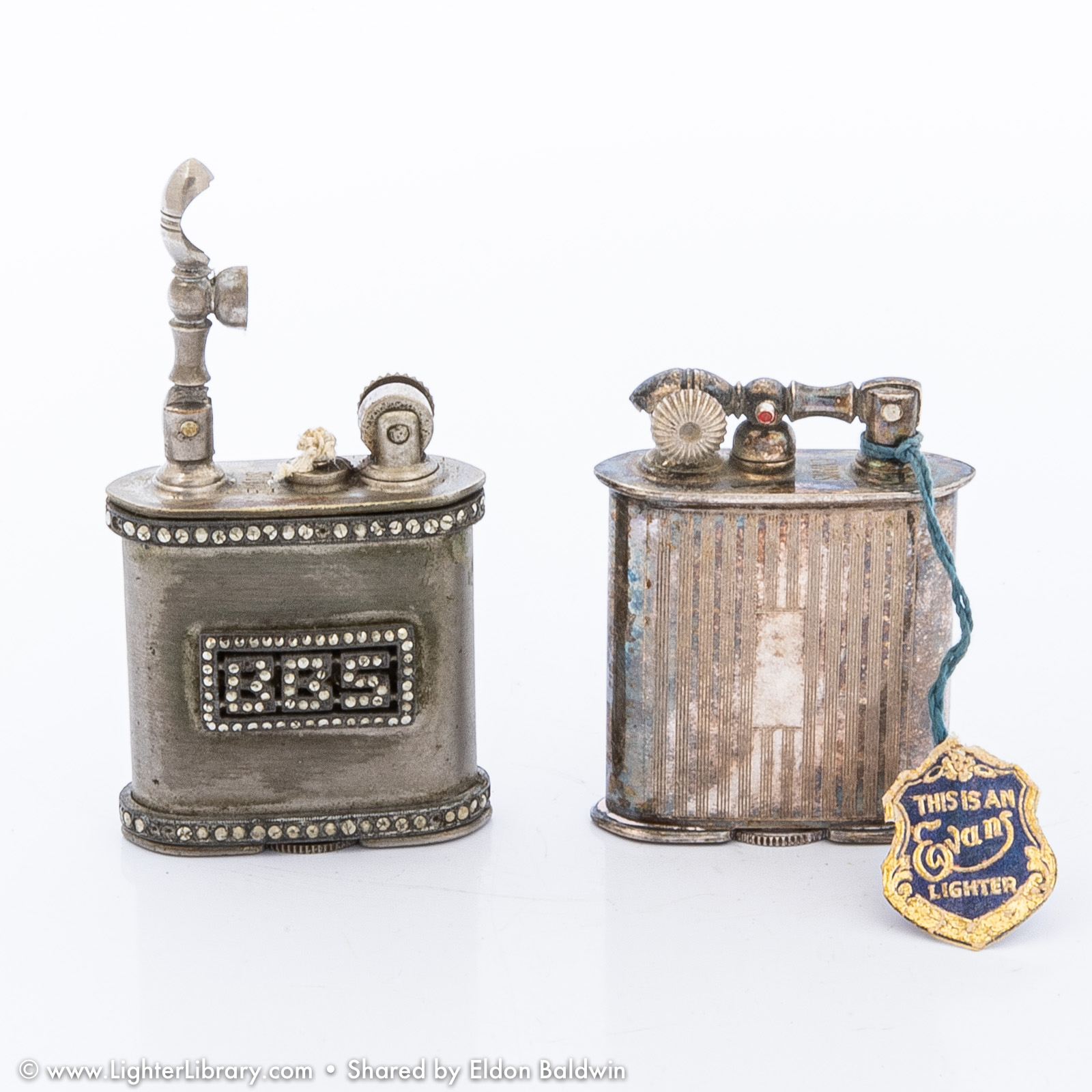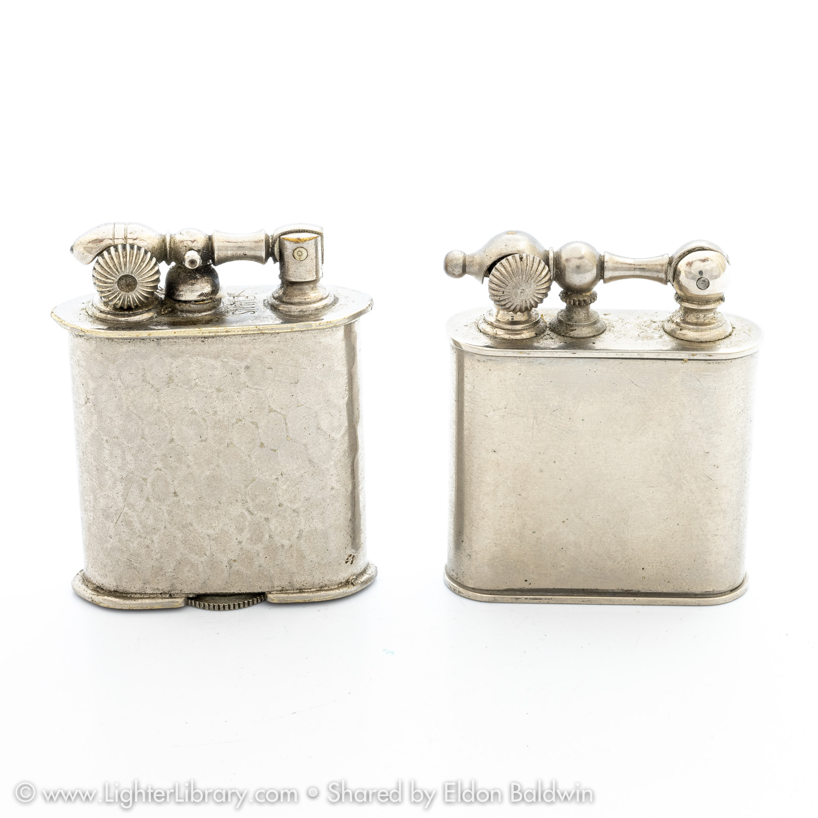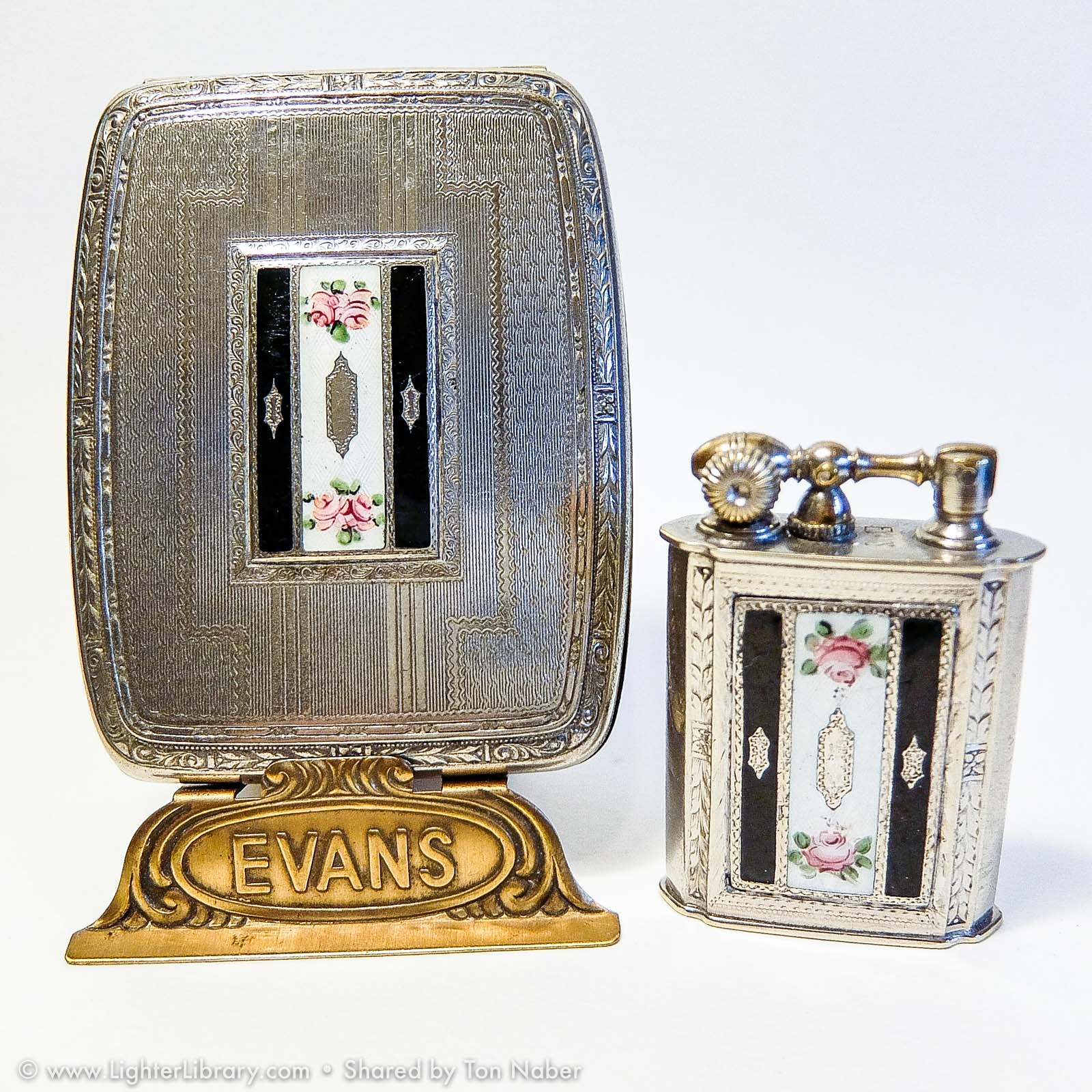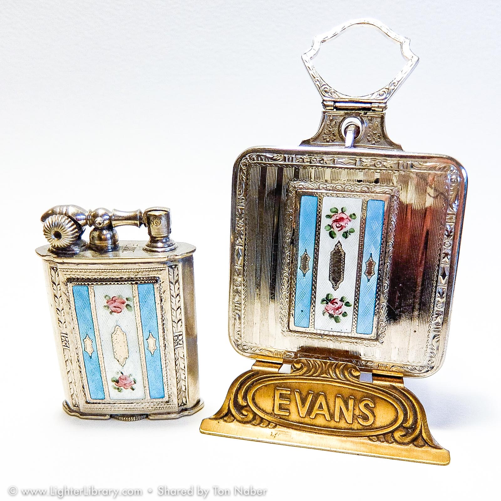 Patented in 1927, these earliest models were simply named the Evans Lighter. This type of manual lighter is described as a 'single bar lift arm' and collectors usually refer to these first models as 'Evans lift arms', distincting them from other lighters Evans sold in later years using the same name. i.e. Evans Lift Arm is not a proper name used by the manufacturer but it's a helpful nickname to prevent confusion when discussing this brand. This page gives a general overview of available information (dates, models, sizes, etc.) but you must visit Terry Post's amazing collection of these Evans Lighters to fully appreciate the stunning finishes that were produced. (EB)