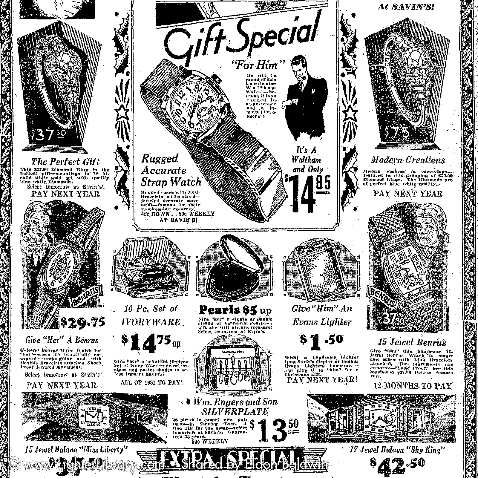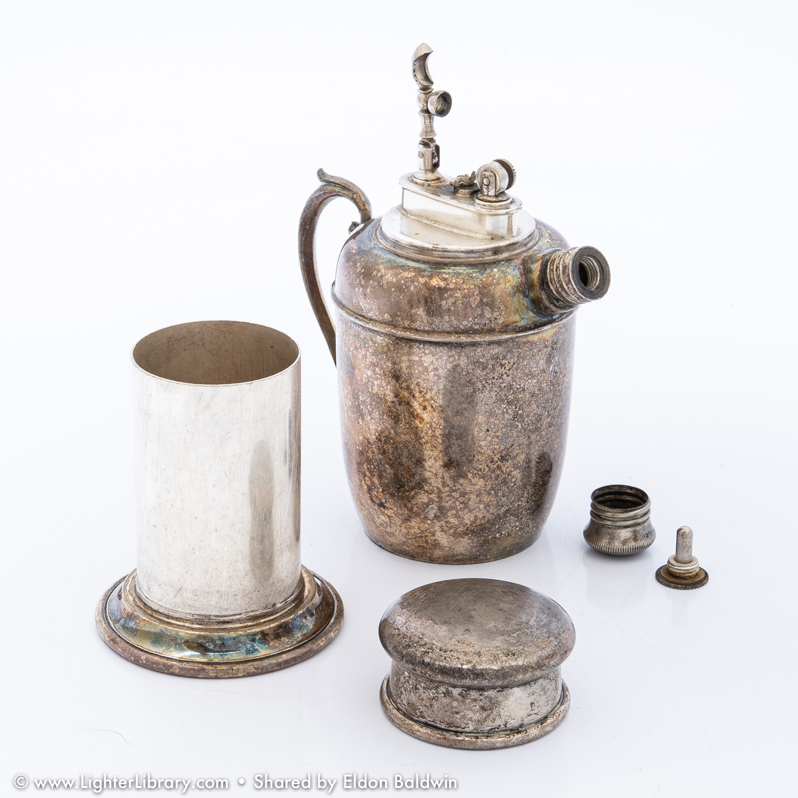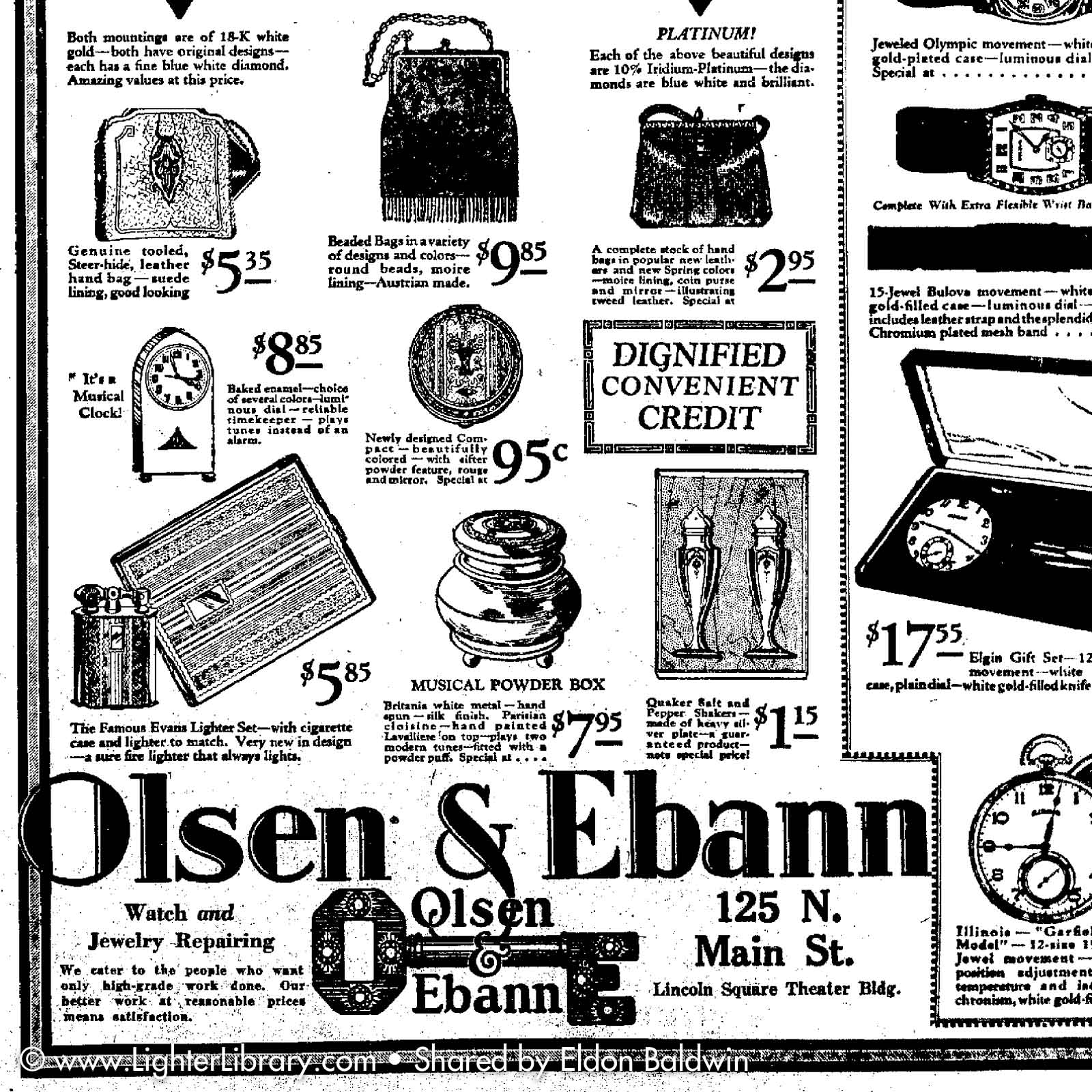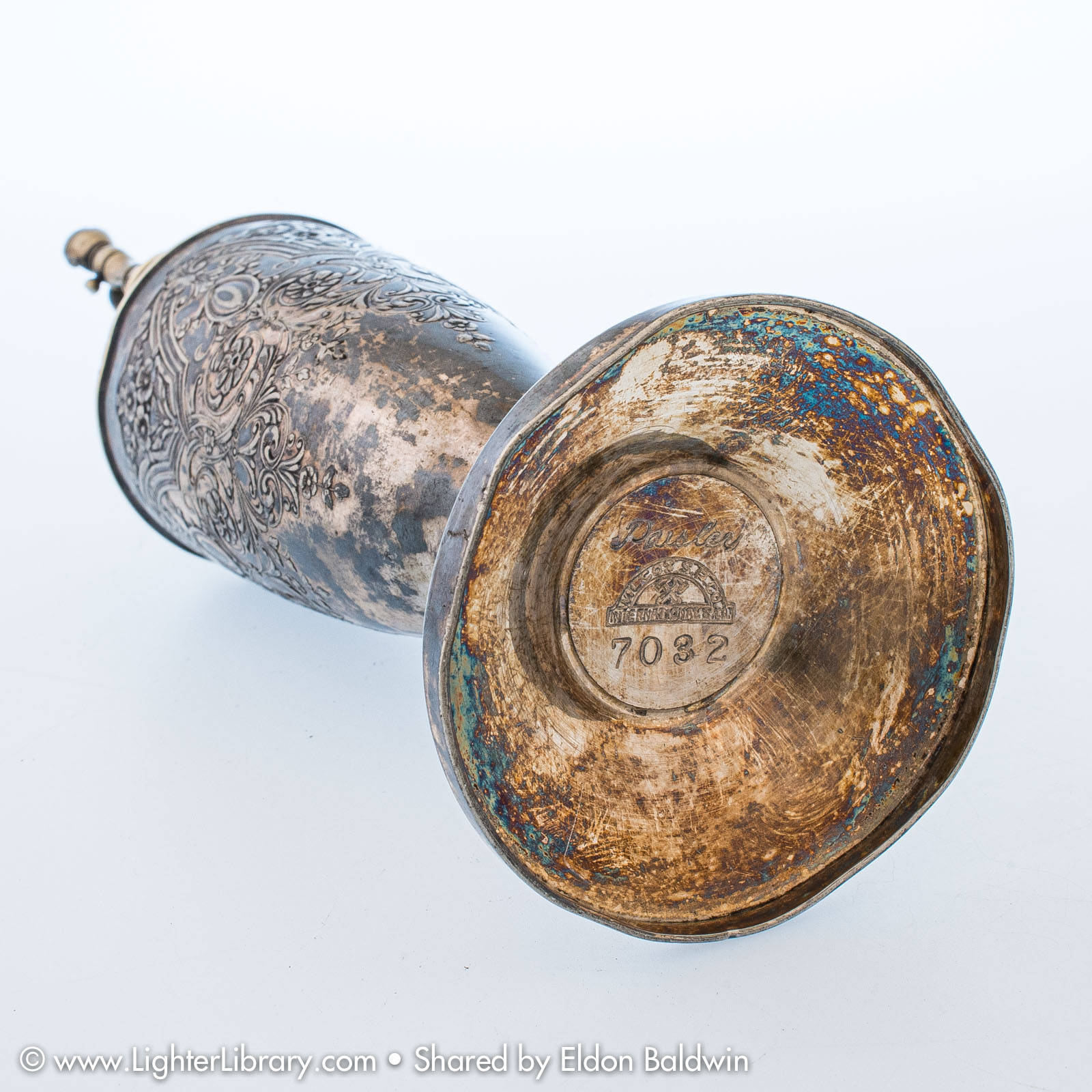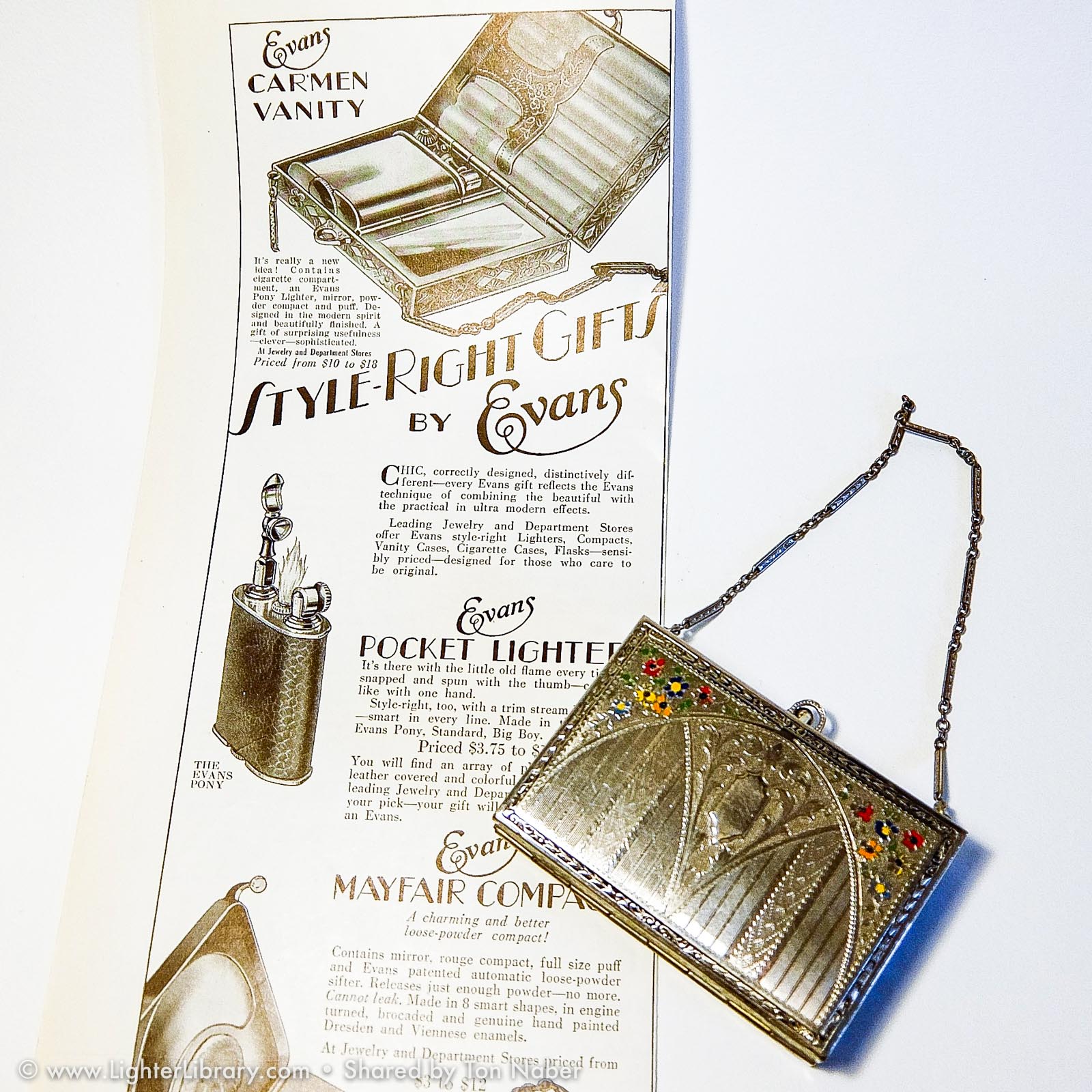Patented in 1927, these earliest models were simply named the Evans Lighter. This type of manual lighter is described as a 'single bar lift arm' and collectors usually refer to these first models as 'Evans lift arms', distincting them from other lighters Evans sold in later years using the same name. i.e. Evans Lift Arm is not a proper name used by the manufacturer but it's a helpful nickname to prevent confusion when discussing this brand. This page gives a general overview of available information (dates, models, sizes, etc.) but you must visit Terry Post's amazing collection of these Evans Lighters to fully appreciate the stunning finishes that were produced. (EB)