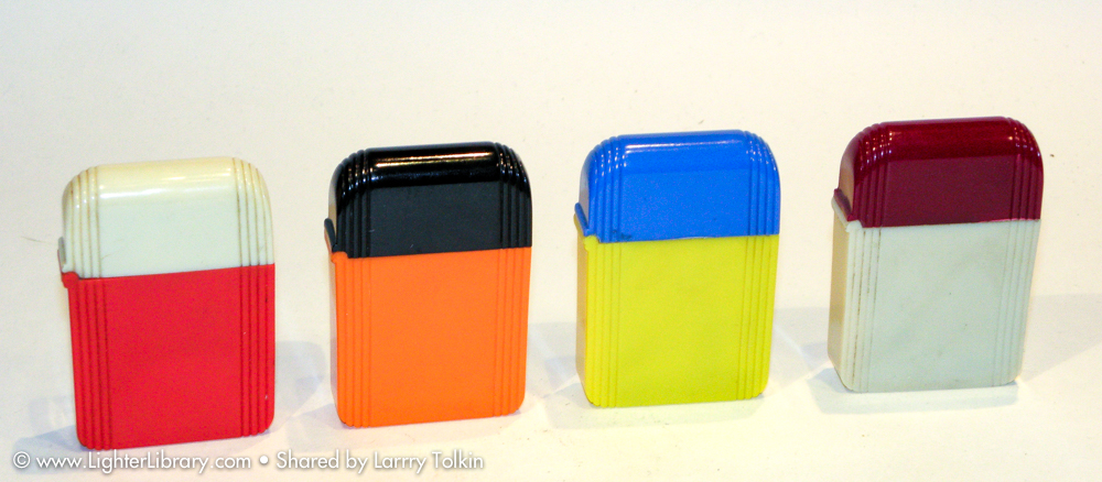 The “Helios” case was first designed by Joseph Federico in 1938 and patented in 1939. The “helios” utilized an unusual pinless internal hinge rather than external or internal pinned hinge. The unusual circular arc hinge was invented by the Merrill Rathbun company in 1931. Rathbun manufactured plastic boxes utilizing the hinges. Some “helios” lighters are marked with the Rathbun patent number inside the case. The lighter cases were made in Salamaca, New York of colorful molded beetle plastic resin. Beetle is a plastic product with similar properties to bakelite so calling the “helios” bakelite is a-ok. Beetle resin was manufactured by the American Cyanamid Corporation and was also used to make radios – dinnerware – ping pong balls – and many other consumer items or as trim.