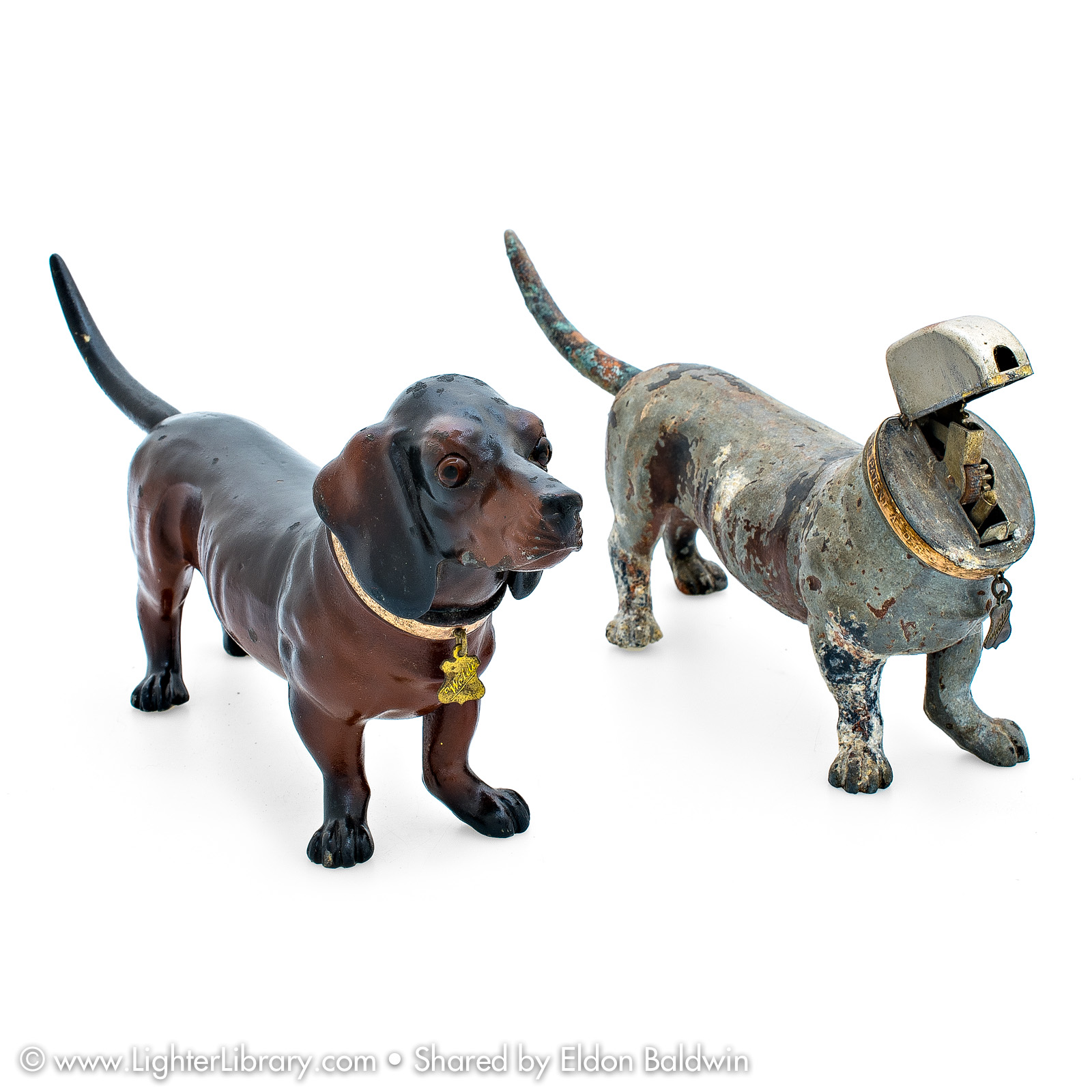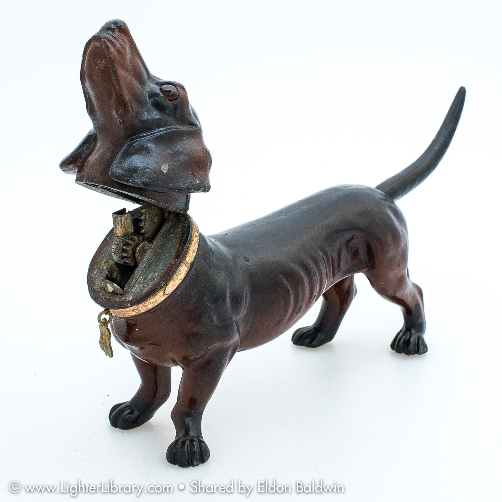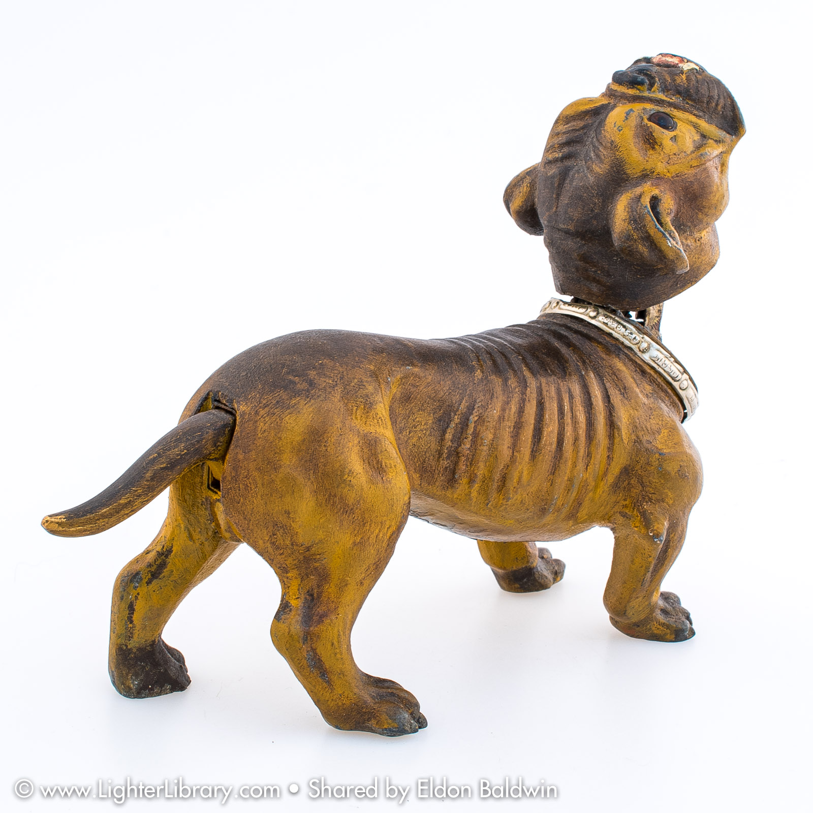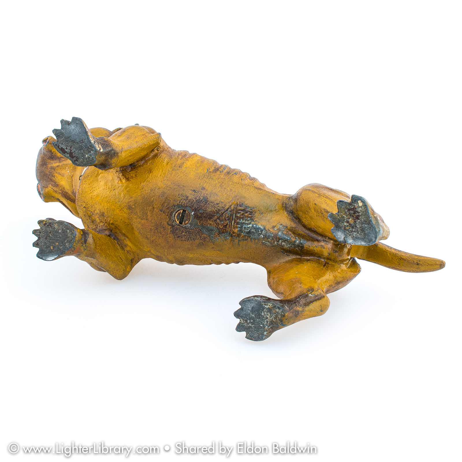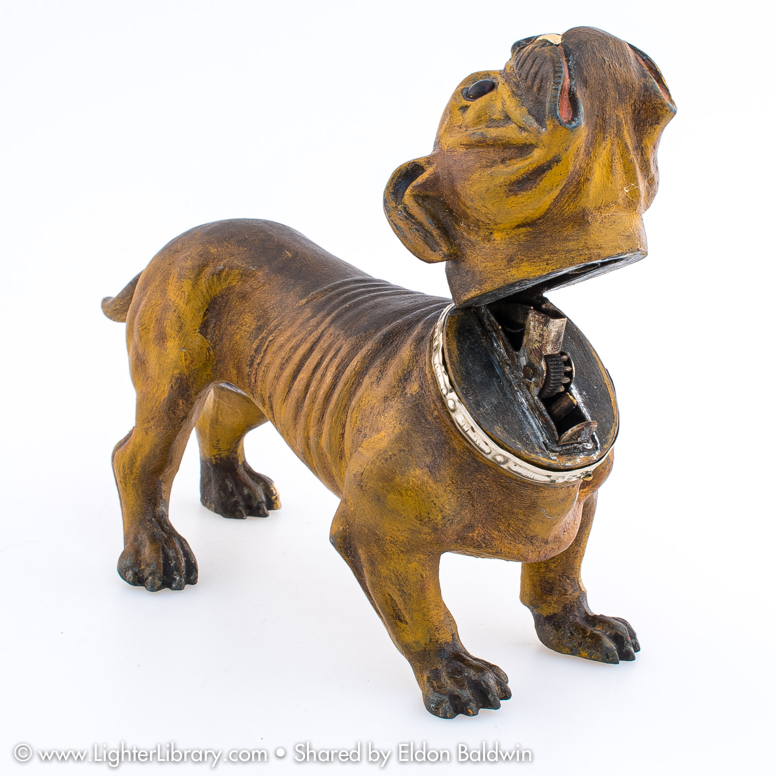 Patented before World War 1, these beautiful figural Imperator-type table lighters were manufactured in Vienna by Sigmund Haas. The semi-automatic mechanism is triggered by pushing the dog's tail downward. Each dog originally had a tag on it's collar that gave its name and is marked with the Haas logo (a rabbit inside a triangle) on its belly.