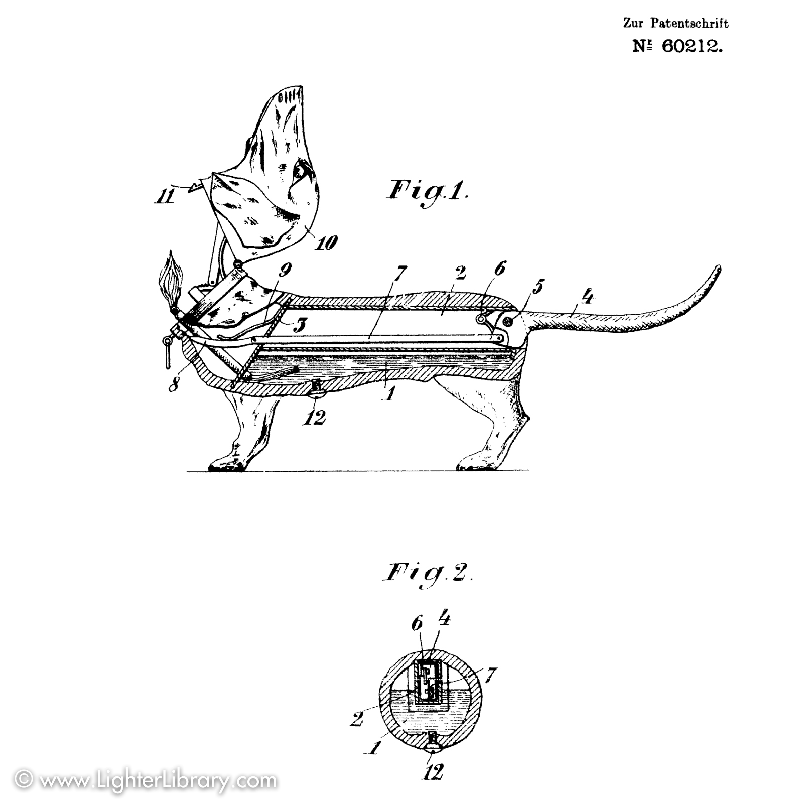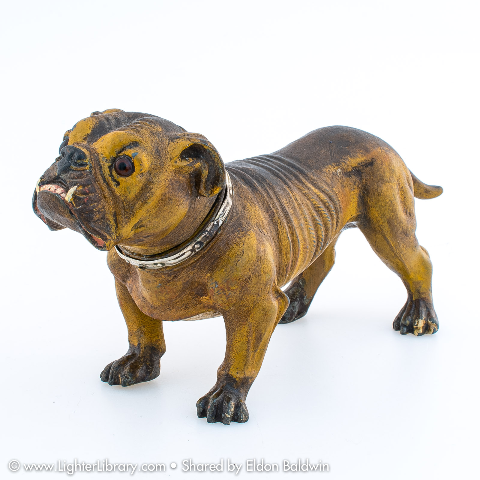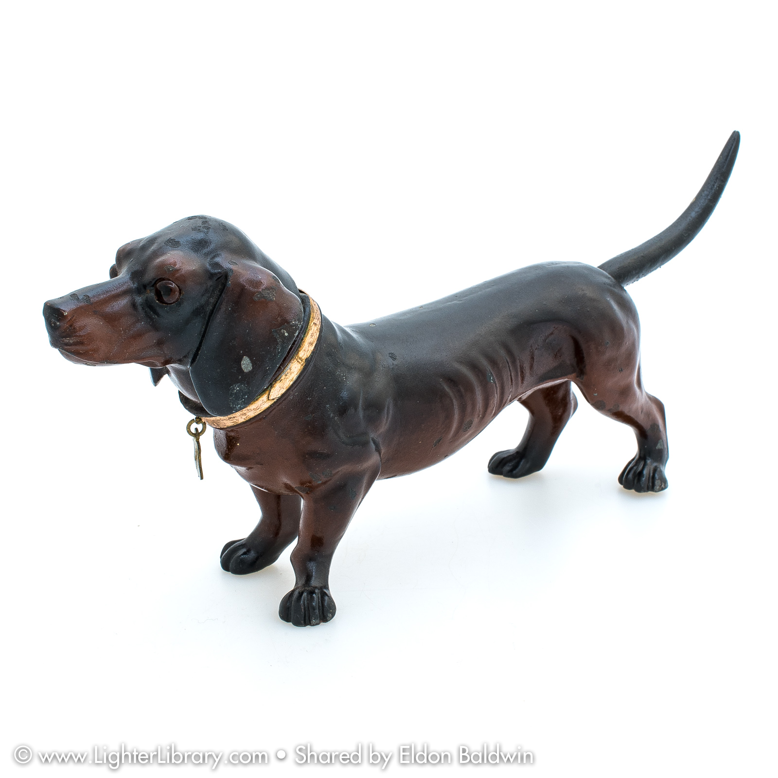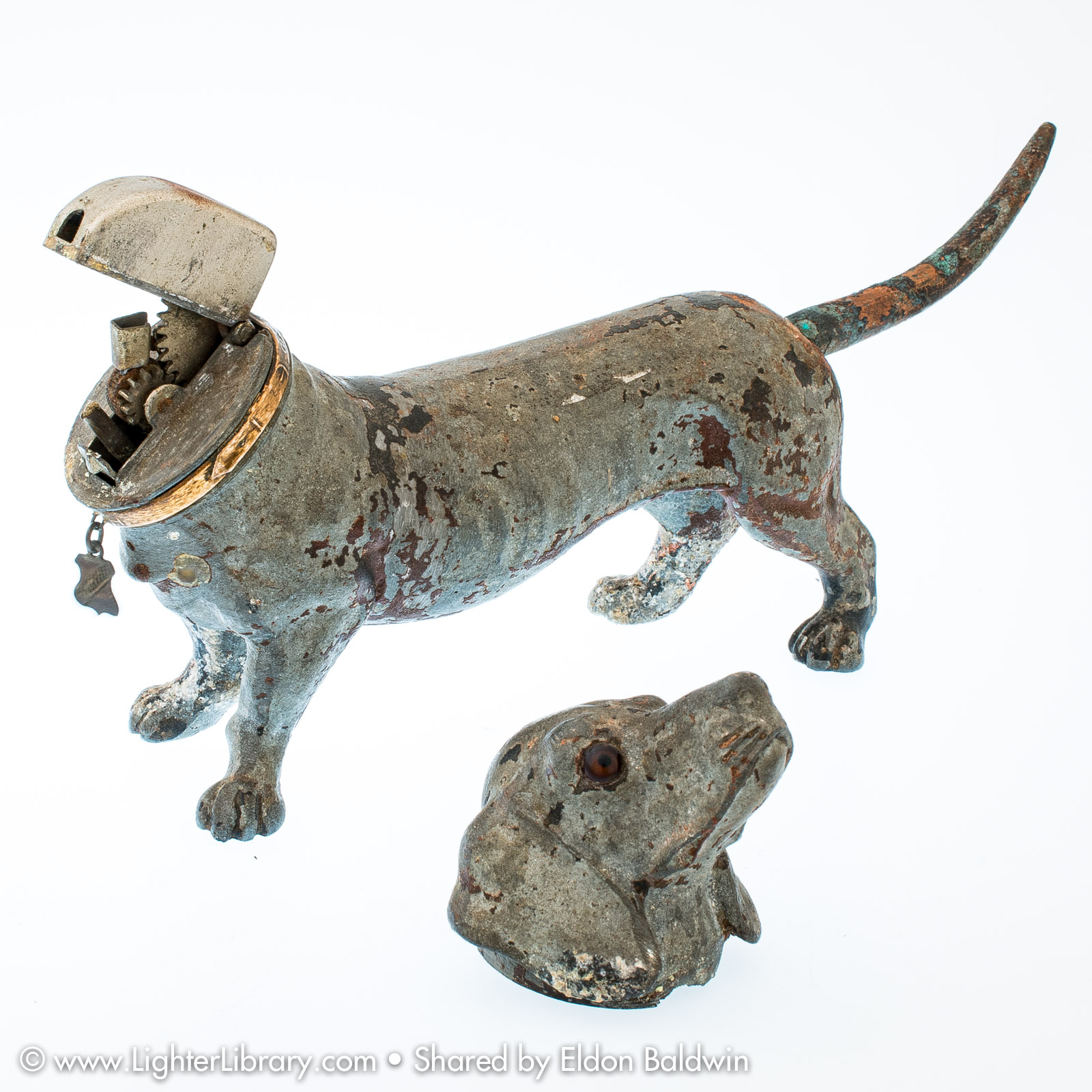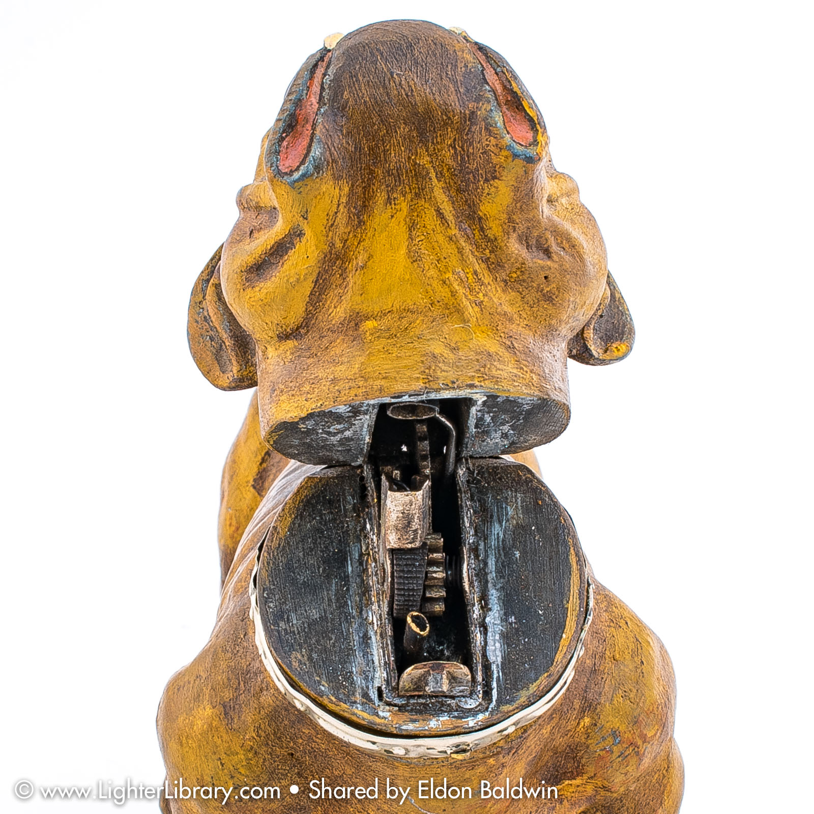 Patented before World War 1, these beautiful figural Imperator-type table lighters were manufactured in Vienna by Sigmund Haas. The semi-automatic mechanism is triggered by pushing the dog's tail downward. Each dog originally had a tag on it's collar that gave its name and is marked with the Haas logo (a rabbit inside a triangle) on its belly.